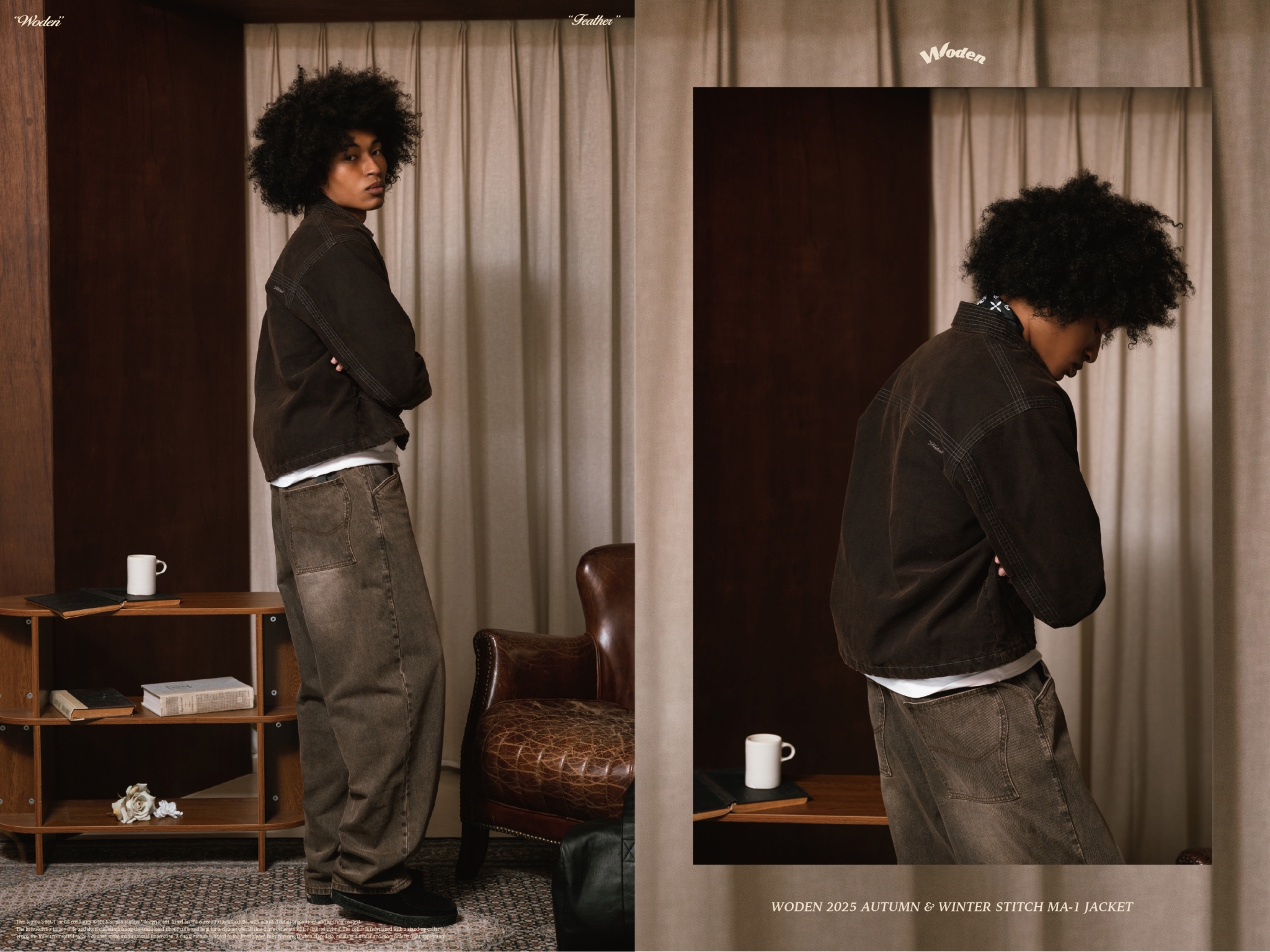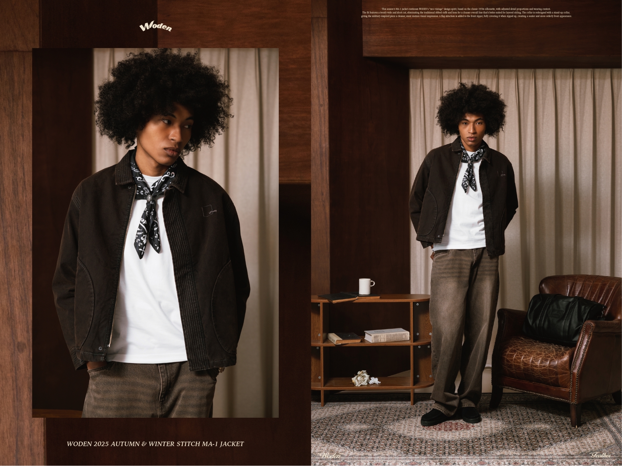 本季 MA-1 夾克延續 WODEN「新古著」設計精神,以 1950 年代經典輪廓為基礎,重新調整細節比例與穿著語境。版型採用近年流行的寬短設定,並取消傳統袖口與下擺羅紋配置,使整體線條更俐落,也更利於多層次穿搭。領口改以領子設計呈現,為軍事基調注入更乾淨、成熟的視覺印象。開襟拉鍊處加入擋片結構,拉鍊合起時可完整遮擋,讓正面視覺更加簡潔有序。
