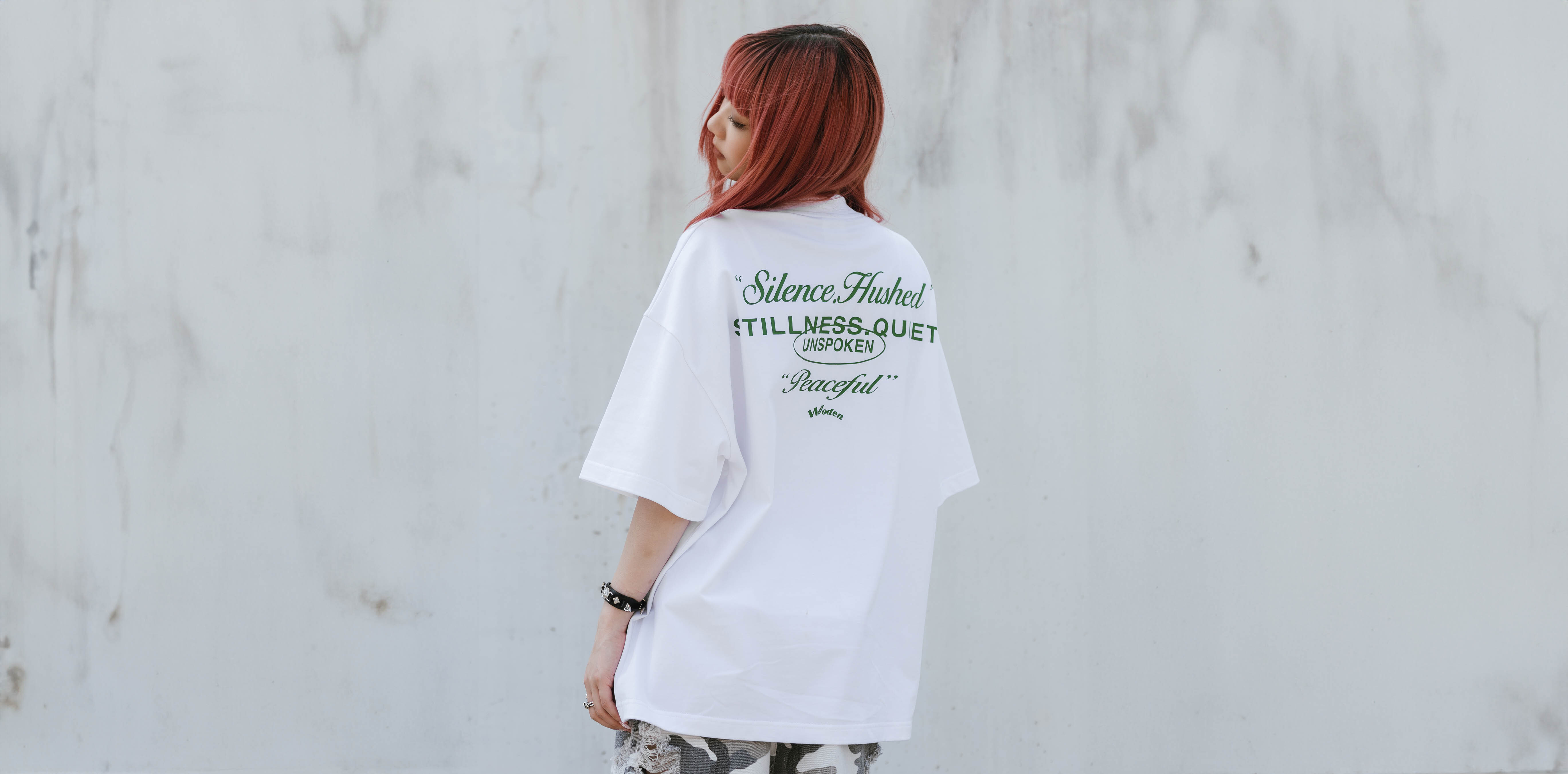 本次設計以T-shirt作為載體,詮釋「沉默是金」的處世智慧。整體以純文字排版設計為主,正面左右胸口分別印有「Stillness.Quiet」與「Silence.Hushed」字樣,透過不同字型的變化搭配WODEN LOGO,增添視覺層次與辨識度。背面則以大面積文字設計呈現,將前側語彙重新排列組合,形成回應與呼應,最後以「Peaceful」作結,象徵沉默能帶來平和,避免不必要的誤解與衝突。