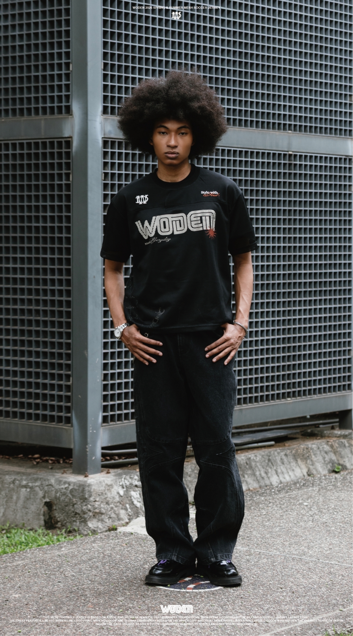 本次網洞足球衫以修飾比例的寬短版輪廓為基礎,細節延續經典足球衫排版邏輯。胸前配置 WODEN 復古線條 LOGO 印花,上方左右分別加入 WD LOGO 與標語刺繡,透過標誌堆疊,強化整體層次感。背面領下則點綴羽毛圖騰刺繡,低調提升品牌辨識度。