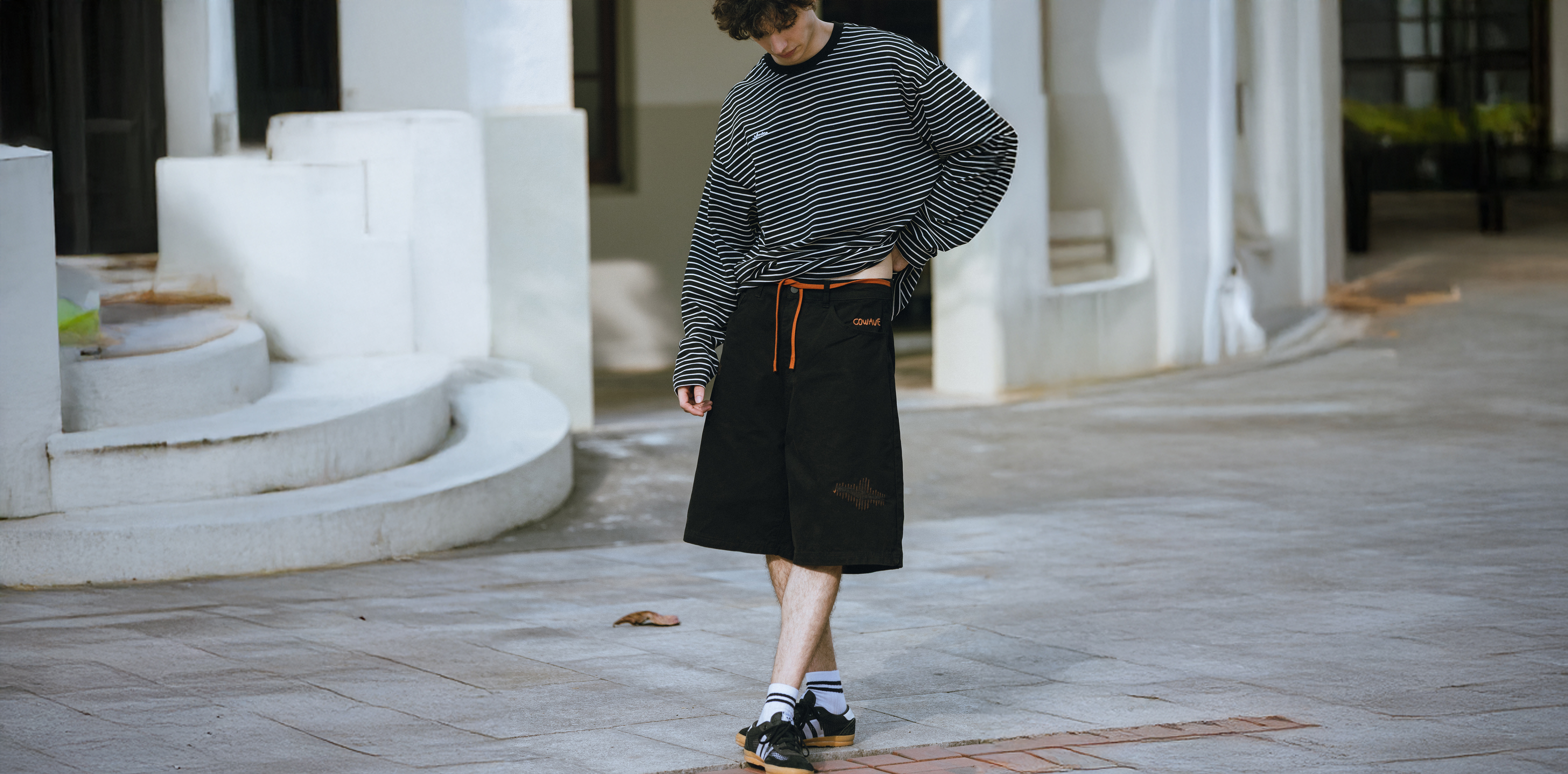 本次 WODEN 攜手 COWAVE 共同設計,將工作五分褲輪廓結合品牌擅長的「新古著」語彙,於褲身注入局部不規則破壞細節,並以『繡補工藝』重新填補修復。選用橘色手縫繡線作為視覺亮點,搭配輕酵洗水處理,使整體呈現自然且富有層次的質感變化,在破壞與修復之間取得平衡。