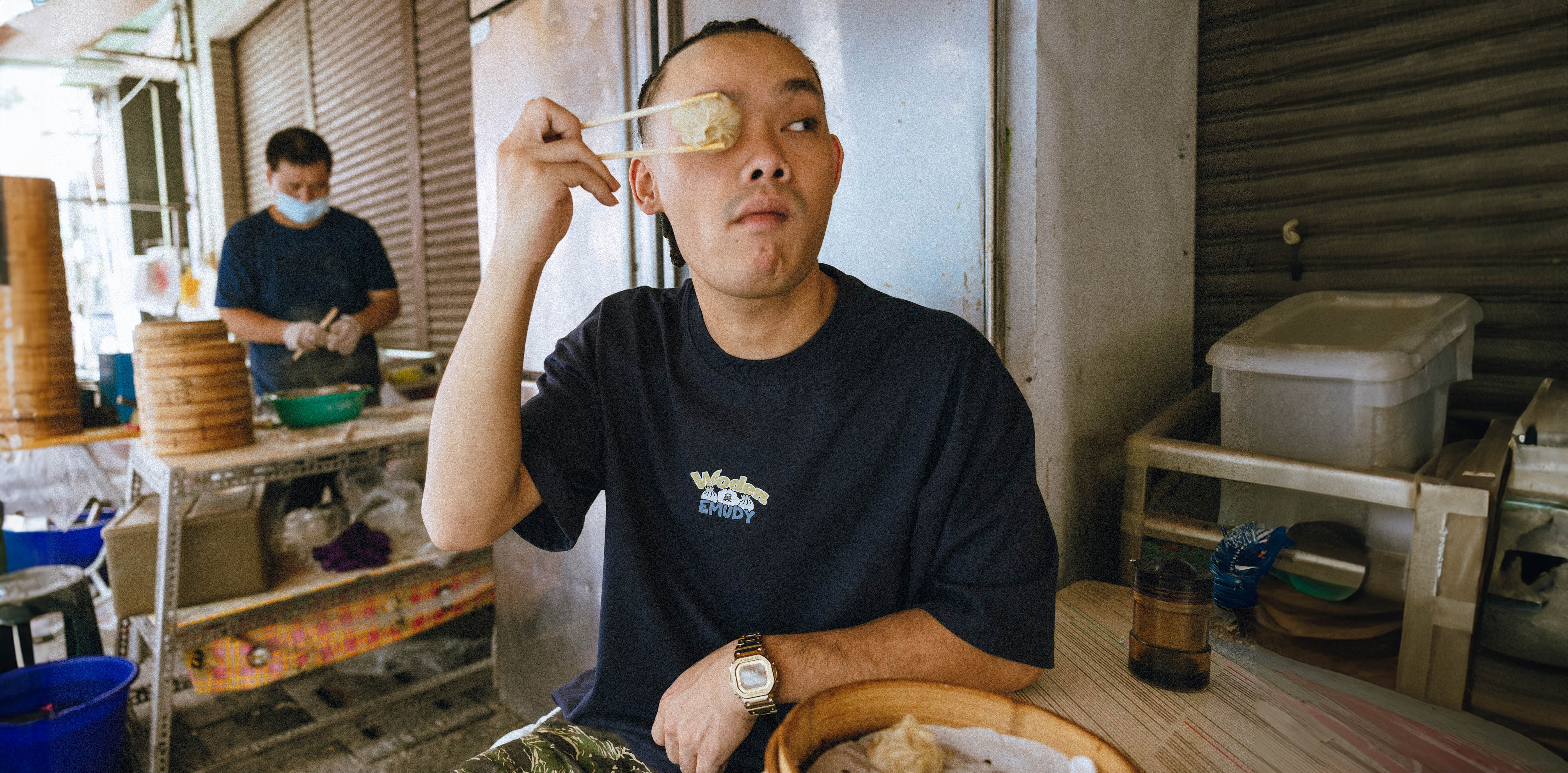 EMUDY 化身為廚師,背面以台灣代表美食 「小籠包」 融入角色設定,描繪 熱氣蒸騰的瞬間,將街頭熟悉的飄香轉化為生動的圖像語言。