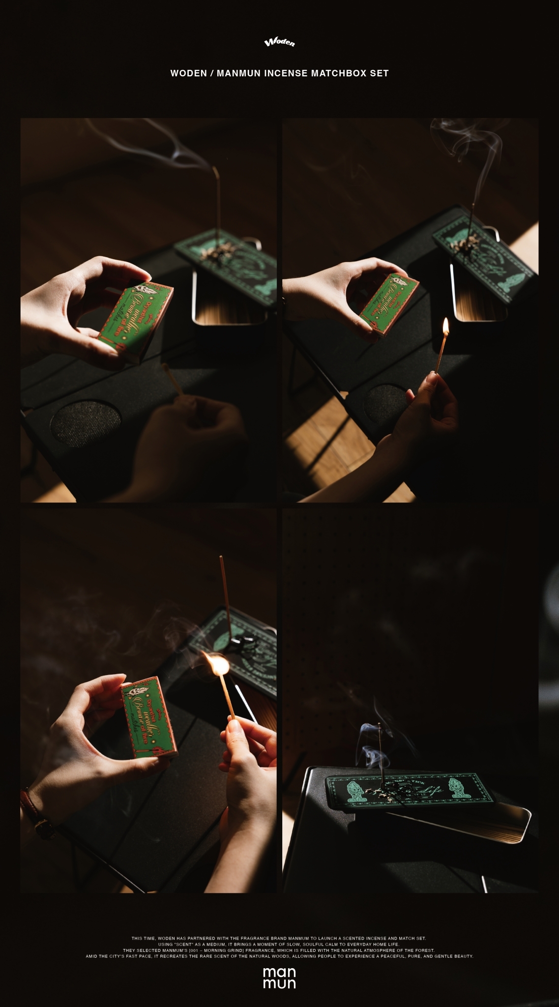 本次 WODEN 攜手香氛品牌 Manmum|慢慢,推出香氛線香火柴組,以「氣味」為媒介,為日常居家注入一段慢下來的靈魂時刻。