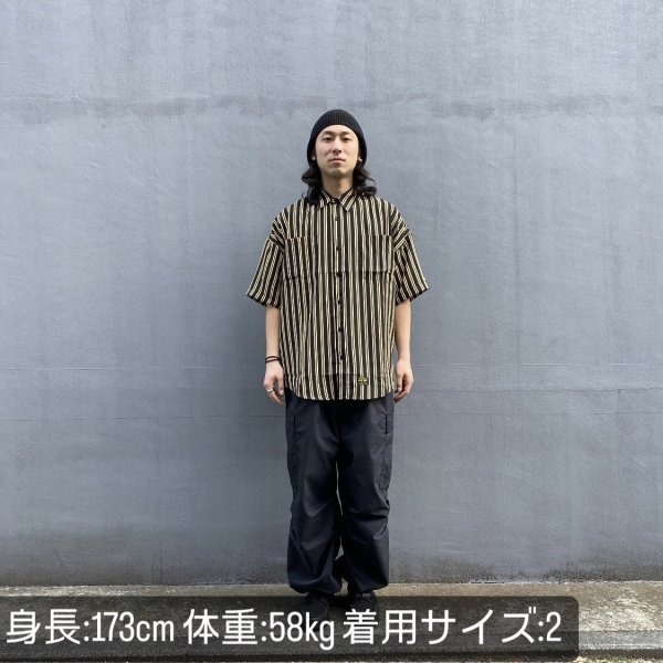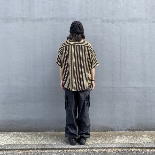 ワイドかつドロップショルダーのシルエットを使用したBIGシャツのS/Sバージョンです。 こちらは柔らかなポリエステル素材のストライプ柄を使用し、上品なドレープ感があり高級感のある仕上がりです。