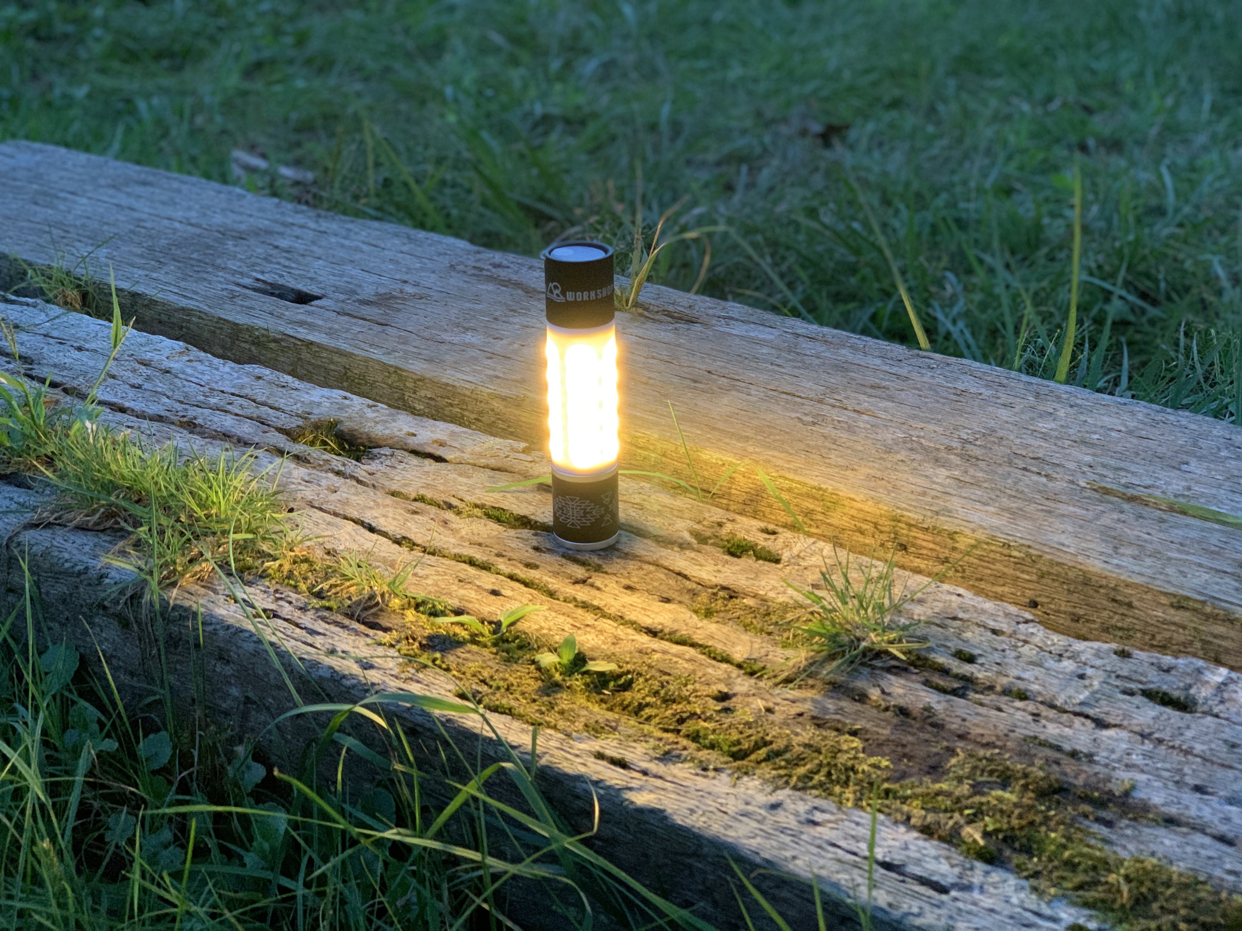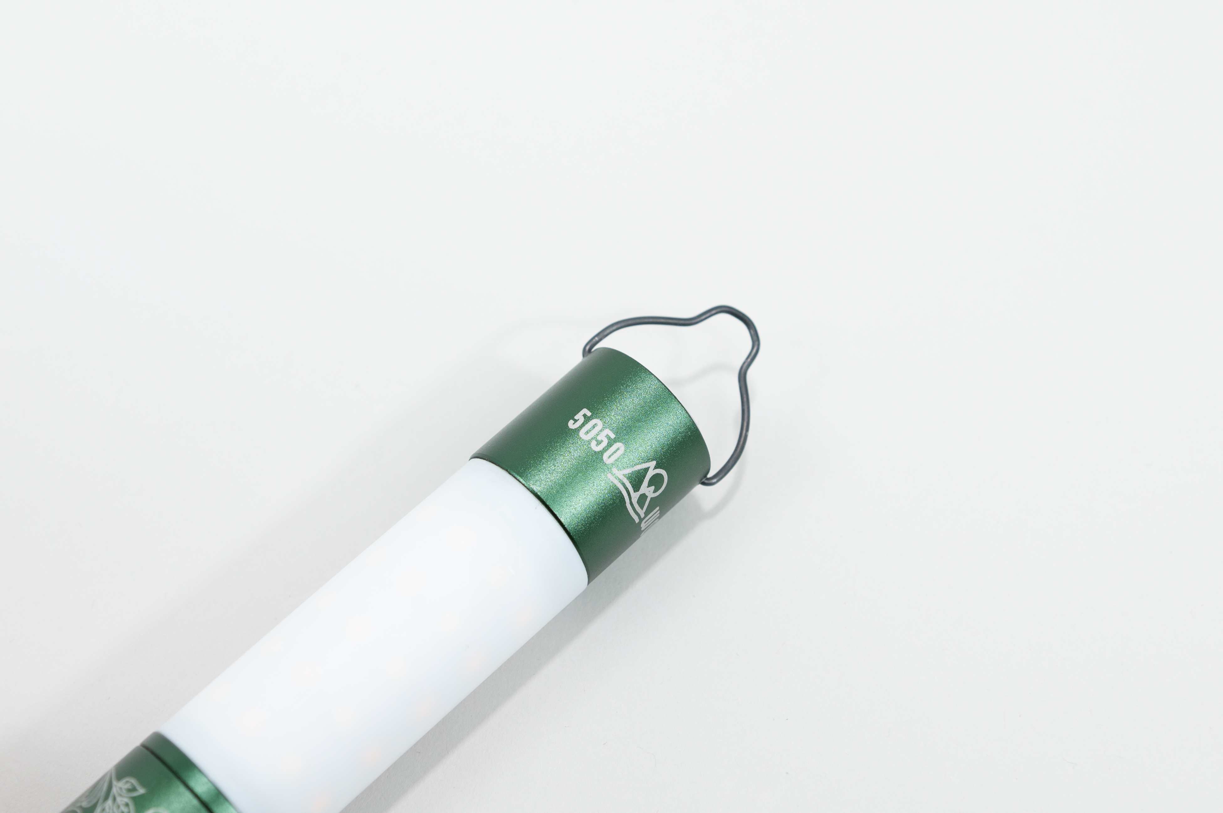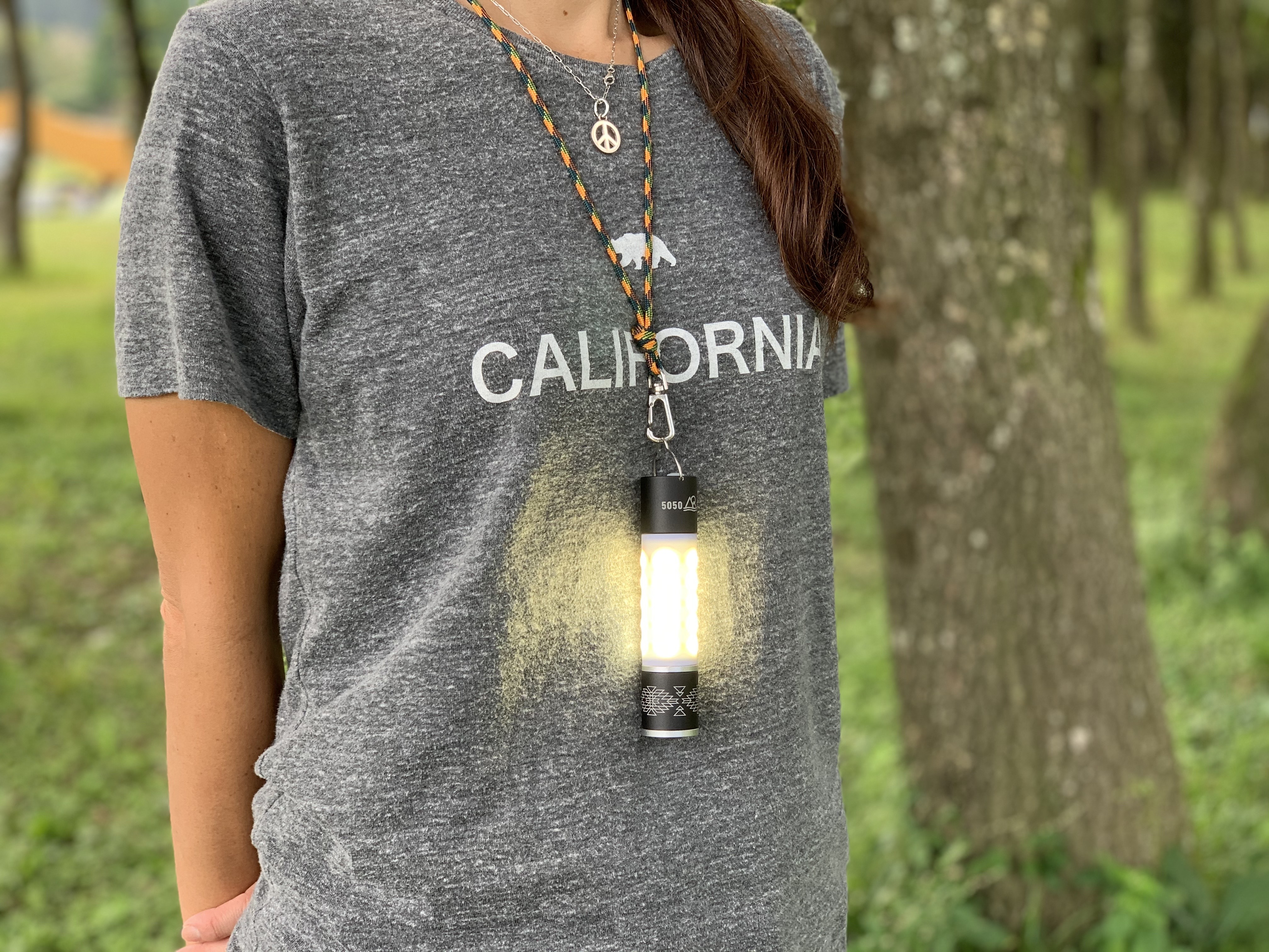 光の強さを2段階で調整できる上、ランタンは雰囲気に合わせて色温度も選択可能。市販のネックストラップやカラビナに付けることもできます。