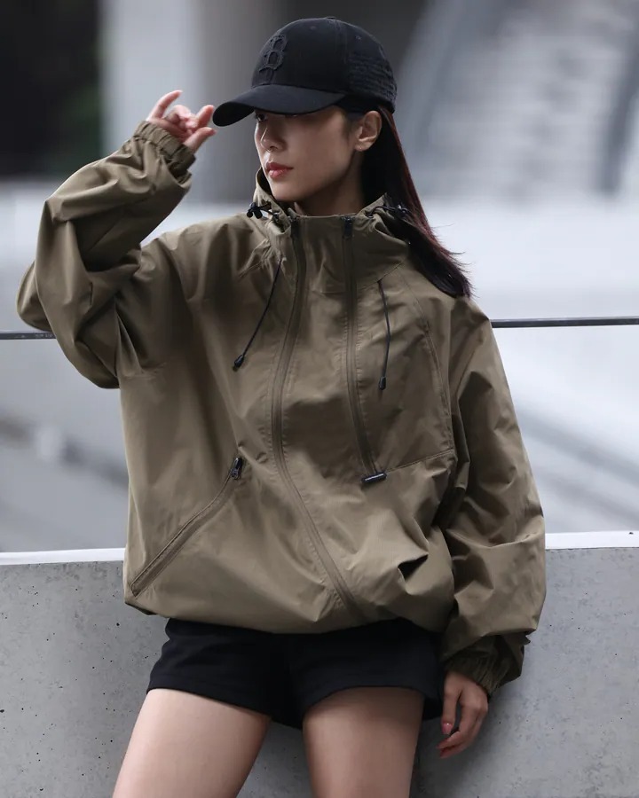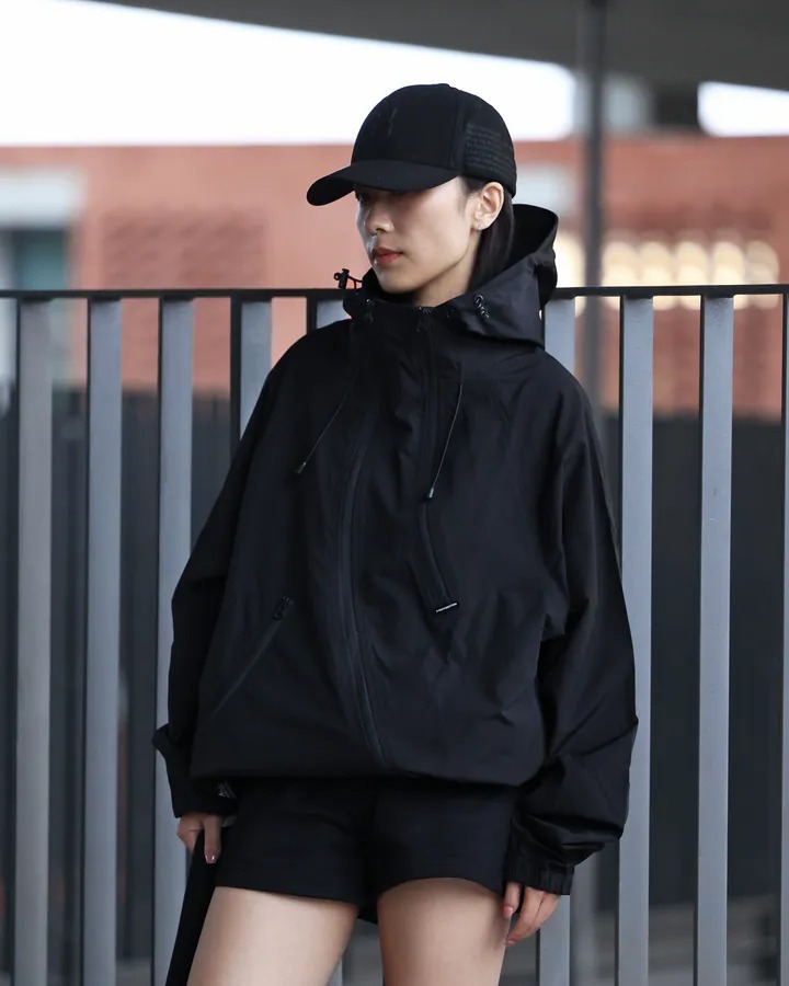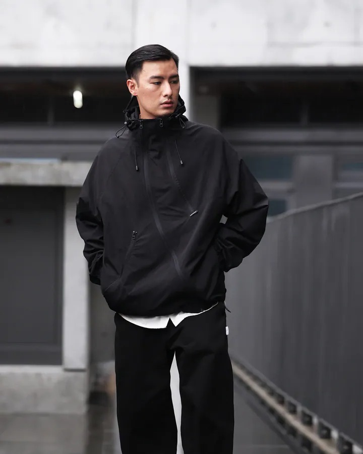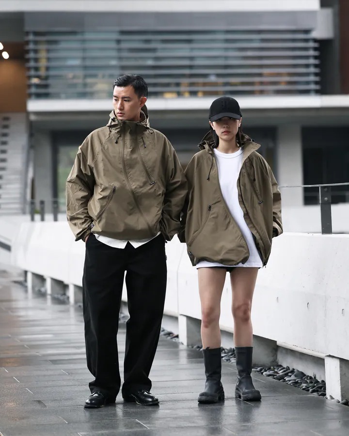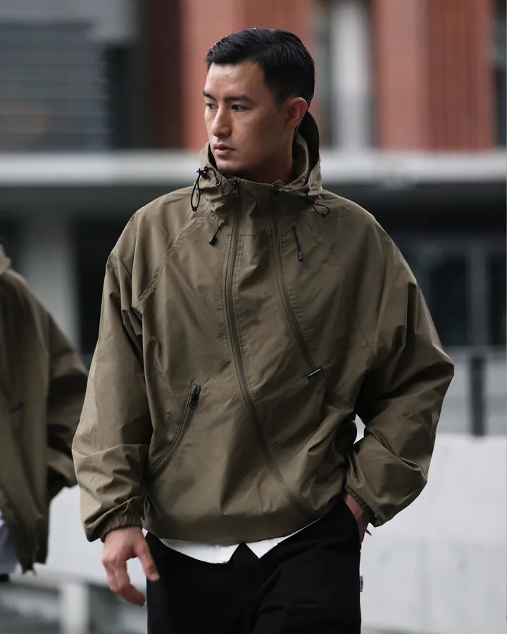 以具備大膽視覺的 #弧形不對稱雙開拉鍊 作為單品重點視覺,其中立體帽型與弧形斜開半襟拉鍊配置,在調整領部透氣的透氣機能同時,也大幅增添多面向穿搭層次視覺,加上另條從帽體領口延伸至下擺的弧形斜置全開拉鏈,再度呼應單品本身較為當代前衛的完整設定。而具備基礎撥水效果的霧面機能質材選用,便利內搭衣物的寬鬆墜袖版型,加上大地沙色與冷調黑色的選色,共同以冷調前衛的都會氣氛,完成便利日常卻也極具存在感的冬季多用單品。