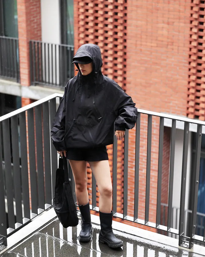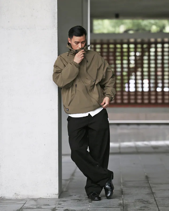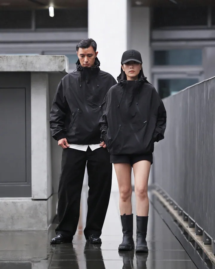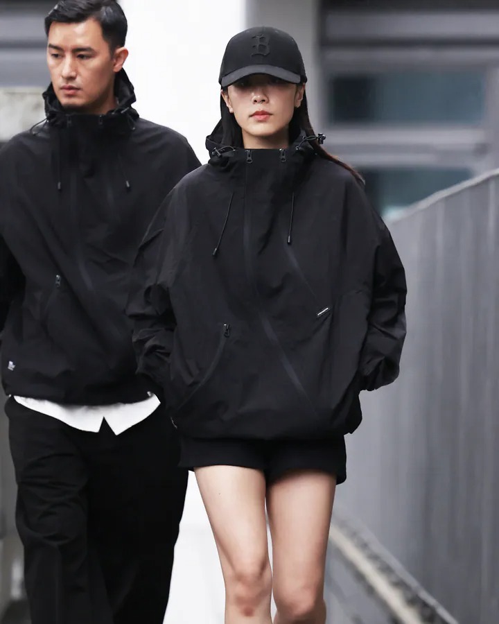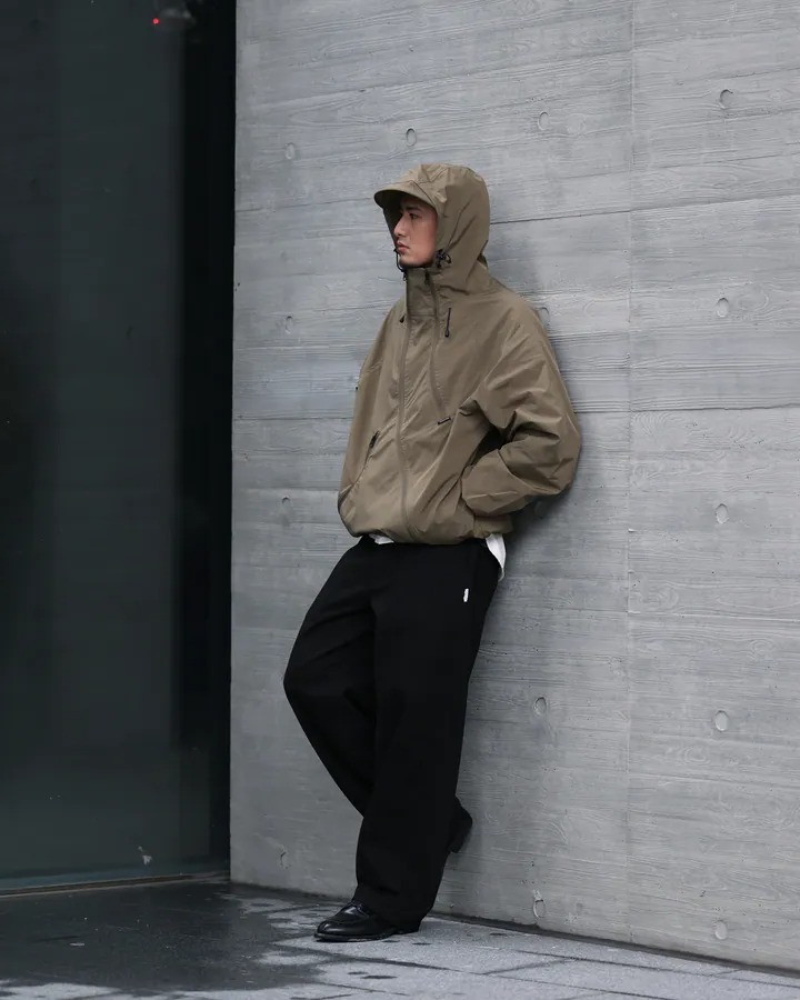 以具備大膽視覺的 #弧形不對稱雙開拉鍊 作為單品重點視覺,其中立體帽型與弧形斜開半襟拉鍊配置,在調整領部透氣的透氣機能同時,也大幅增添多面向穿搭層次視覺,加上另條從帽體領口延伸至下擺的弧形斜置全開拉鏈,再度呼應單品本身較為當代前衛的完整設定。而具備基礎撥水效果的霧面機能質材選用,便利內搭衣物的寬鬆墜袖版型,加上大地沙色與冷調黑色的選色,共同以冷調前衛的都會氣氛,完成便利日常卻也極具存在感的冬季多用單品。