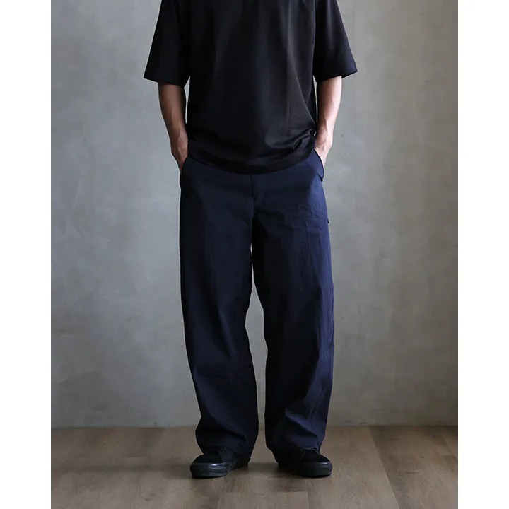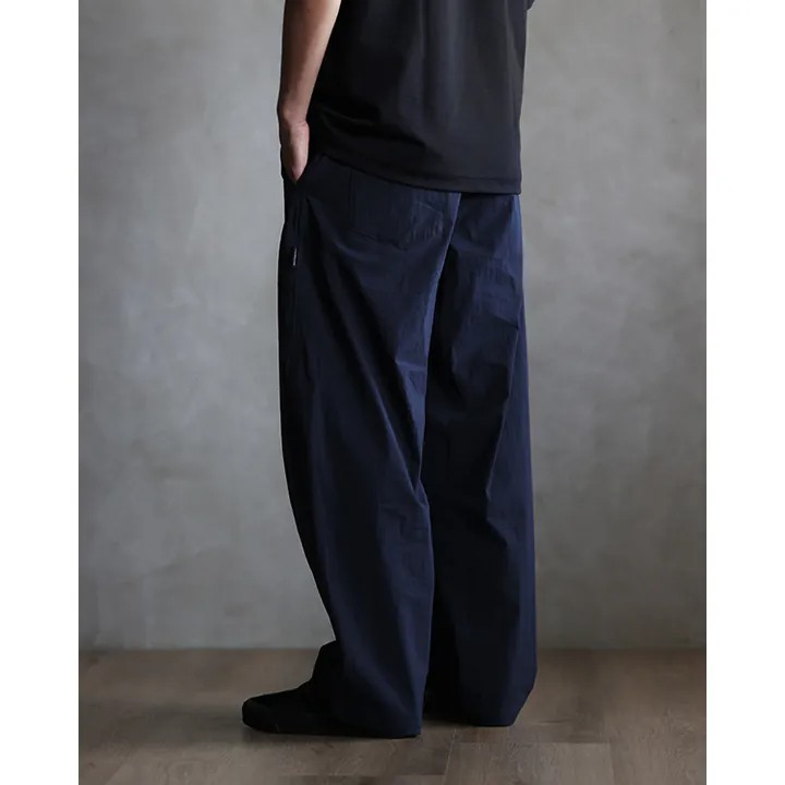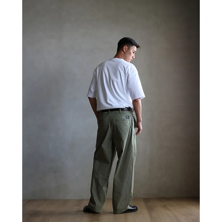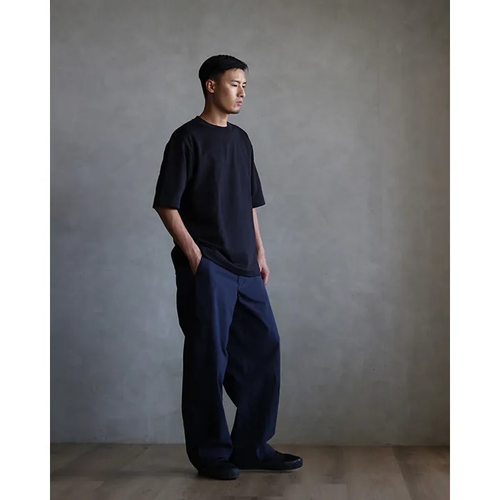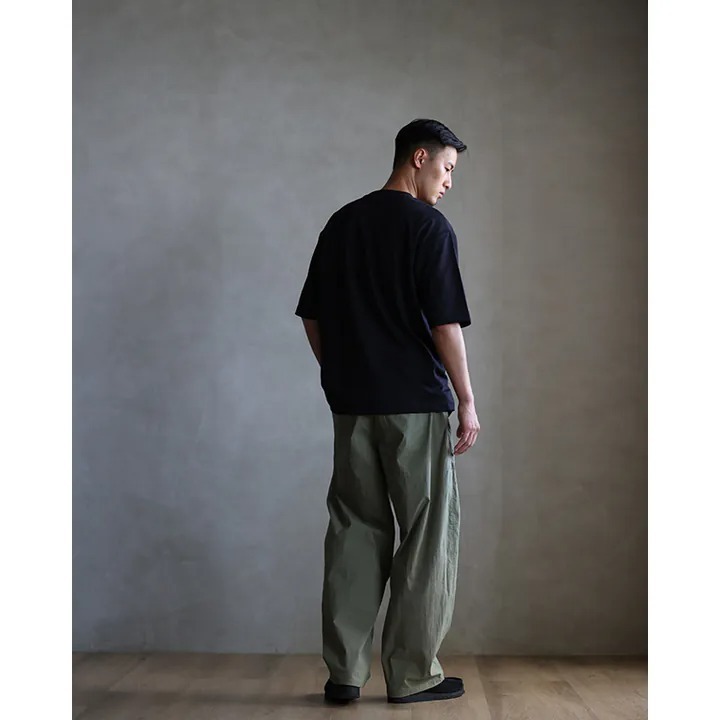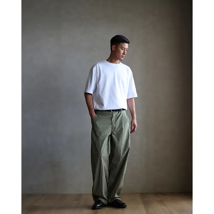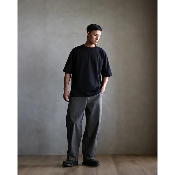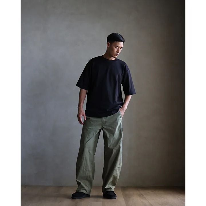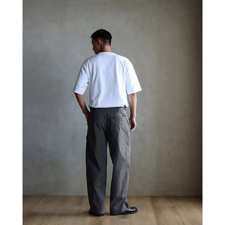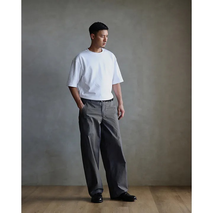 擷取刀型基礎輪廓,也帶入了些許軍裝視角細節,再以BS品牌簡約洗鍊的核心觀點,將褲腳兩側誇張外擴的弧度收斂簡化為更加適合日常的褲型輪廓。除了以全新簡約刀型褲的提案之外,也選用了非常適合夏季著用的起皺混紡涼感質材,並以鐵灰/深藍/淺軍綠三色推出,提供周間日常穿搭中輕鬆簡便的全新可能與​當代街裝輪廓 。