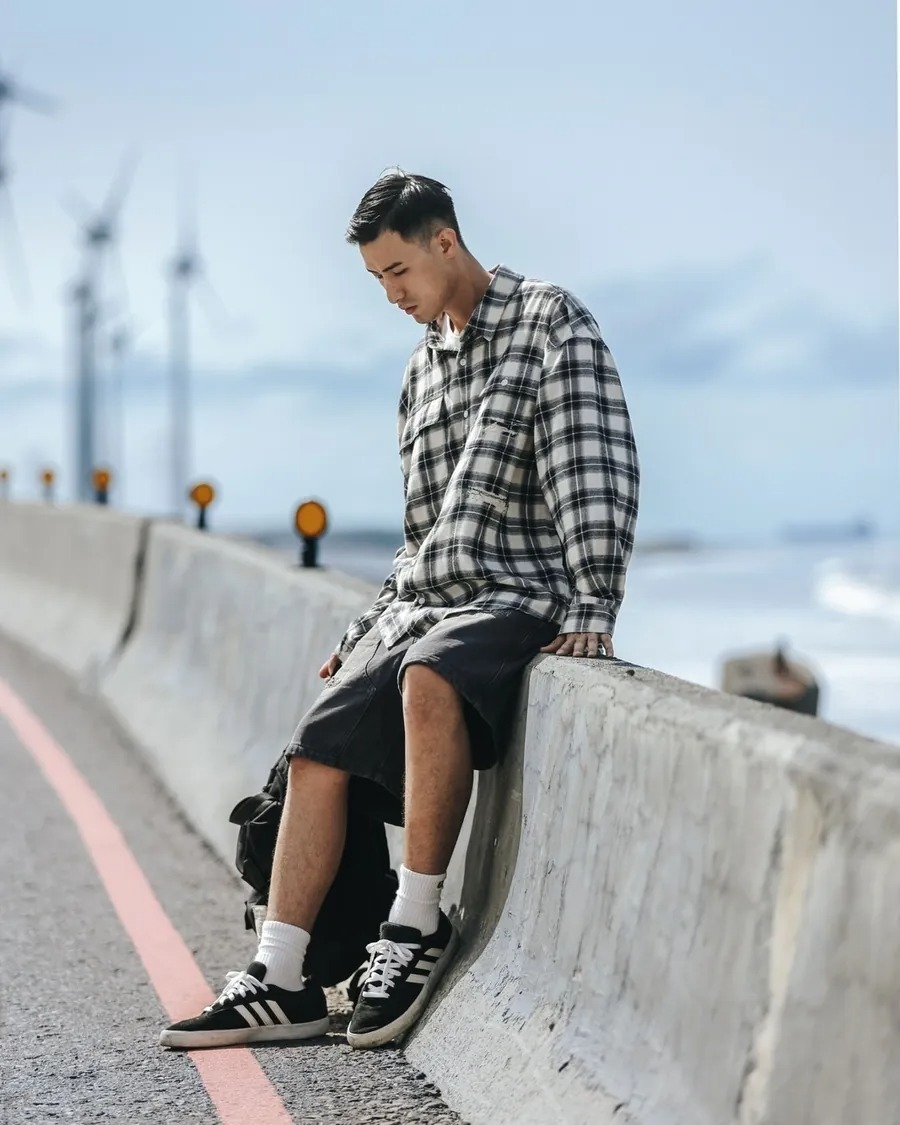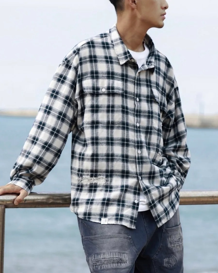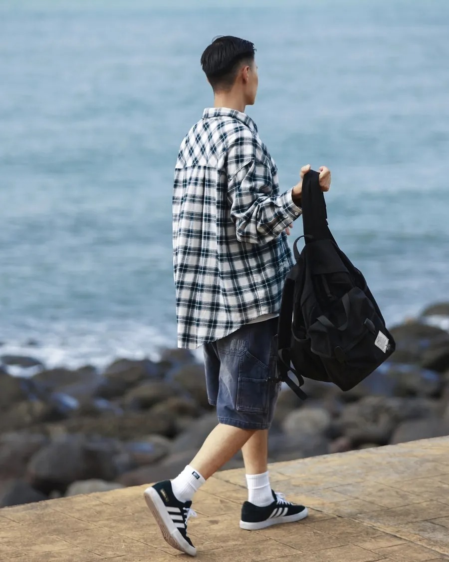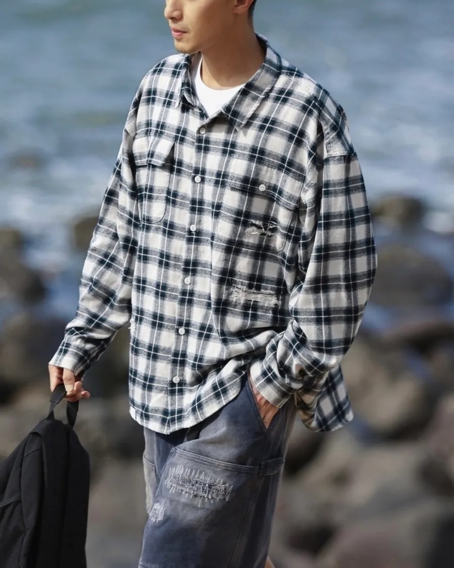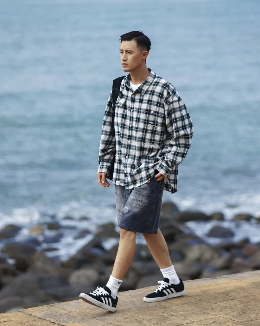 經過版型的微調縮放,改以合宜寬鬆的輪廓推出。米色與深藍交錯的格紋構成,加上水洗舊化加工,帶來復古視覺與舒適體感,而除了胸前雙袋的配置,單品重點的破壞補強工藝,也為單品增低調缺也注目的觀點細節。