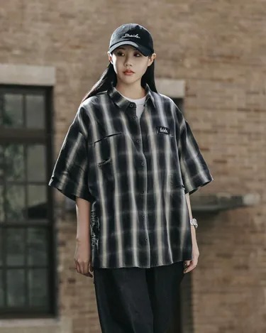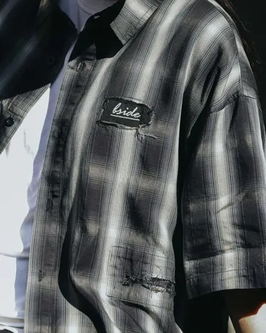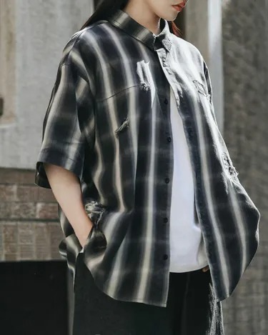 雖然是以漸變格紋作為面料組織基礎,但直向米白與漸層深灰綠的注目配色,卻也帶來近似寬直紋的視覺效果。而以破壞/抽鬚/補強..等舊化氛圍呈現的工藝質感,並也以融入左