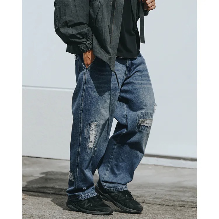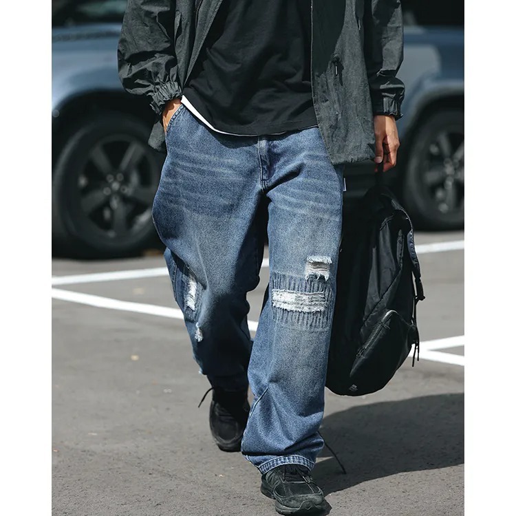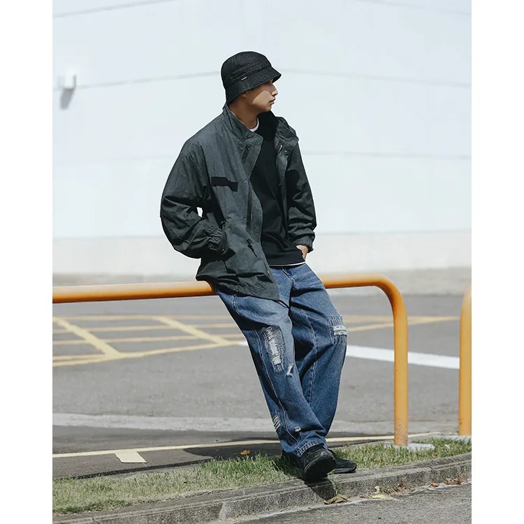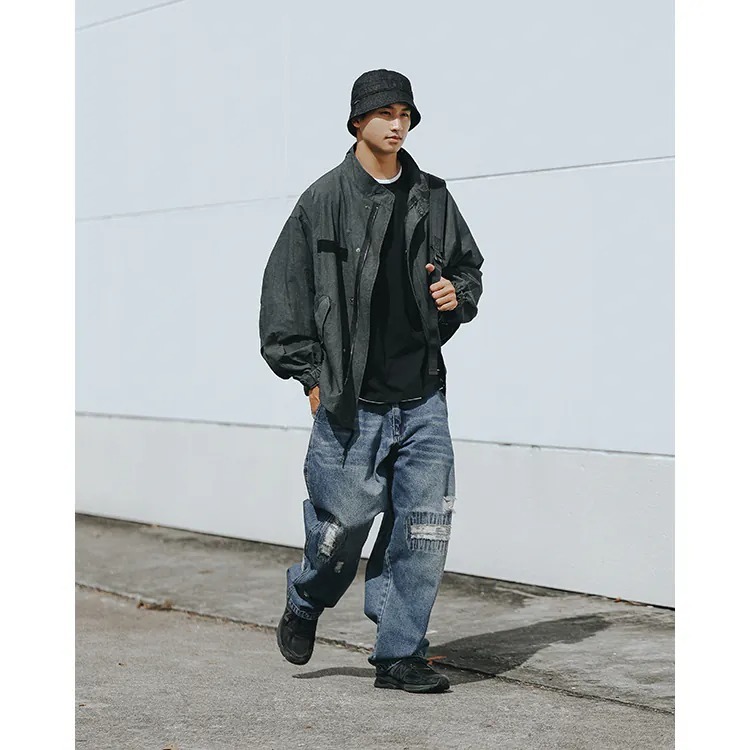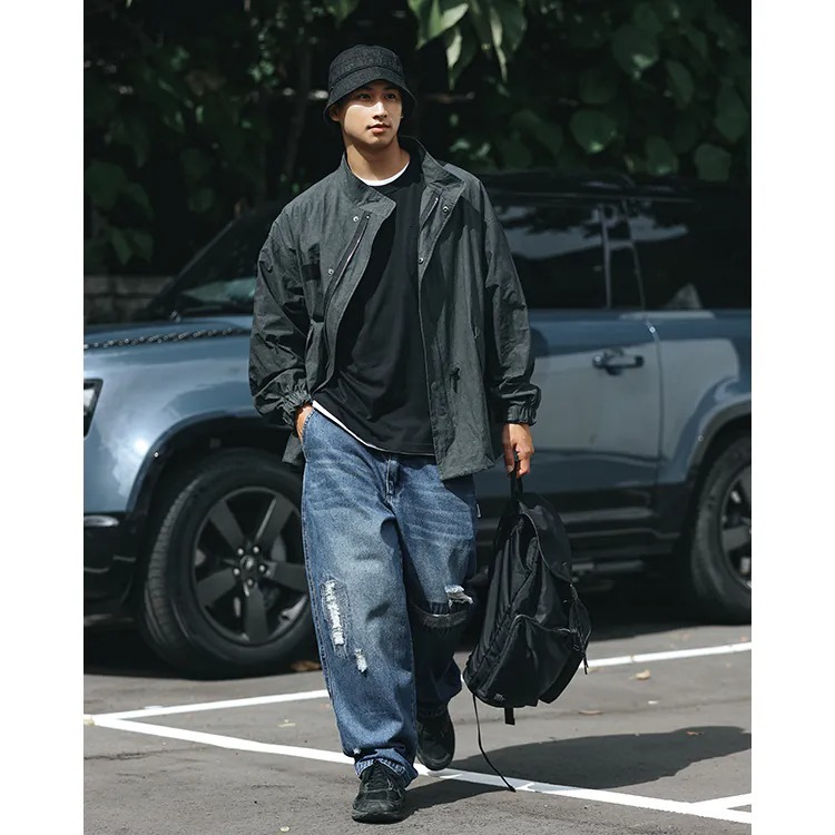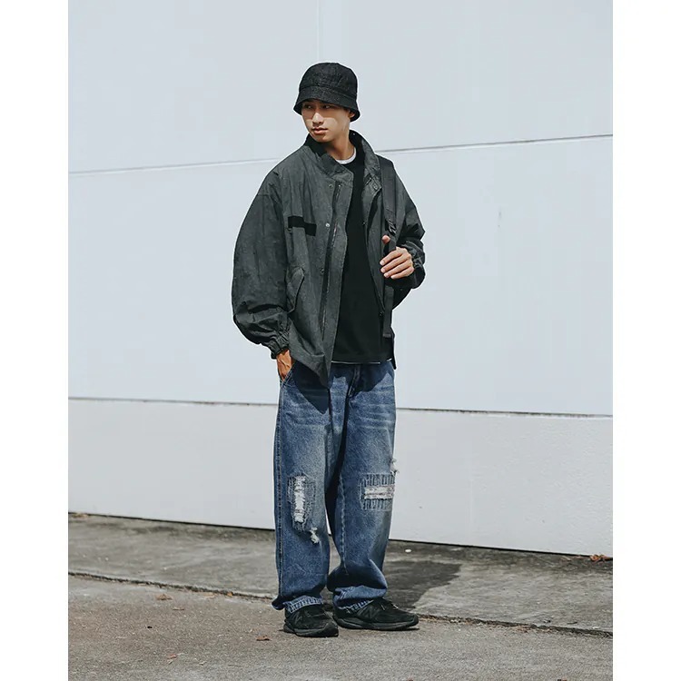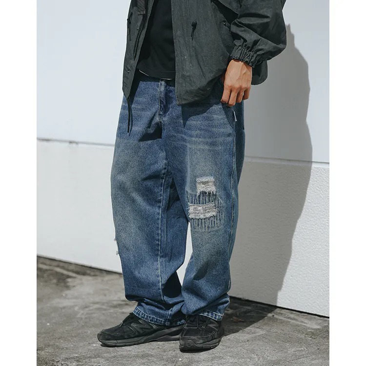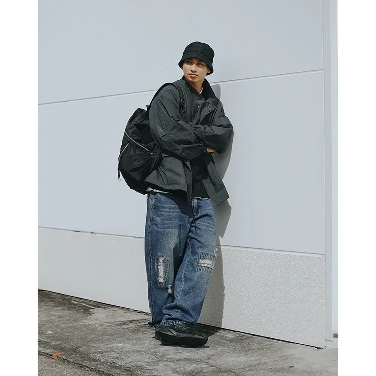 除了自然呈現的水洗色落,源自古著老品的破壞與補強, 當然也是單寧製品特有的舊化呈現技法。而本次推出的重度破壞丹寧褲,除了視覺重點得破損補強,輪廓方面更略為放寬了褲腳,並以偏向直筒的全長褲型作為版型調整重點,褲款整體在延續BS整體風格的同時也提出因應當下的嶄新穿搭輪廓。