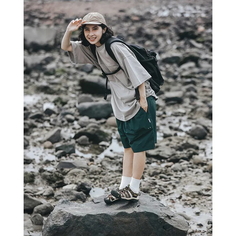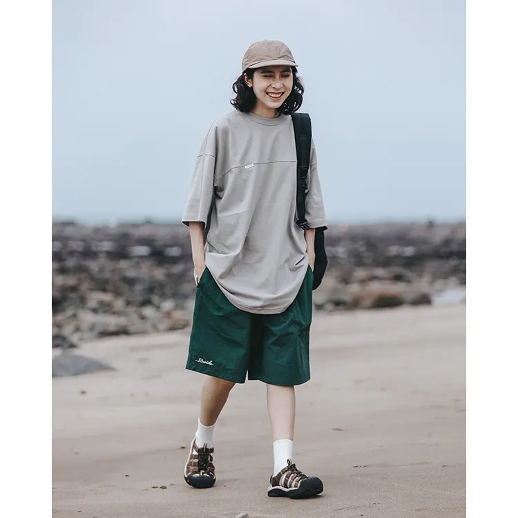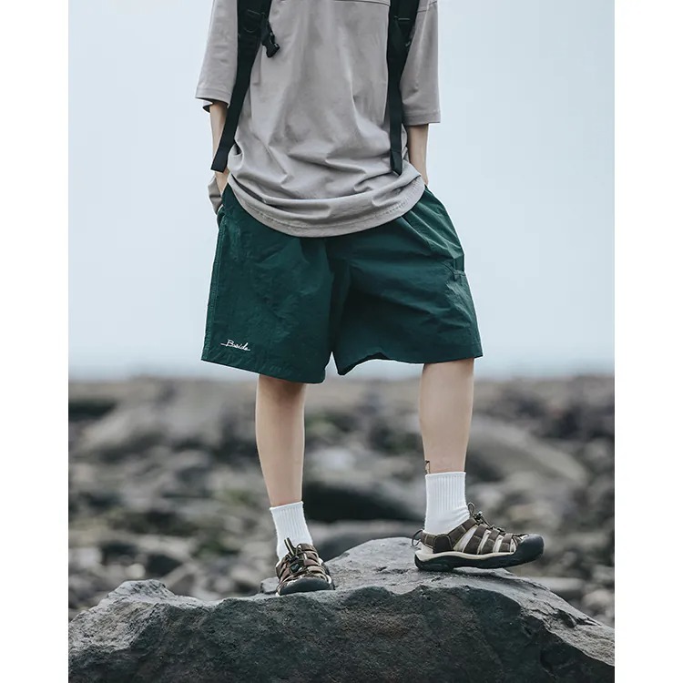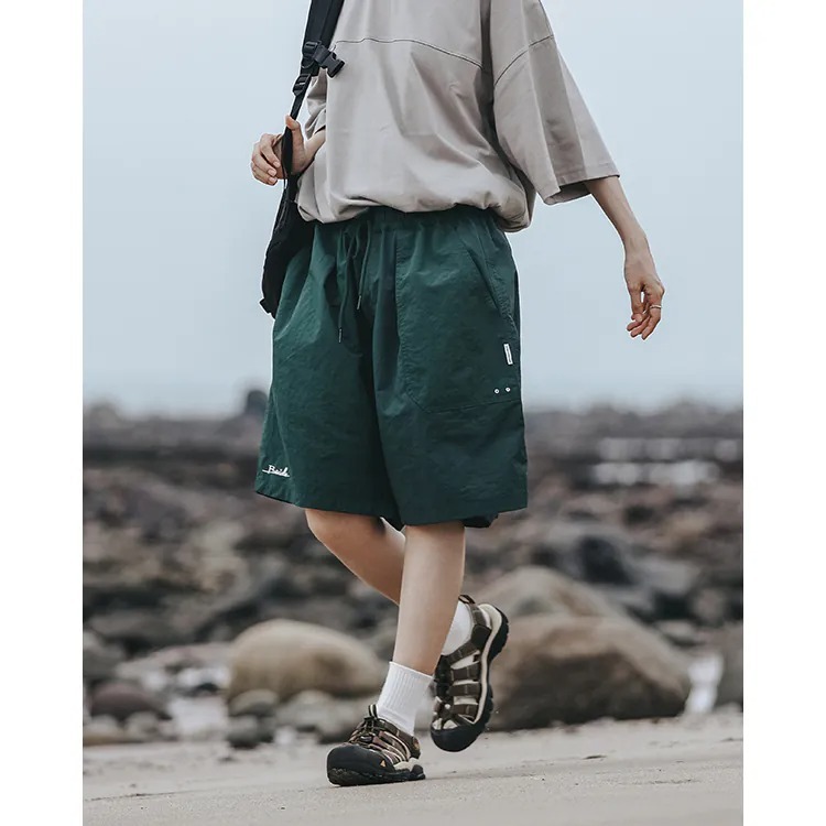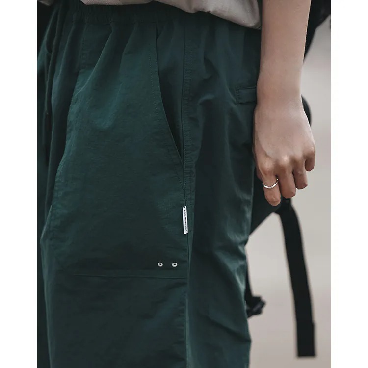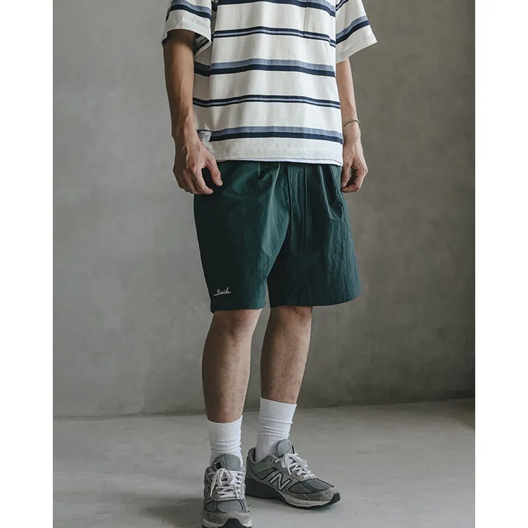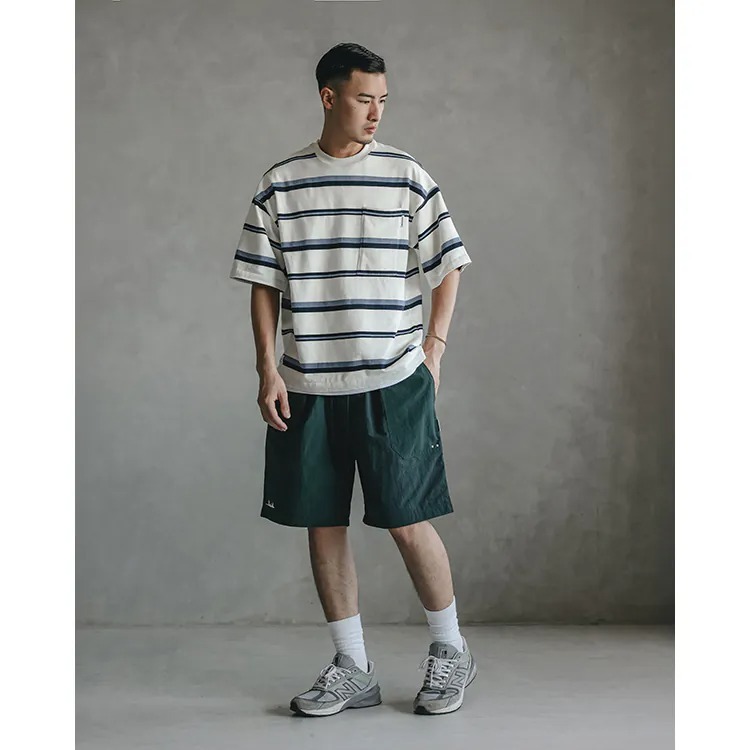 以舒適涼爽的夏季基礎短褲提案,起皺尼龍面料提供了舊化復古的質感氛圍與速乾便利機能,些許不同的綠色面料拼接運用,也提供了褲款低調色差視覺,而左右不對稱的口袋剪裁,加上右腳文字刺繡與左方外貼袋的白色透氣孔,俐落呈現褲款簡約卻也注目的重點細節。