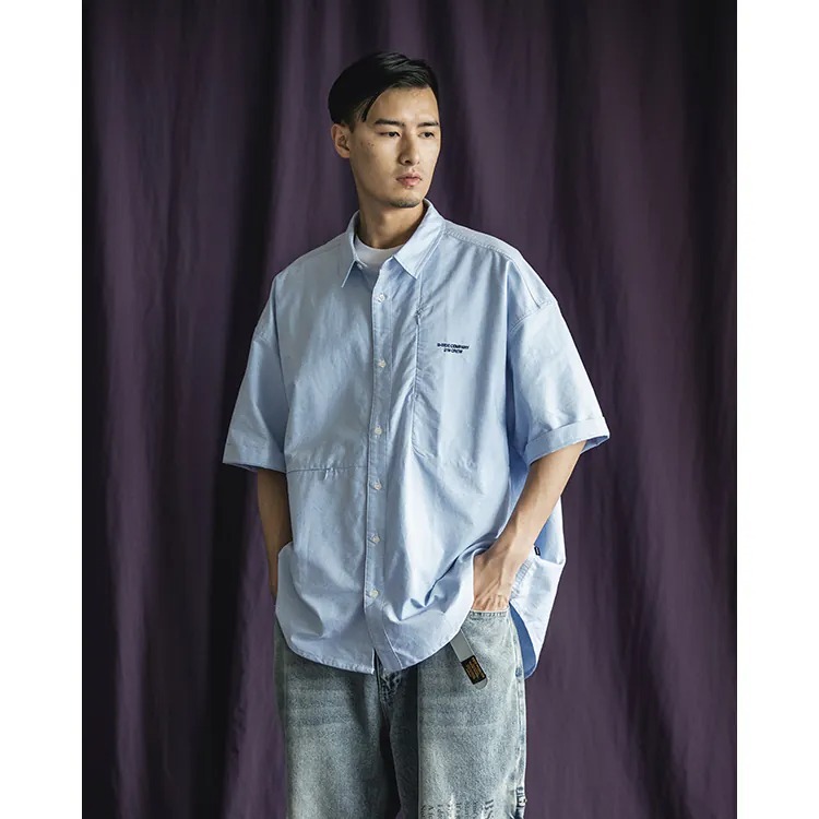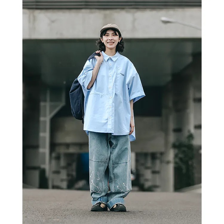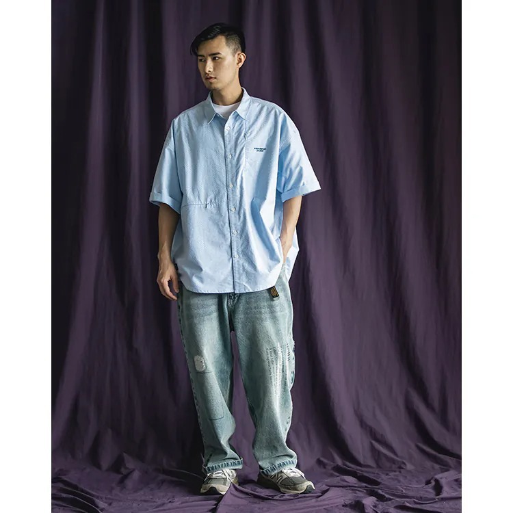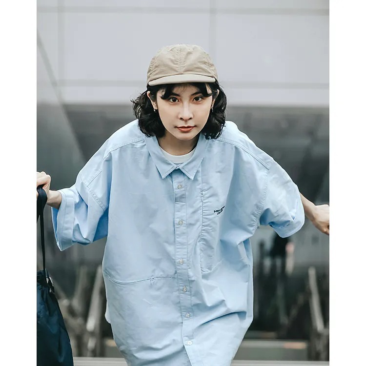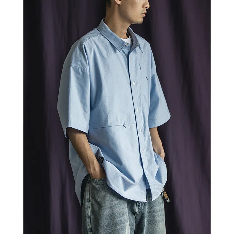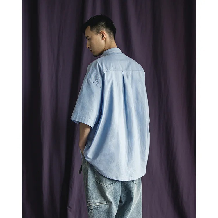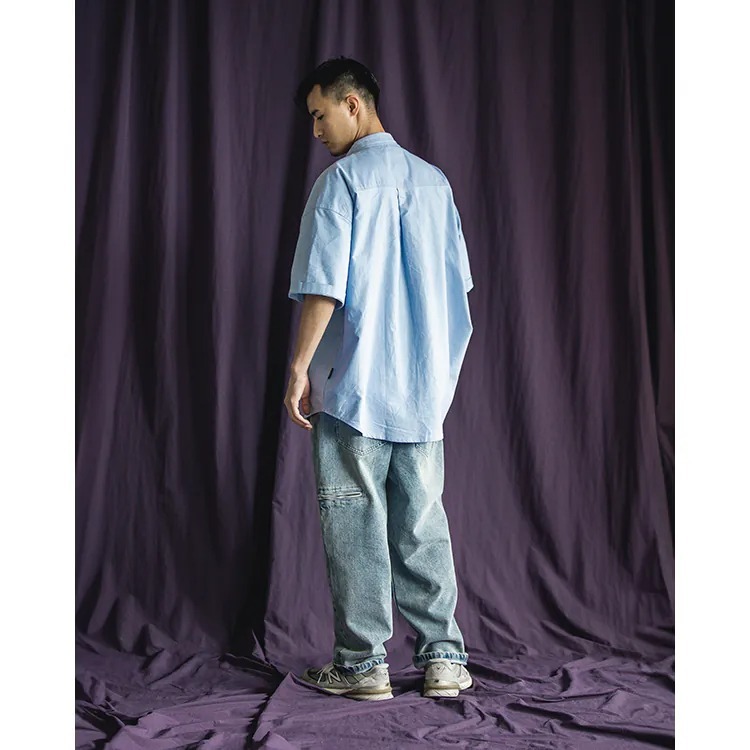 以經典淺藍牛津布傳達夏季清爽視覺,直向與橫向兩道剪接帶來簡約層次視覺的同時,剪接處隱形拉鍊的配置也在牛津襯衫的傳統氣息中增添了點當代便利機能。而除了面料本身的清爽視覺,寬版剪裁的舒適體感也相當適合夏季氣候穿搭著用。