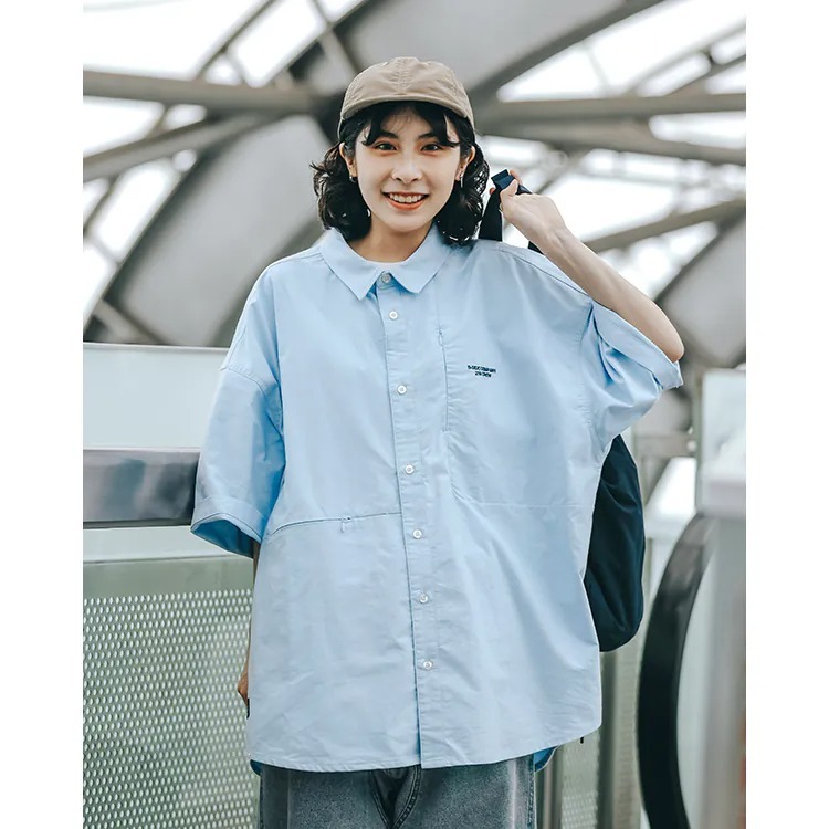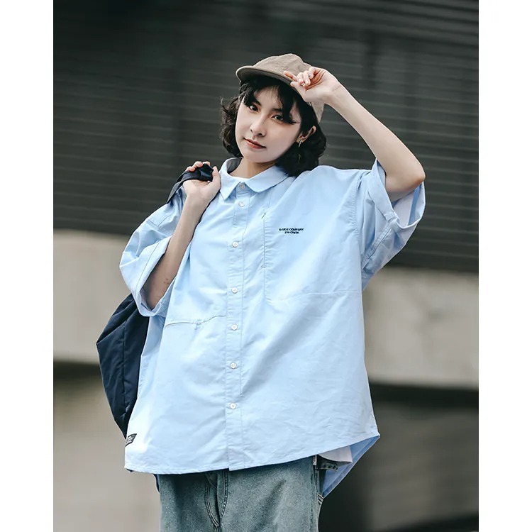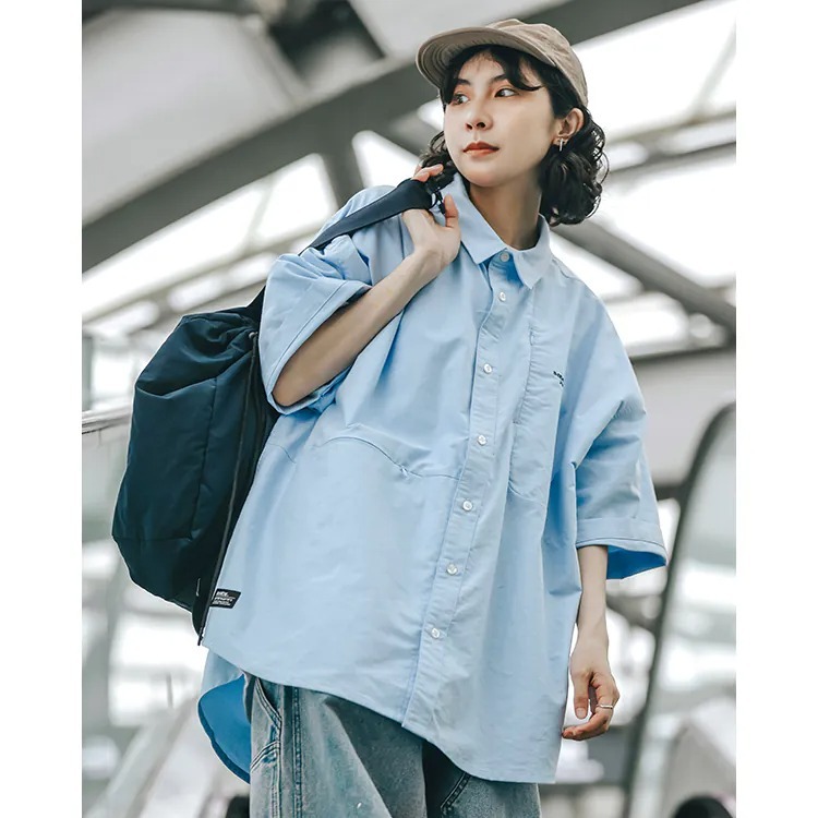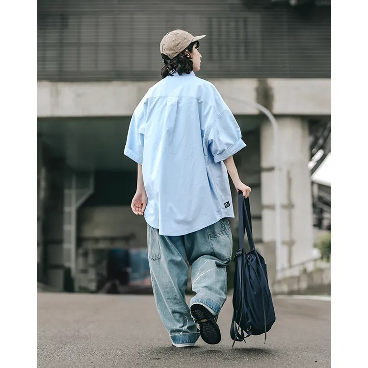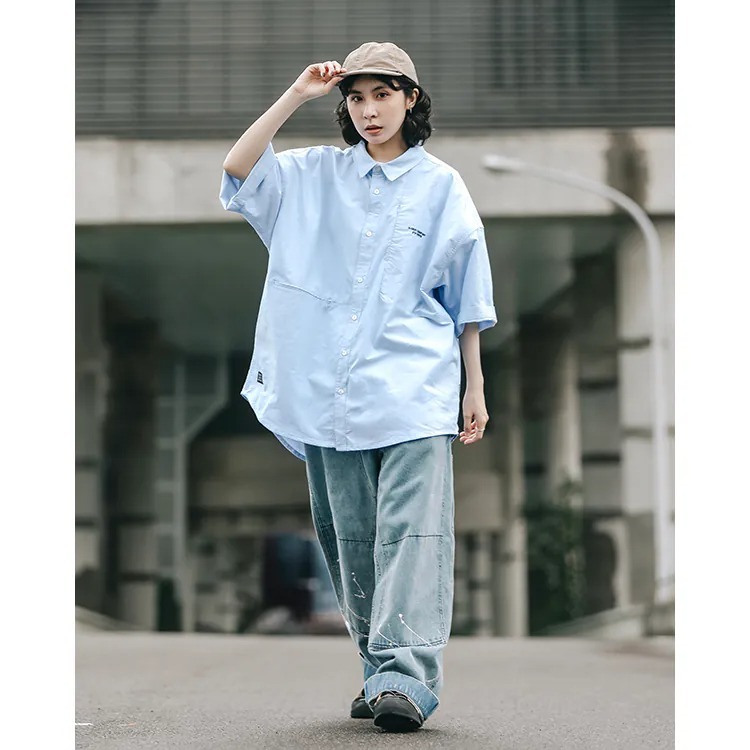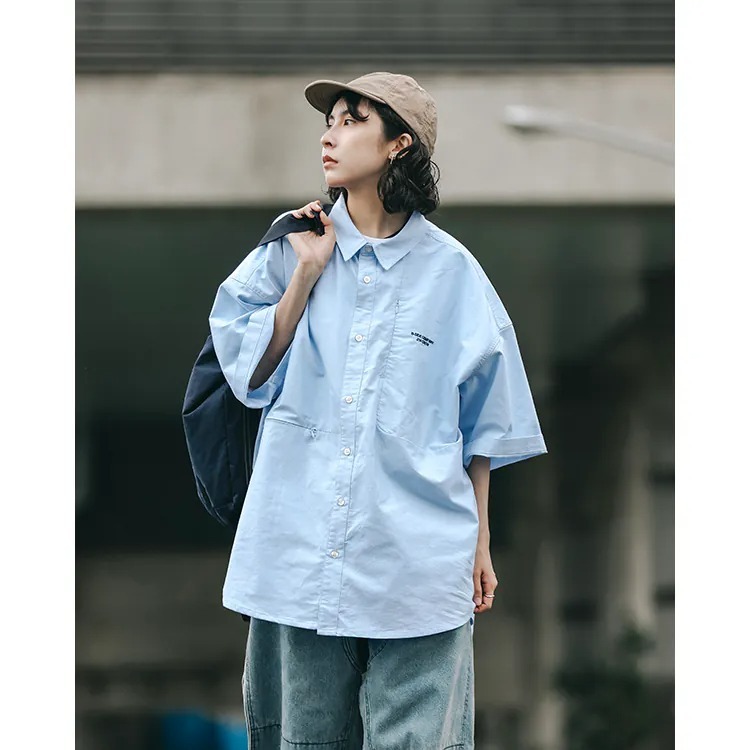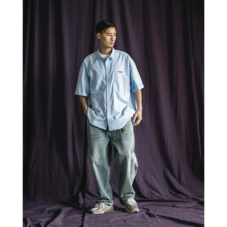 以經典淺藍牛津布傳達夏季清爽視覺,直向與橫向兩道剪接帶來簡約層次視覺的同時,剪接處隱形拉鍊的配置也在牛津襯衫的傳統氣息中增添了點當代便利機能。而除了面料本身的清爽視覺,寬版剪裁的舒適體感也相當適合夏季氣候穿搭著用。