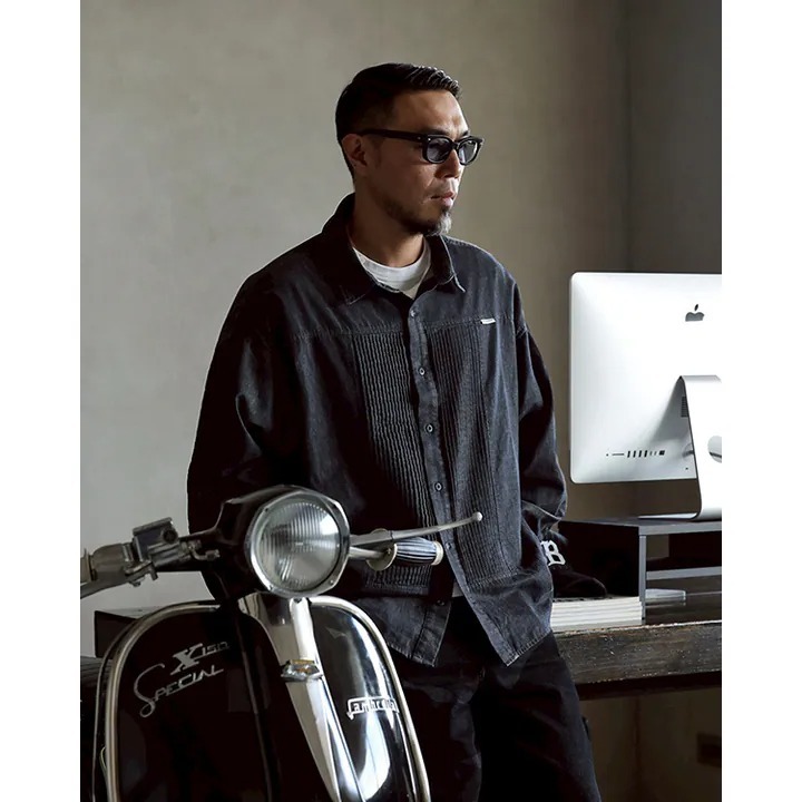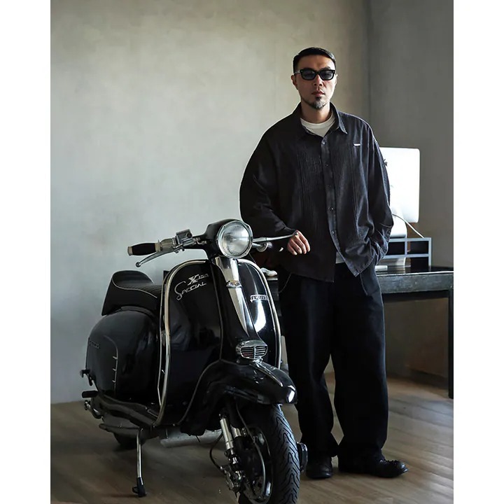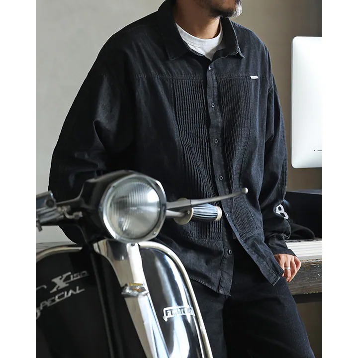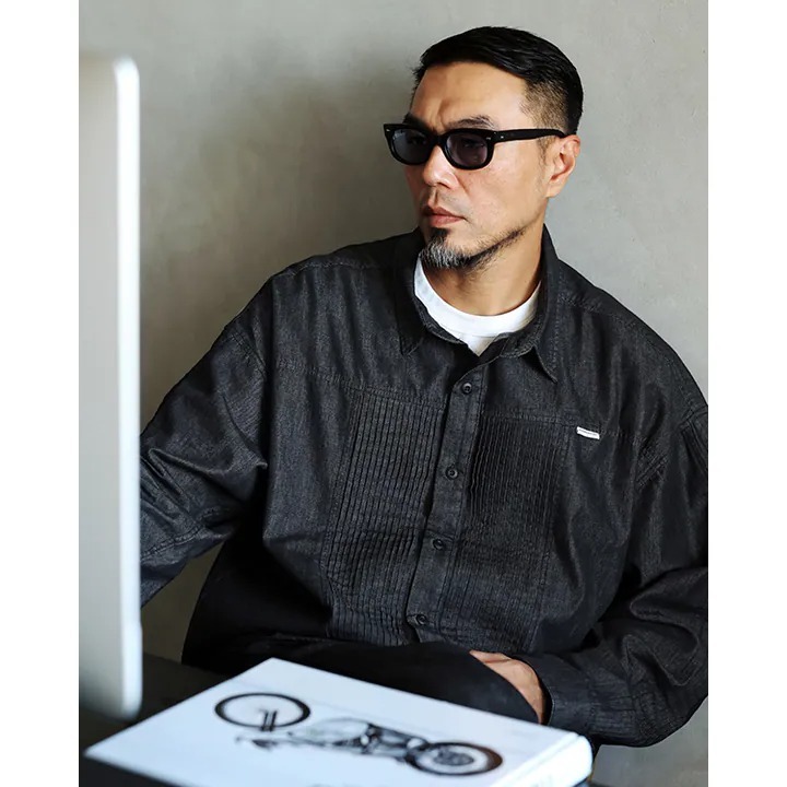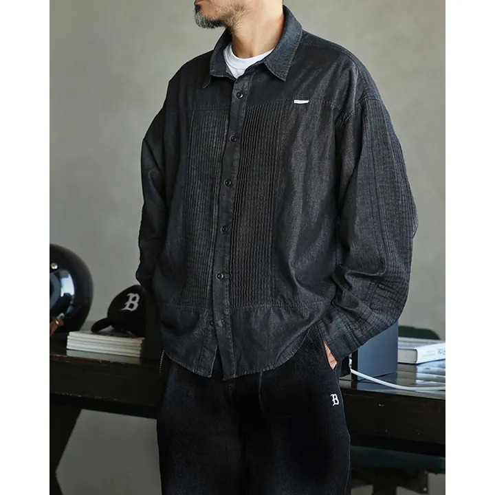 - 水洗舊化 One Washed以正裝晚宴襯衫的胸前直向抓褶作為單品提案重點,而改以輕薄舒適並水洗舊化的類單寧質材做為面料呈現,而除了胸前橫向剪接與直向抓褶交錯的立體直感,也在左右手臂各自延伸的抓折設計更有別於傳統,呈現BS簡約卻也注目的都會街裝質感與復古洗鍊氛圍。