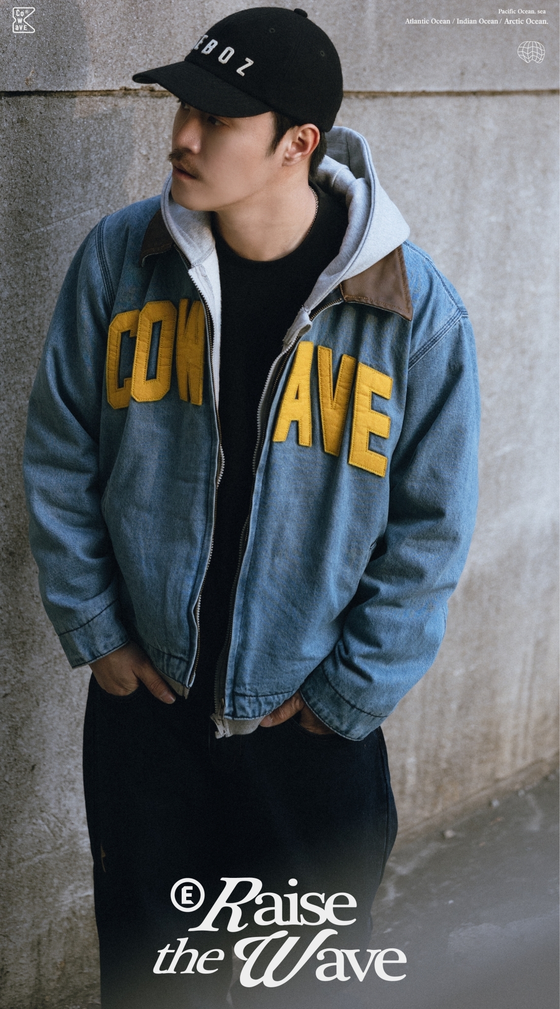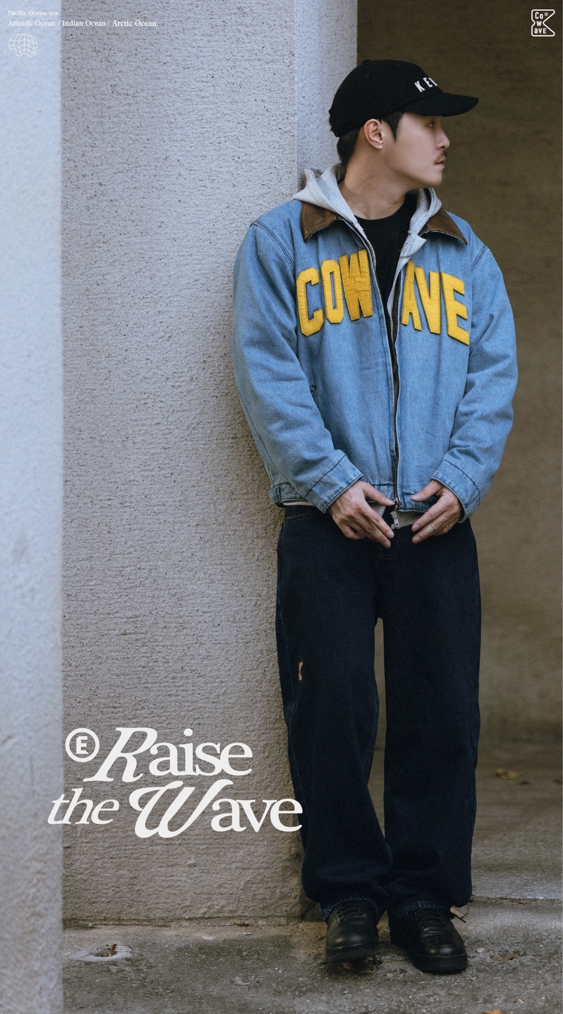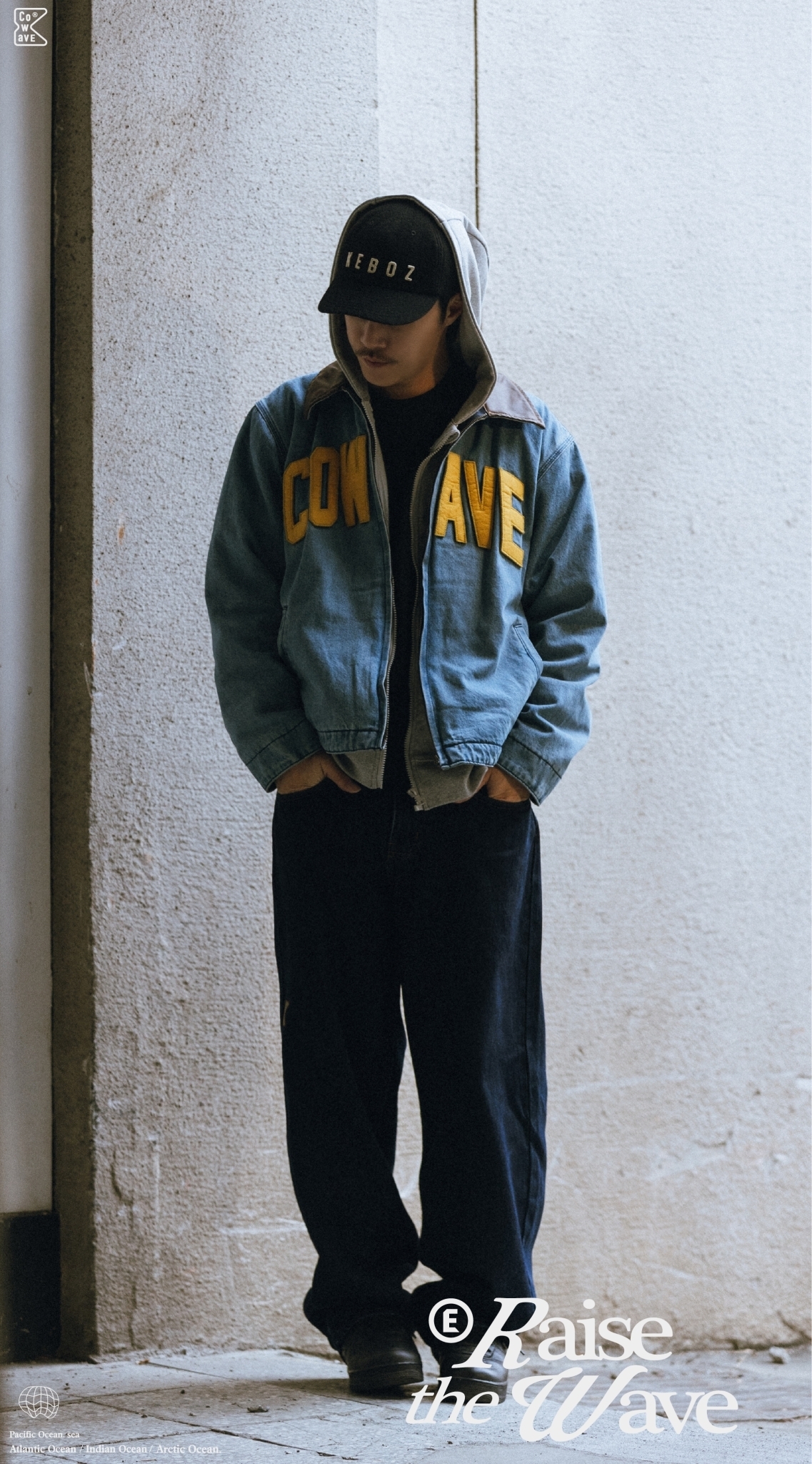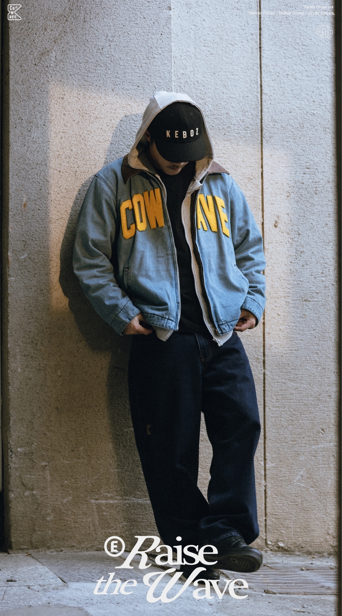 設計細節方面,正面融入大面積 COWAVE 字體,以不織布貼布工藝呈現,採用不飽和黃色點綴,營造濃厚的復古氛圍。此外,拼接處特別加入褪色處理技術,呈現自然過渡效果,讓整體設計更顯細膩,完美結合經典與現代風格,彰顯復古魅力與設計感。
