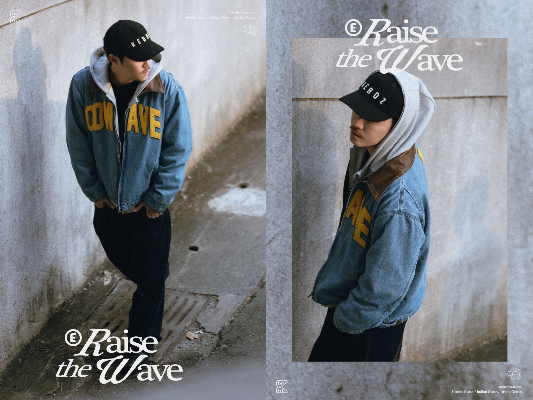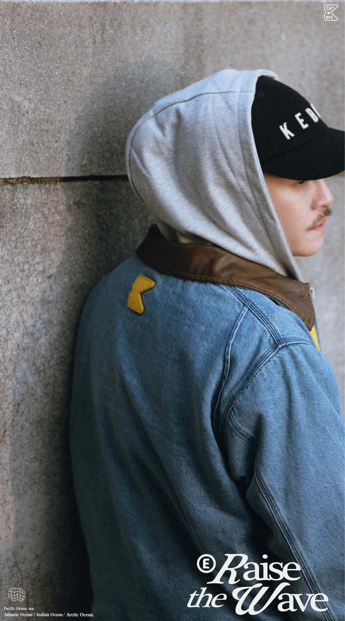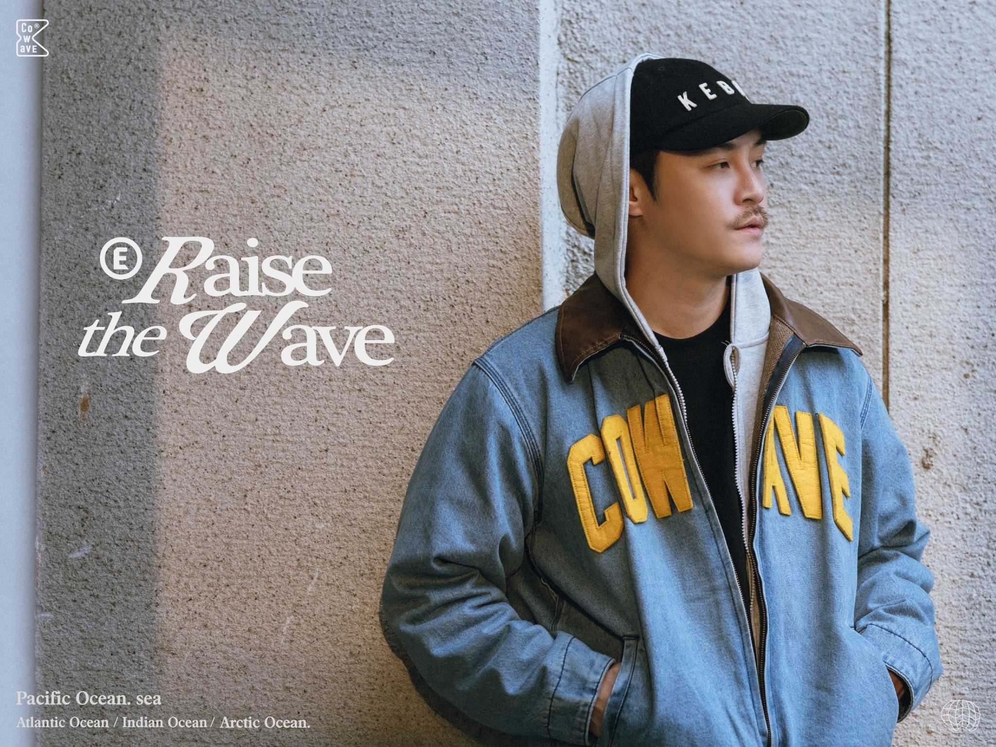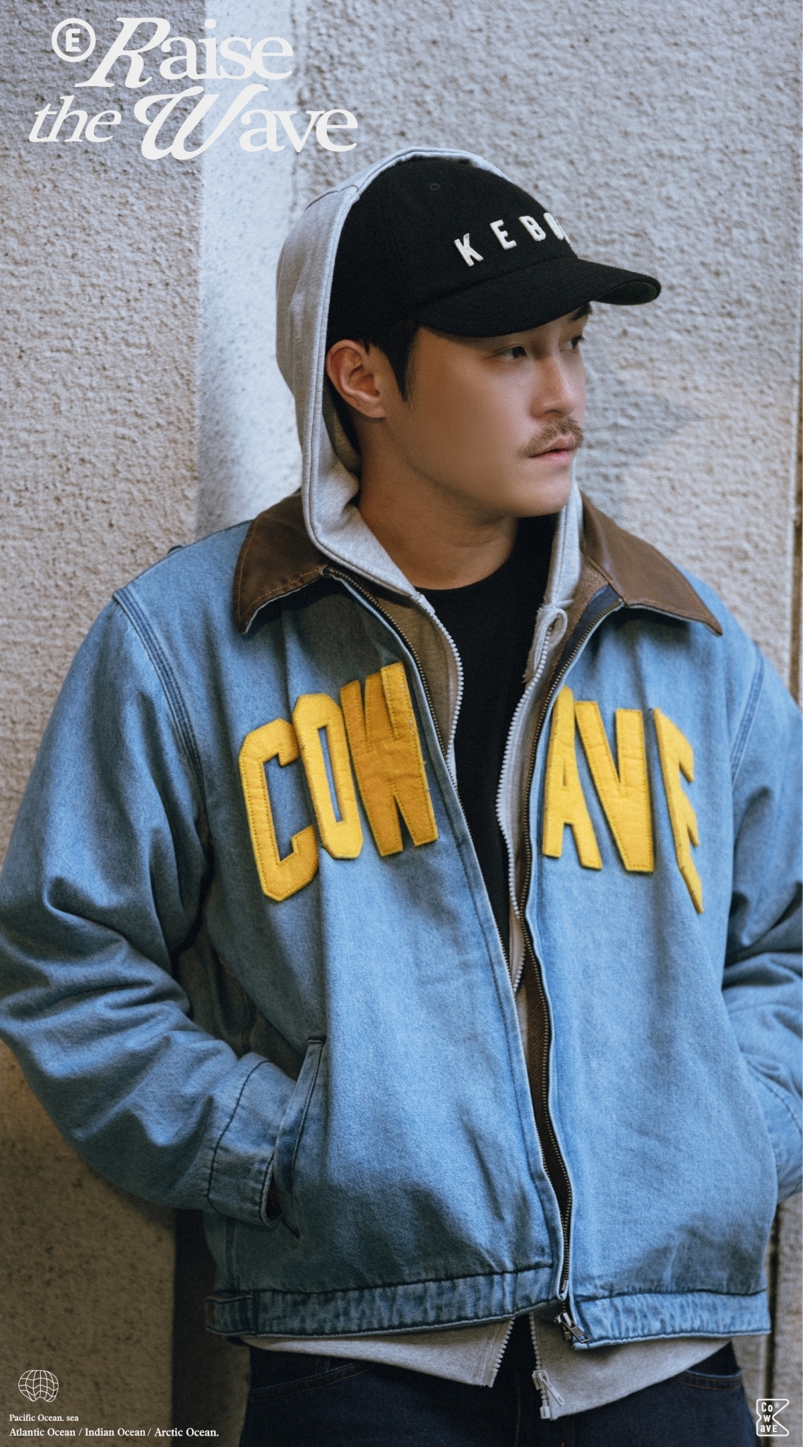 設計細節方面,正面融入大面積 COWAVE 字體,以不織布貼布工藝呈現,採用不飽和黃色點綴,營造濃厚的復古氛圍。此外,拼接處特別加入褪色處理技術,呈現自然過渡效果,讓整體設計更顯細膩,完美結合經典與現代風格,彰顯復古魅力與設計感。