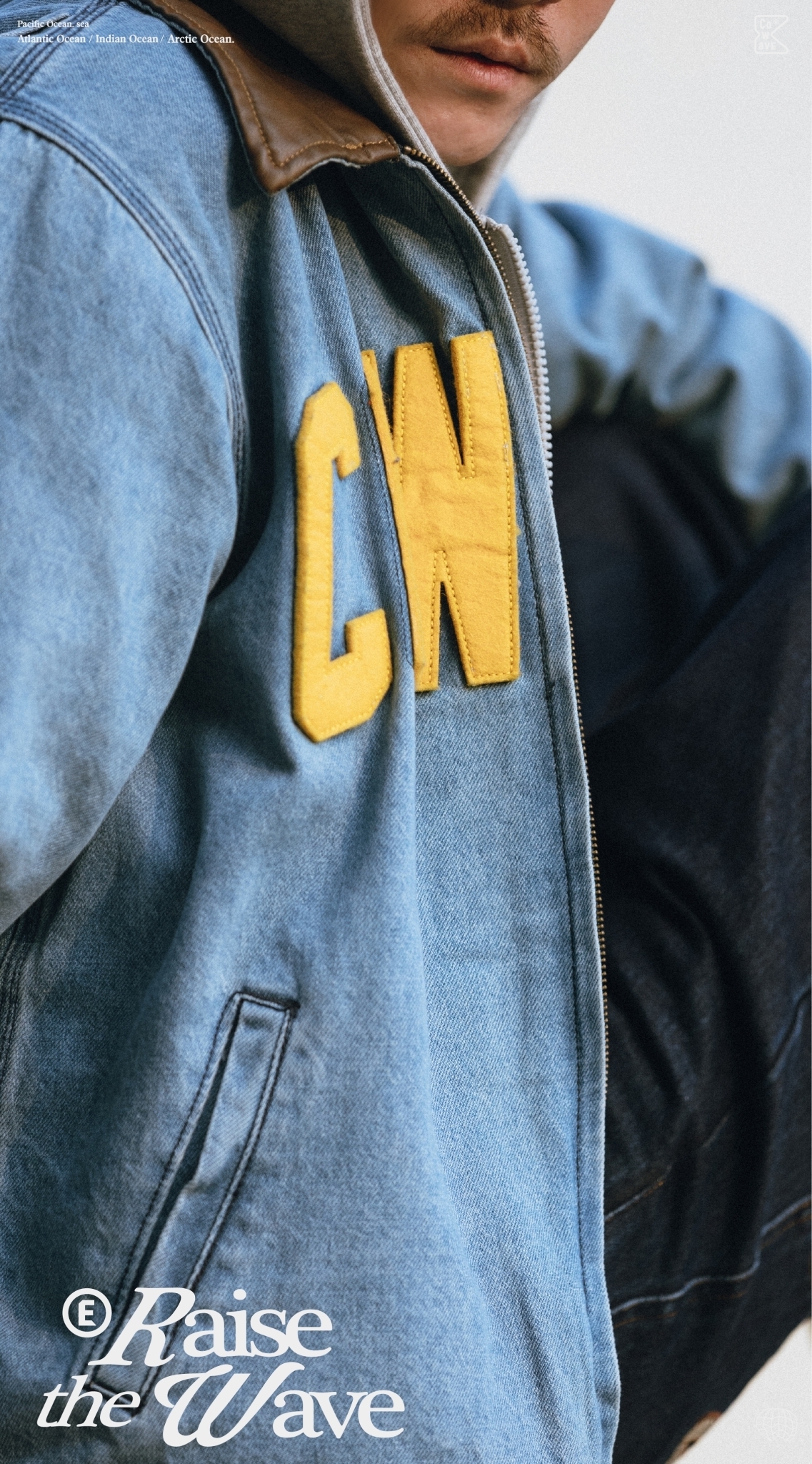 此款外套以經典底特律夾克為藍本,進行現代化改良,採用寬短版型剪裁,優化身形比例。不同於傳統工裝服飾常用的斜紋布或朱帆布,本設計選用 16oz 水洗藍重磅牛仔布,搭配質感棕色皮革領子,增添層次與精緻感。面料經過刷色洗水工藝,呈現經典淺藍色調,並透過重水洗處理,賦予單寧布料豐富的層次感。