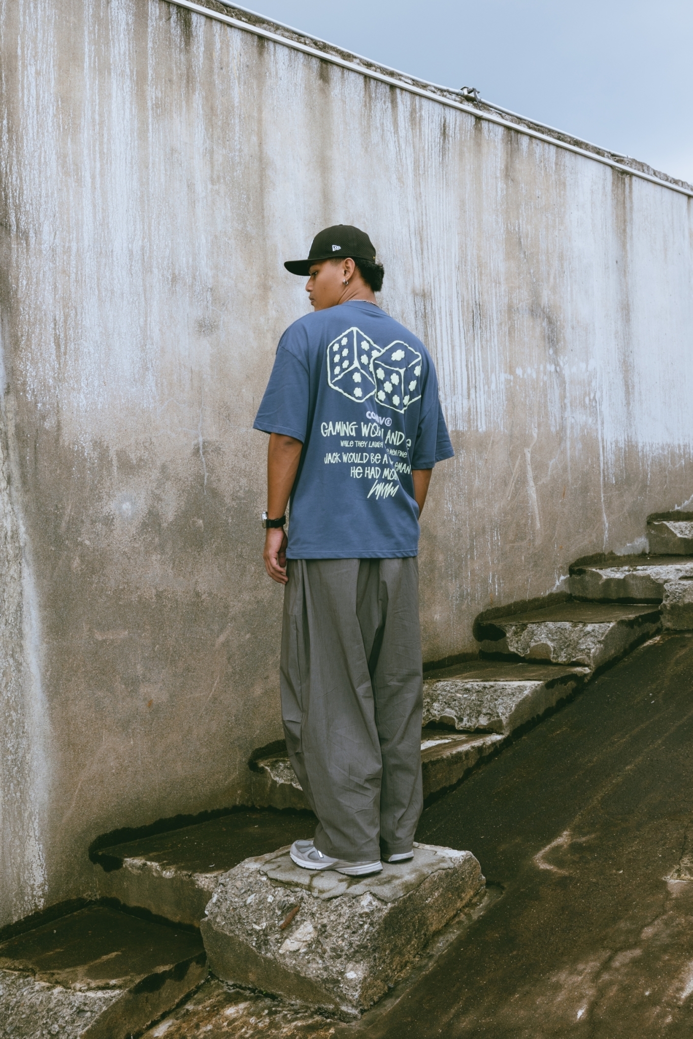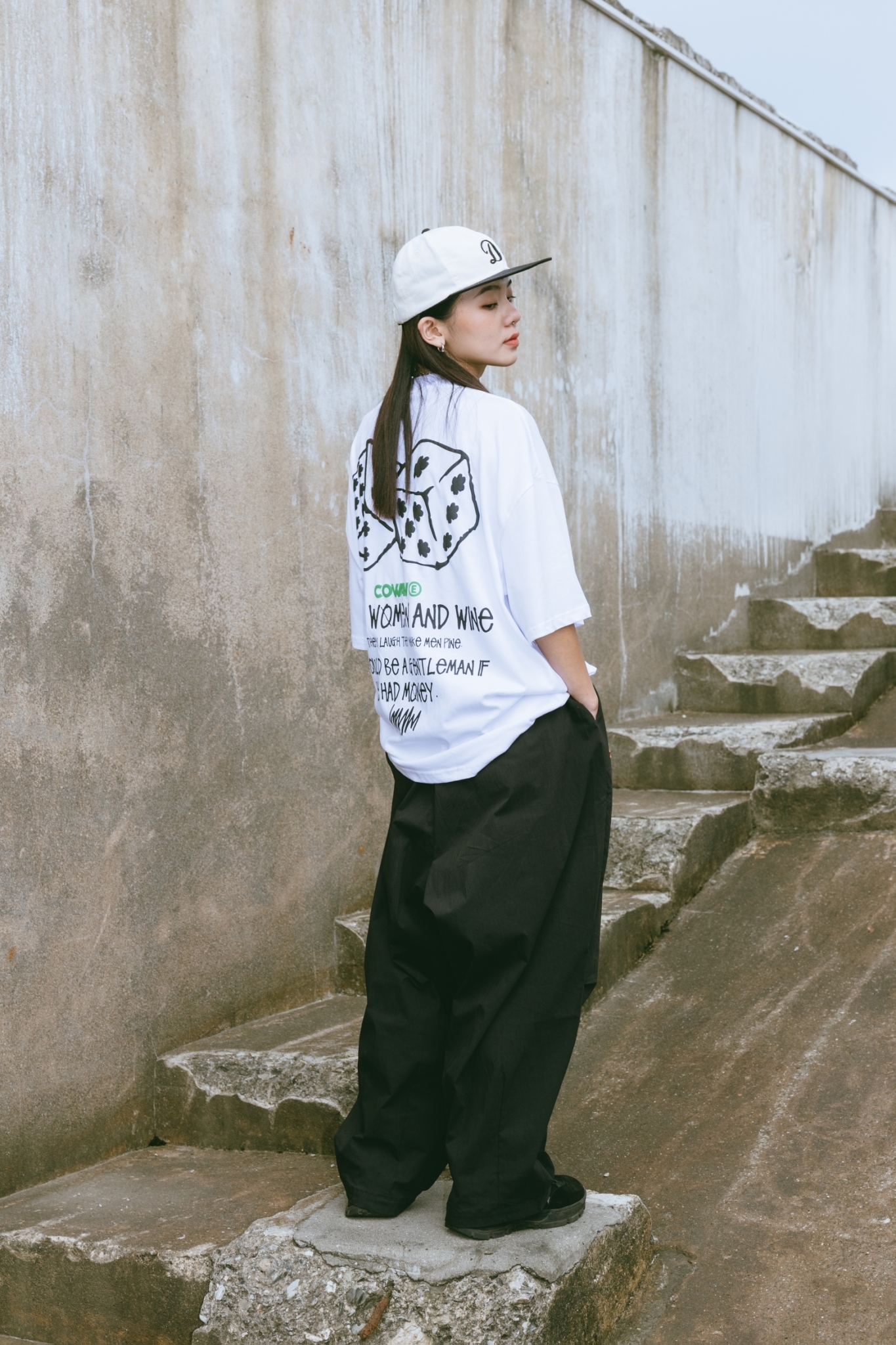 此款T-shirt以『金錢、賭、窮』探討現今社會的缺陷延伸,並以『Gaming, women, and wine, while they laugh they make men pine.遊戲、女人和酒使男人嚮往』貫穿整個圖像,詮釋出金錢對於個人內心的影響。