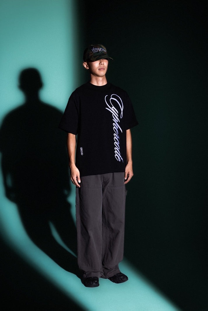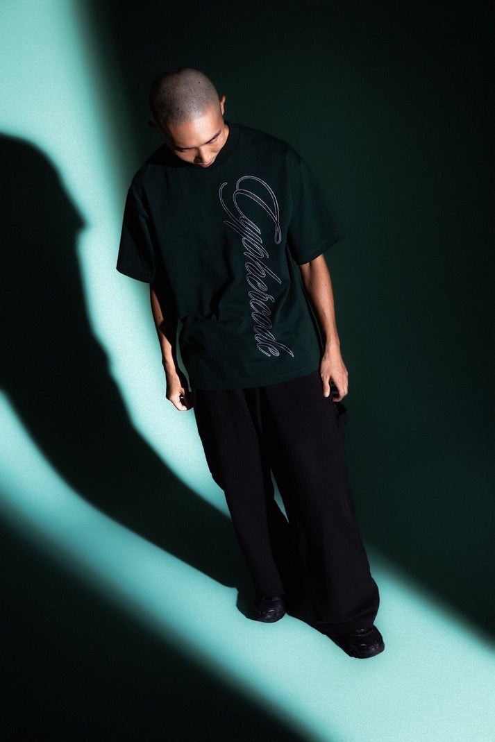 身体の“動きの軌跡”をなぞるような、縦書きのスクリプトロゴが印象的なTシャツ。