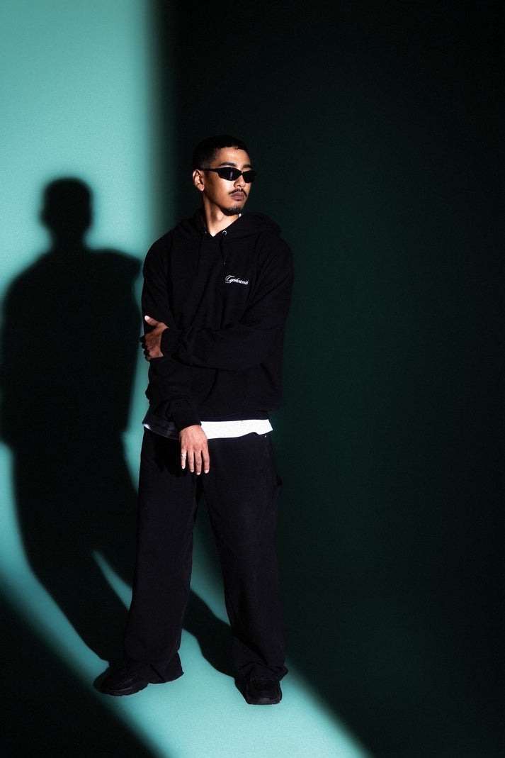 今季のテーマを象徴する“流れるようなロゴ”を、袖から肩・背中にかけて大胆にレイアウトしたフーディ。