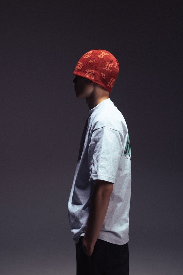 Old Englishロゴが浮遊するように編み込んだ定番ビーニー。