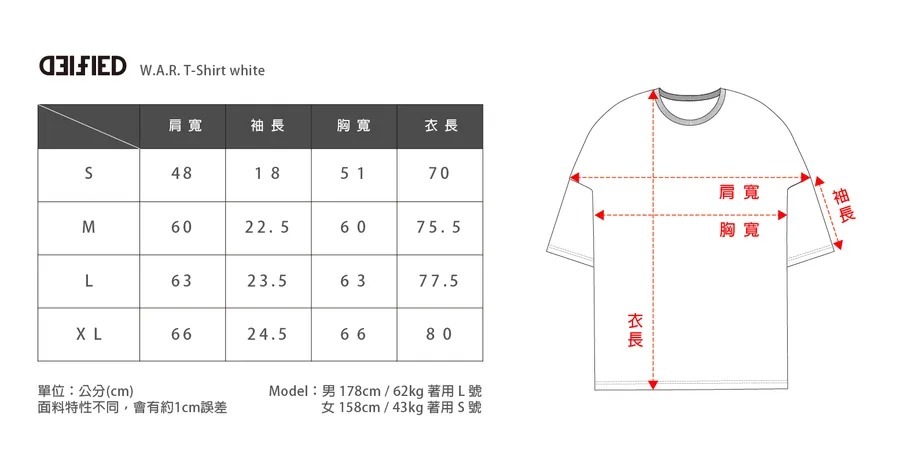 胸寬:1(S) 51 / 2(M) 60 / 3(L) 63 / 4(XL) 66