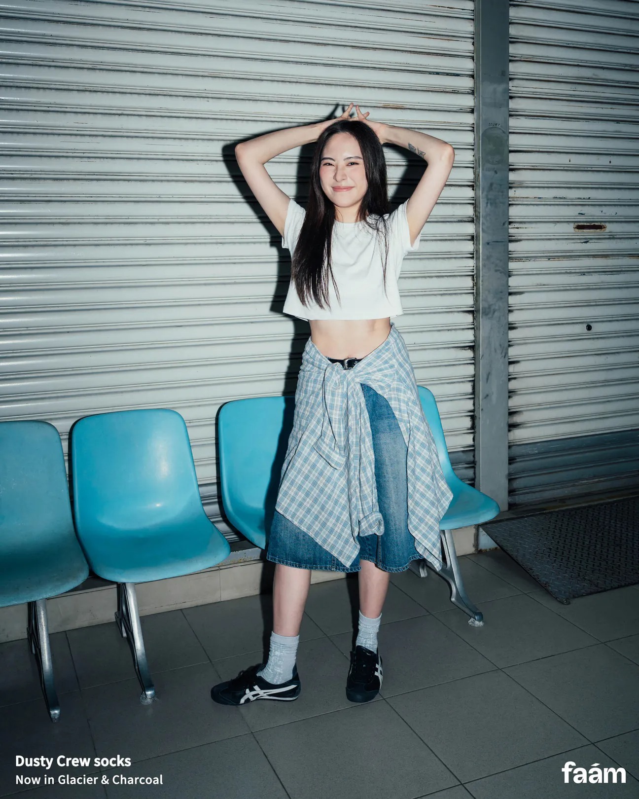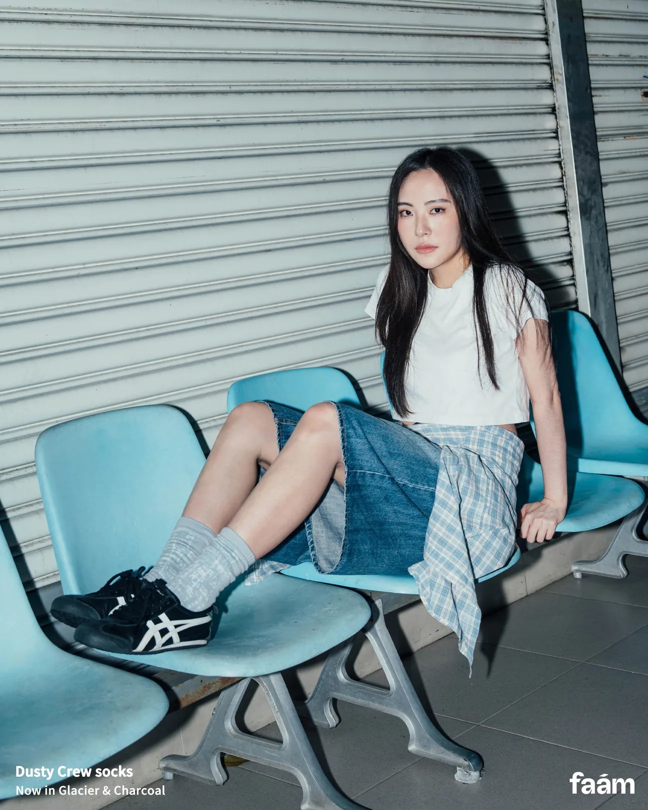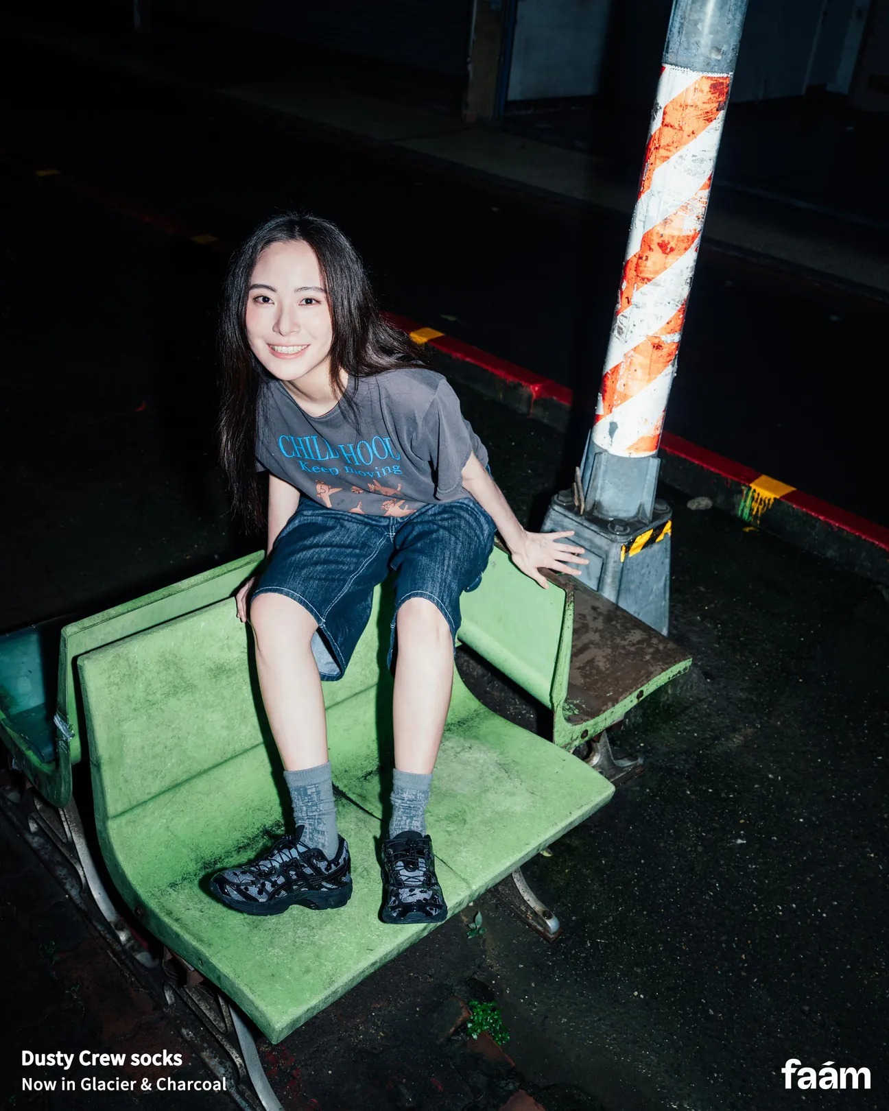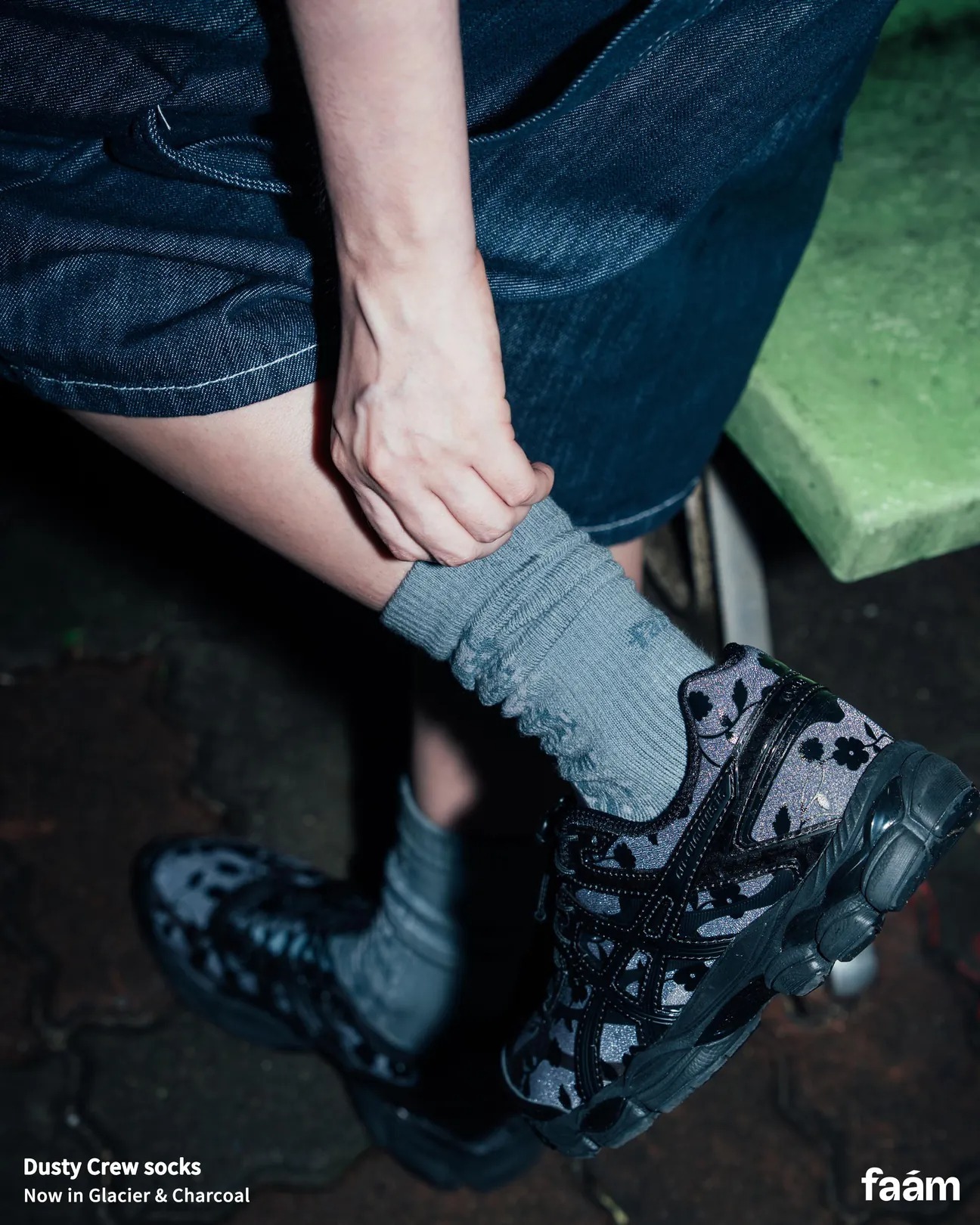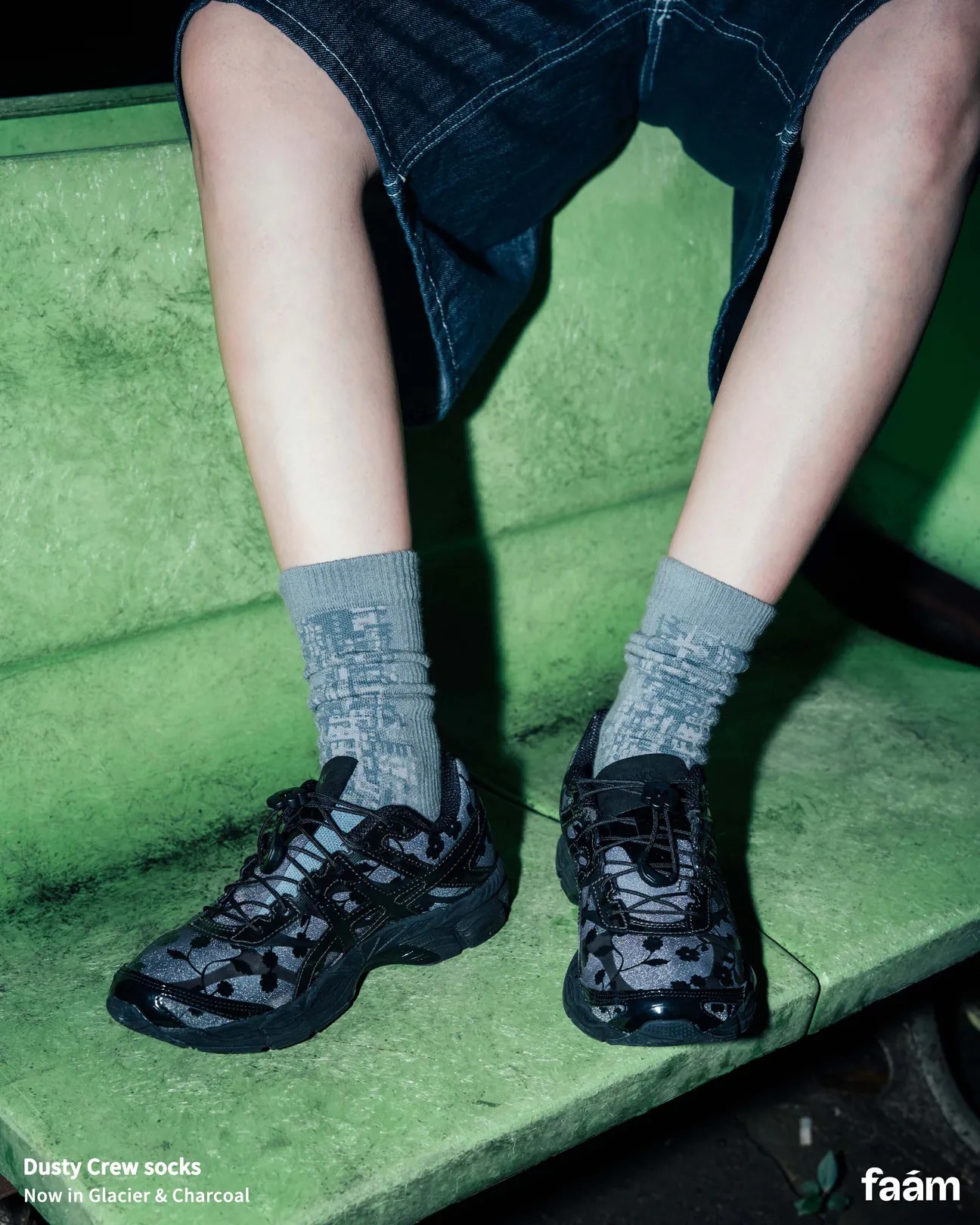 我們重新帶回過往熱銷的 DUSTY 針織高筒襪,這次注入全新配色 —— 深灰與冰川藍,透過提花工藝呈現斑駁紋