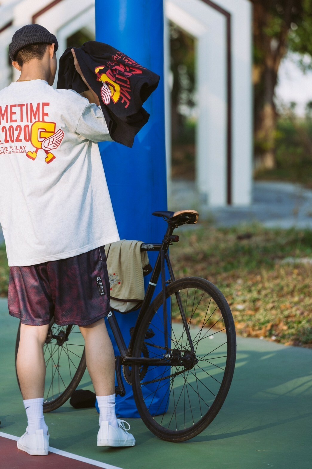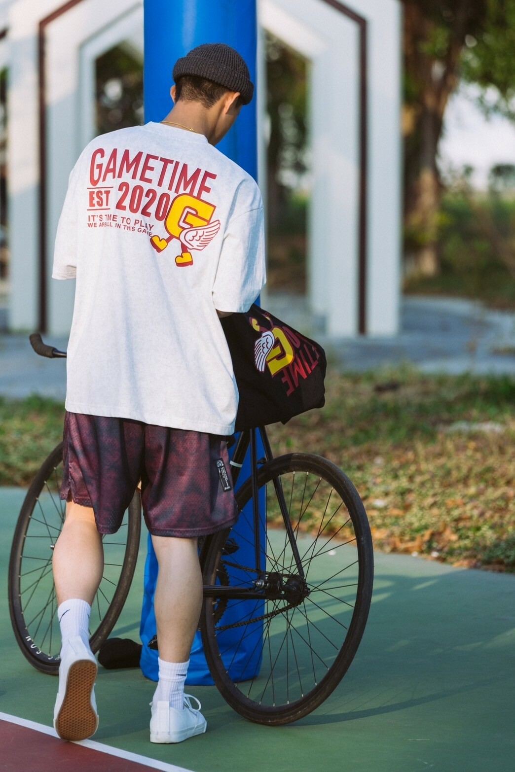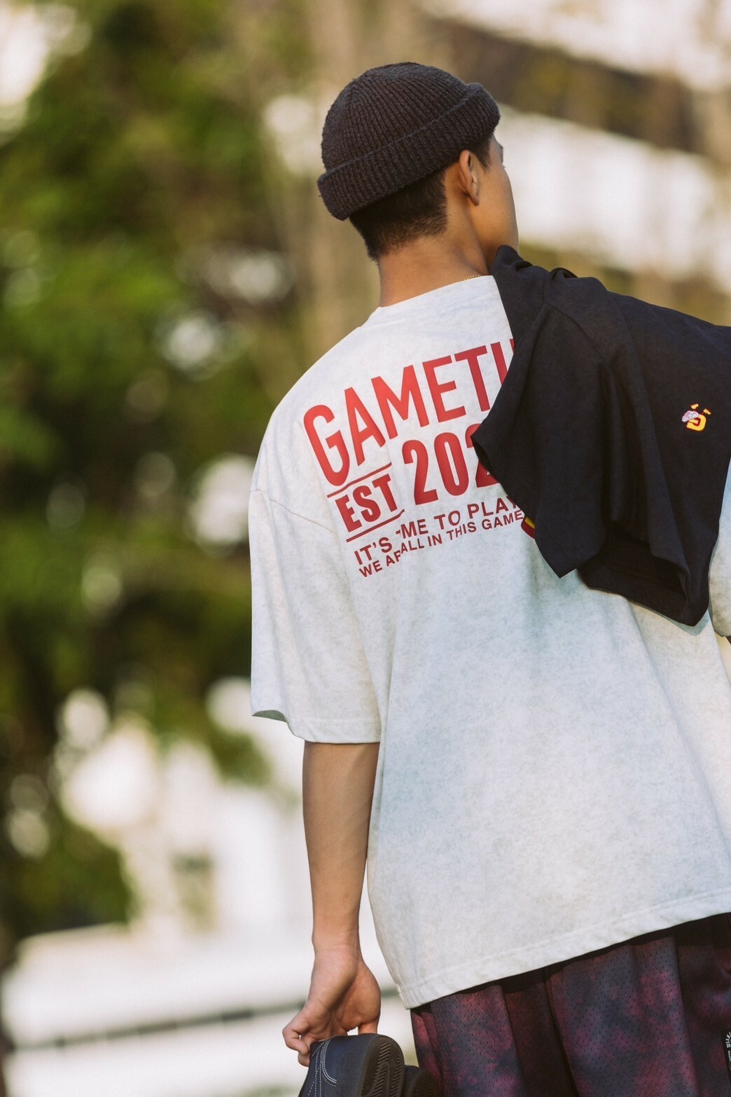 本次GAMETIME開季T-shirt以美式復古風格為設計靈感,主體面料採用蠟染工藝,營造出濃厚的復古氛圍,並巧妙融入美式插圖元素。在細節設計上,正面左胸位置加入字母G插畫角色,並以精緻的刺繡呈現。背面則運用了美式廣告排版風格,大文字排版巧妙結合字母G插畫角色,與正面設計相呼應,營造出和諧的復古風格。