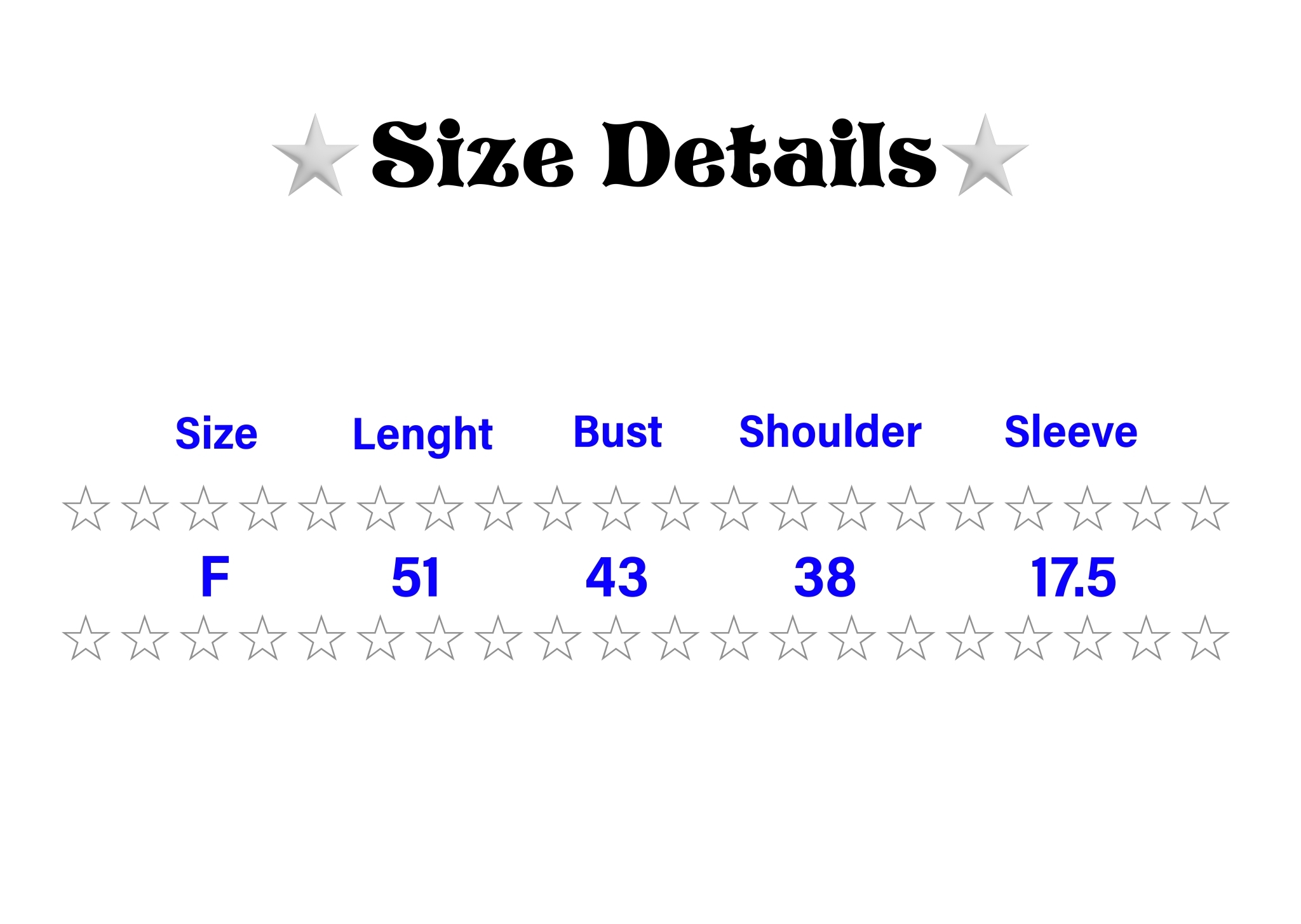 F: Length 51cm / Chest 43cm / Shoulder 38cm / Sleeve 17.5cm