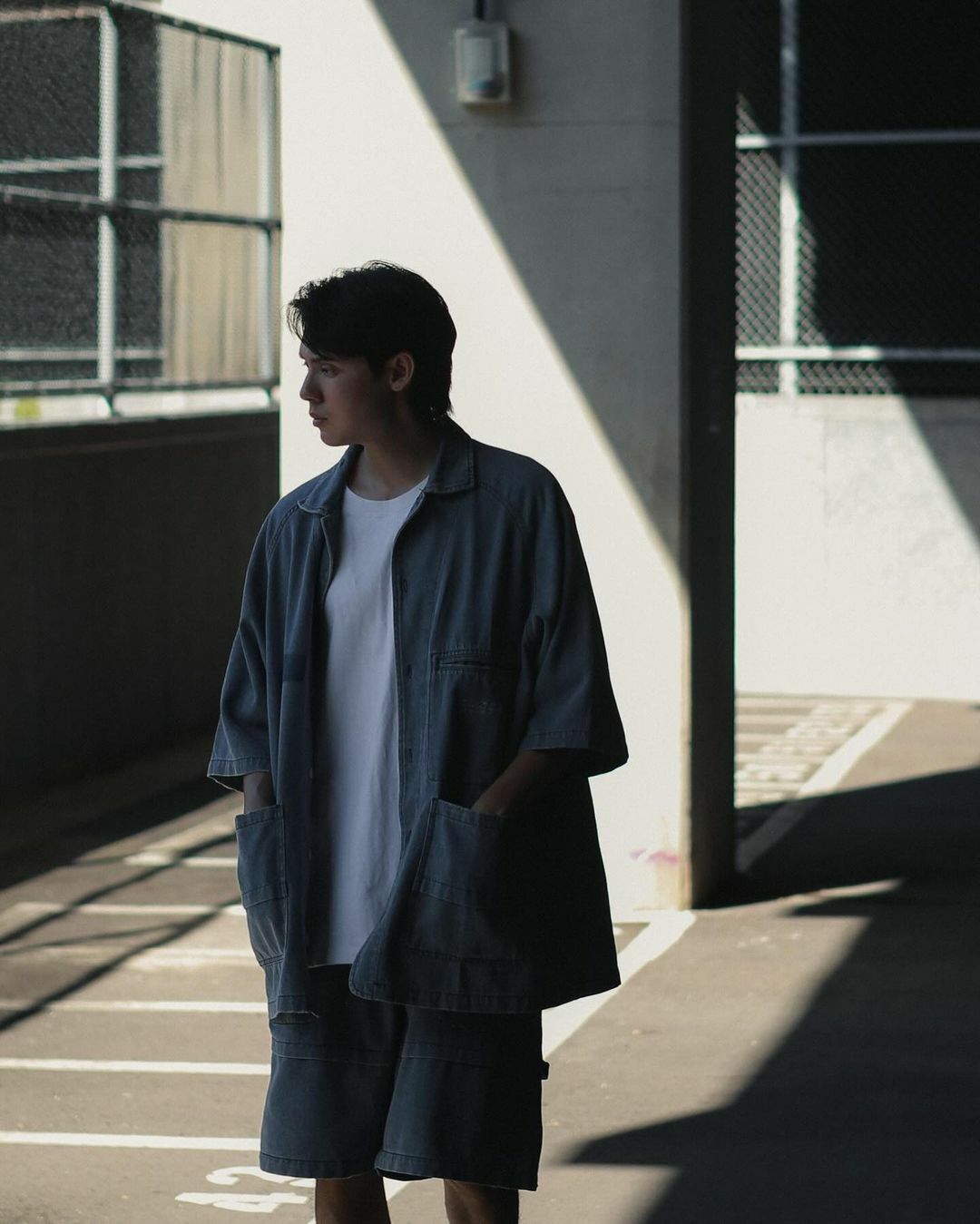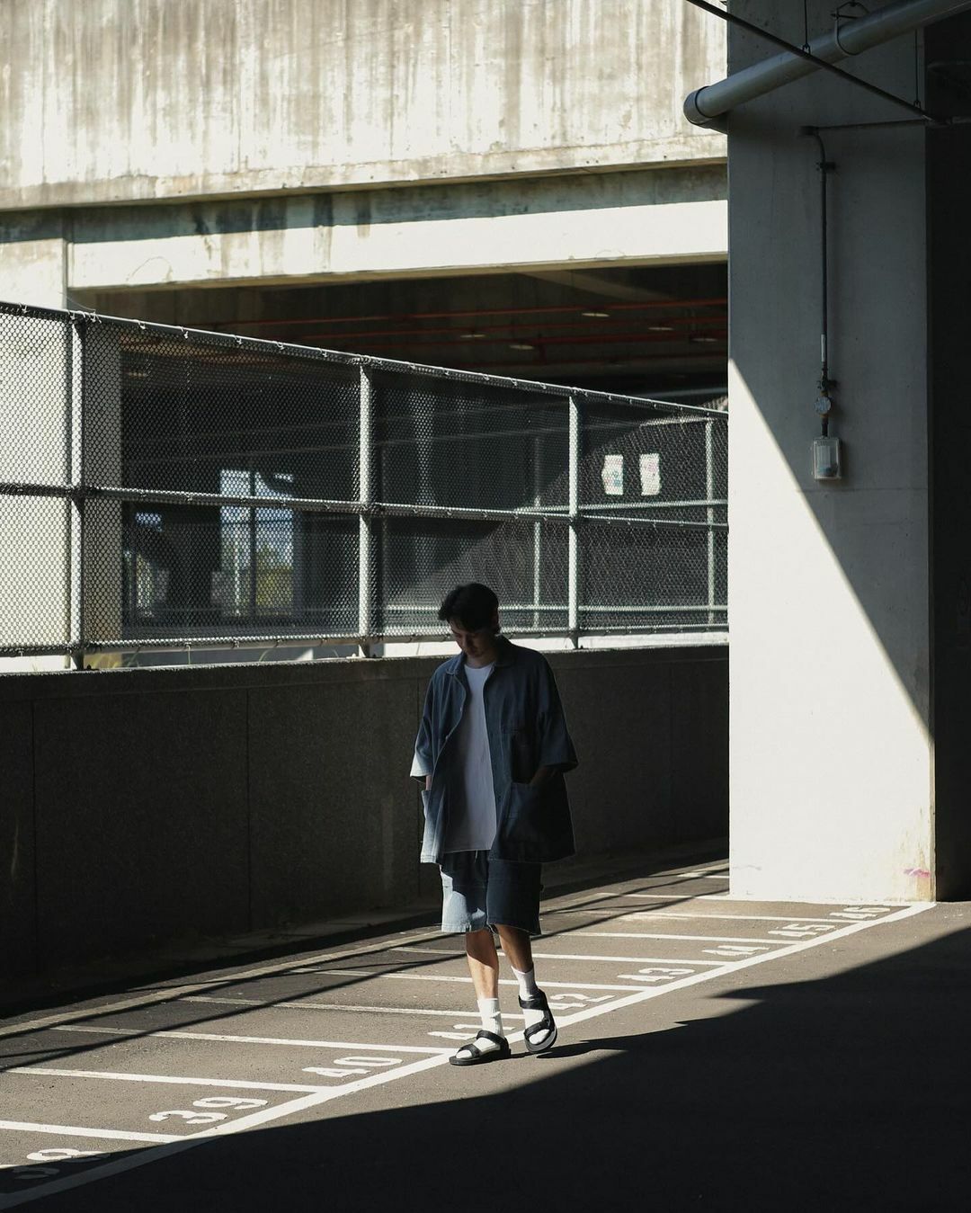 上身以連肩休閒襯衫為輪廓,下身則以扇型褲為基底,在工裝的硬挺表象之下,展現著簡單俐落的休閒調性。