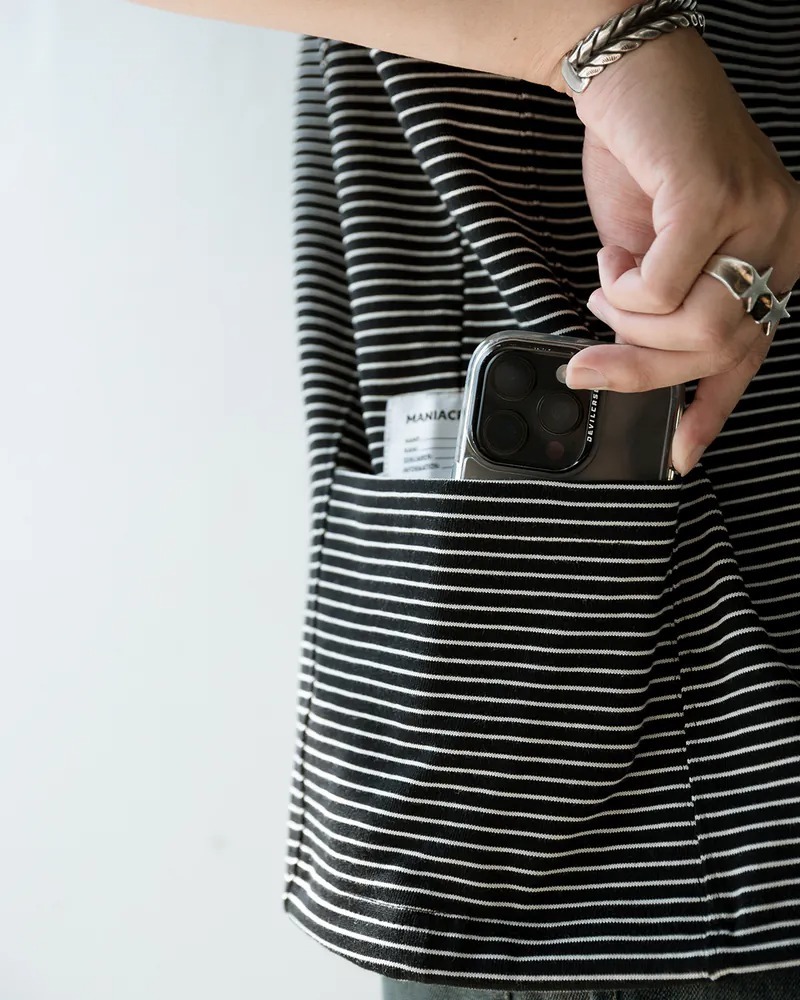 搭配側邊對條紋置物袋與下擺可調節設定,