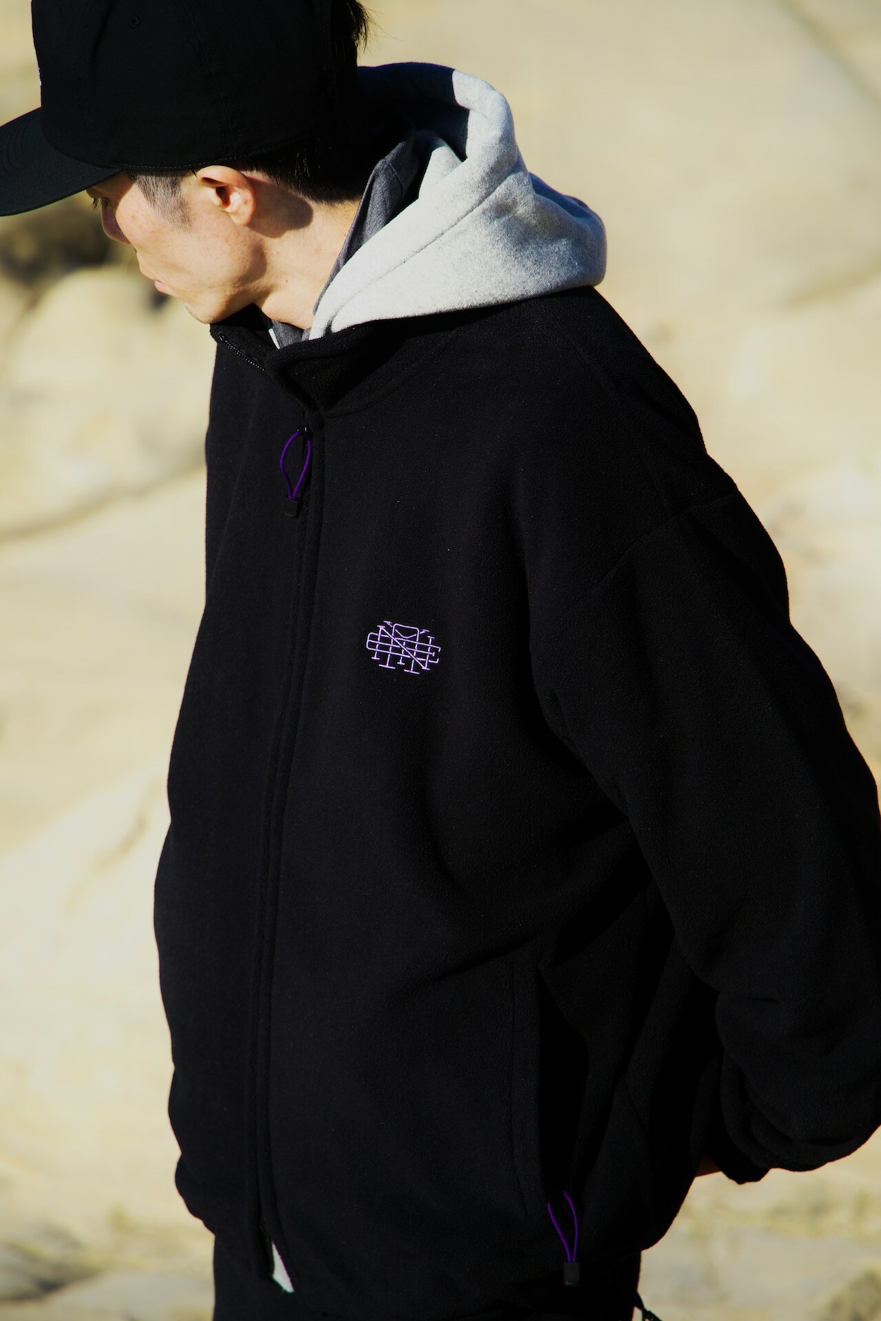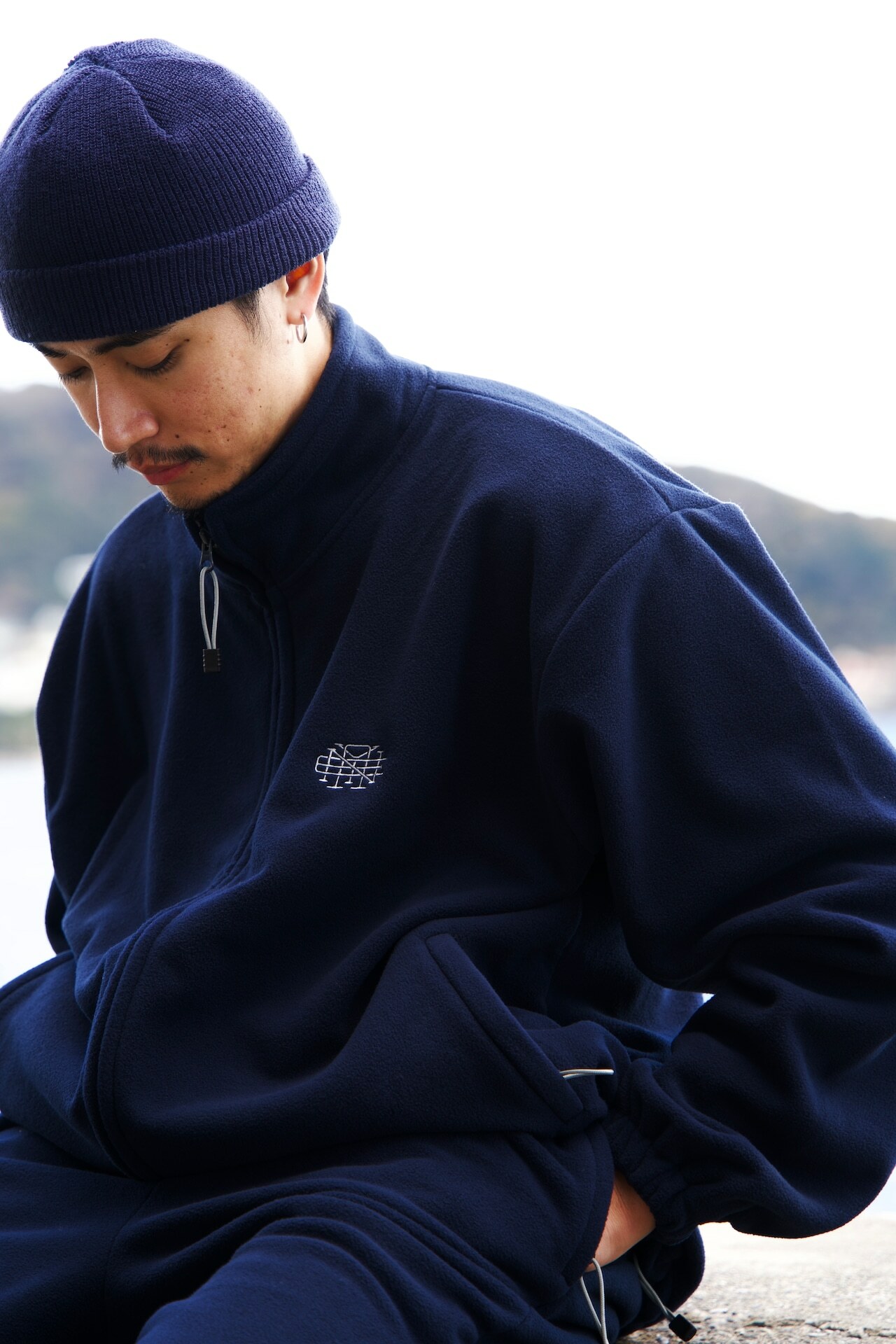 スタンドカラーのフリースジャケットです。身幅太めで着丈は控えめ。