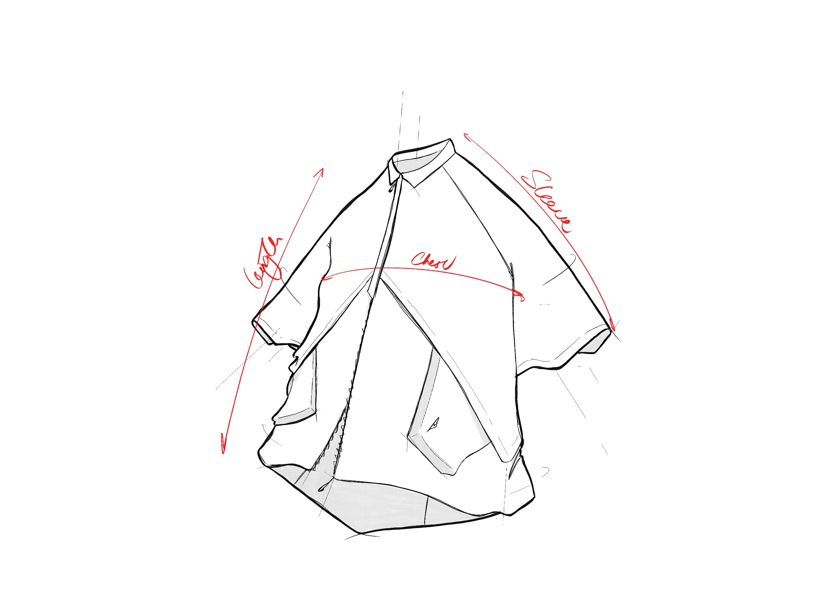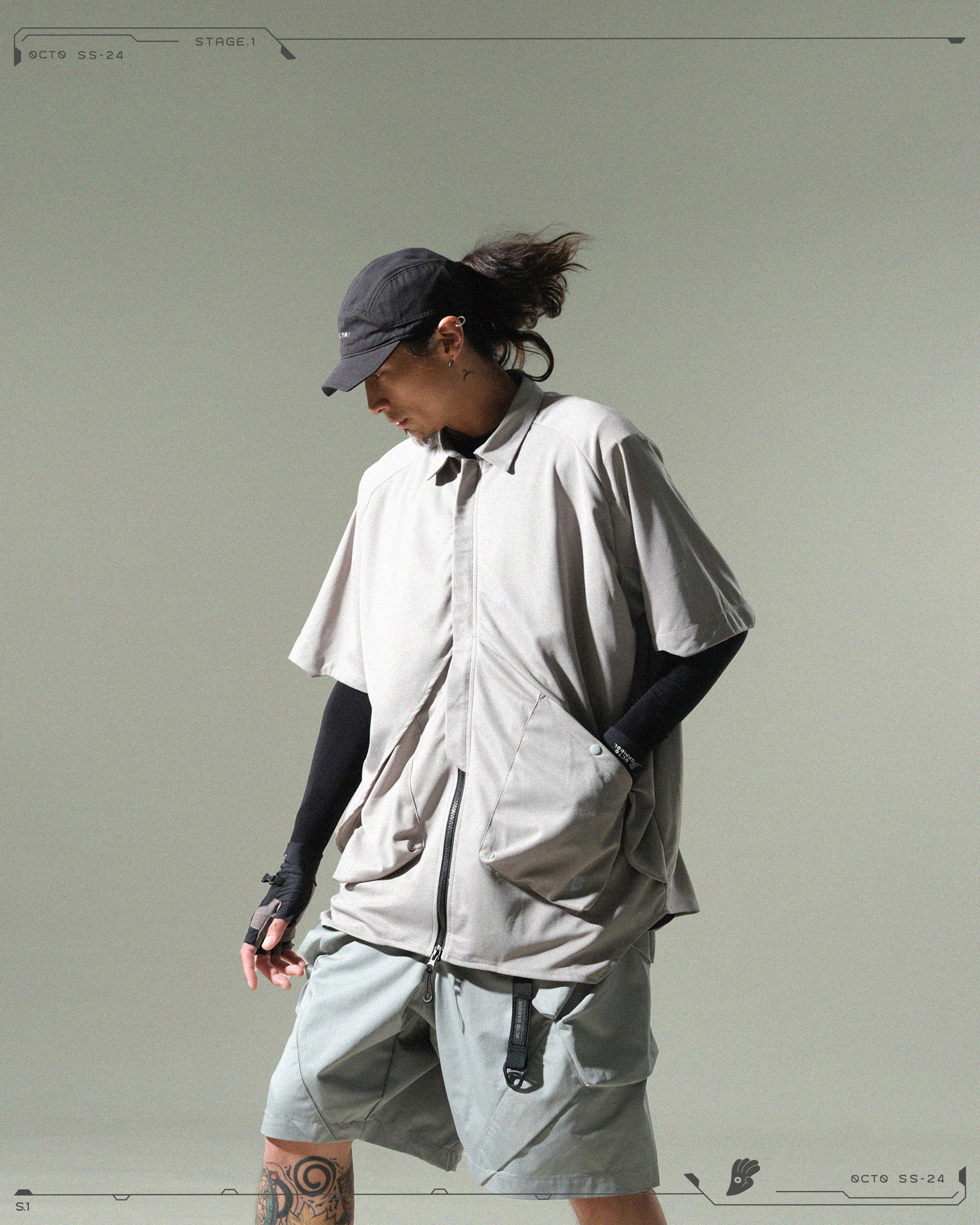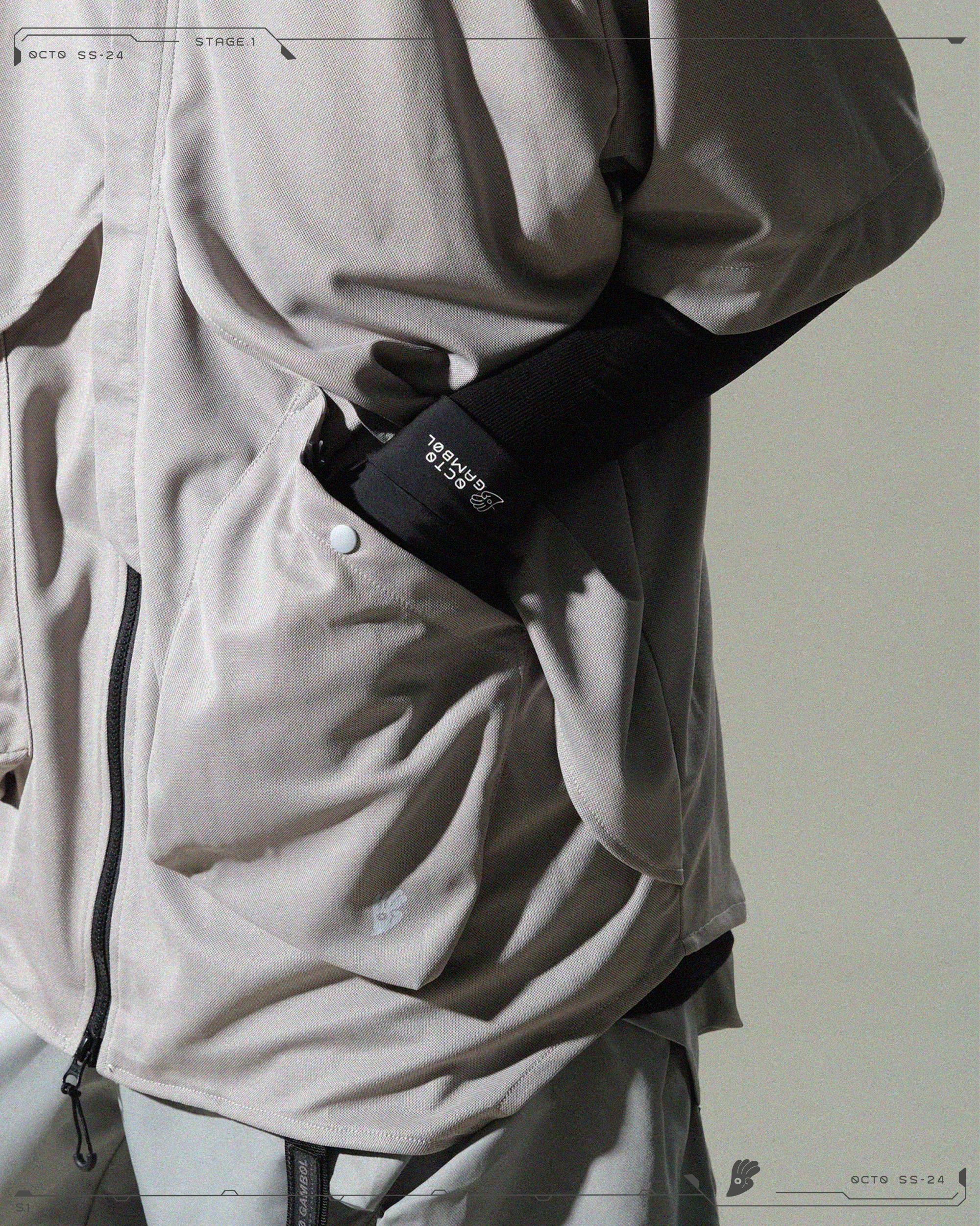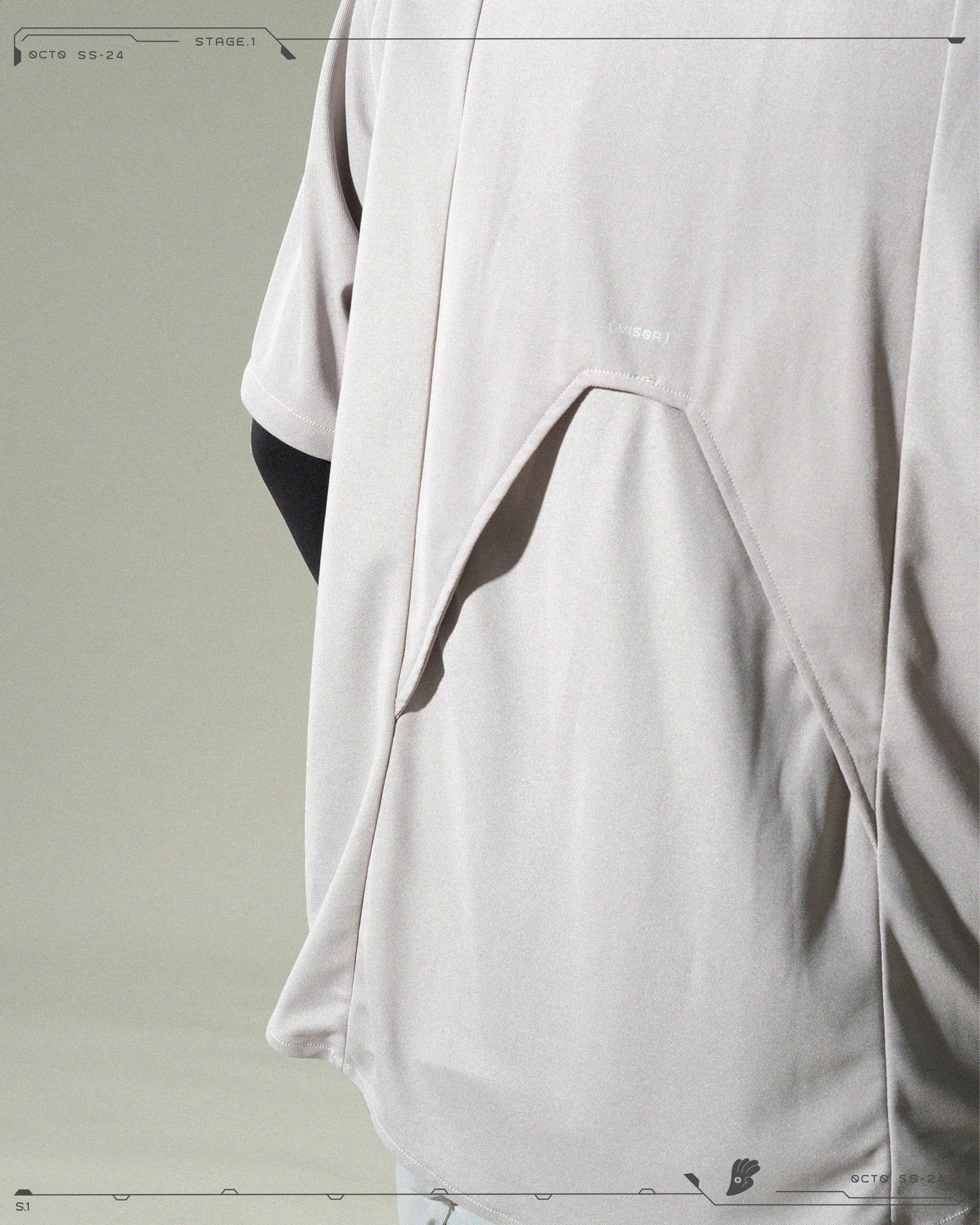 > 正面具有雙立體口袋向上延伸,利用不同層次呈現一體性