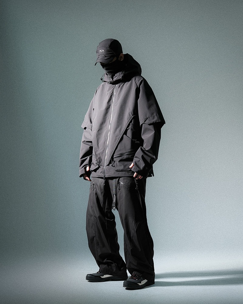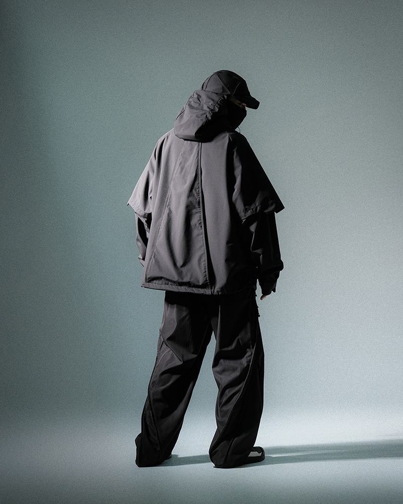 _正面品牌極具代表性梯形遮擋,與假兩件式衣袖配合展現品牌代表性梯形幾何特色