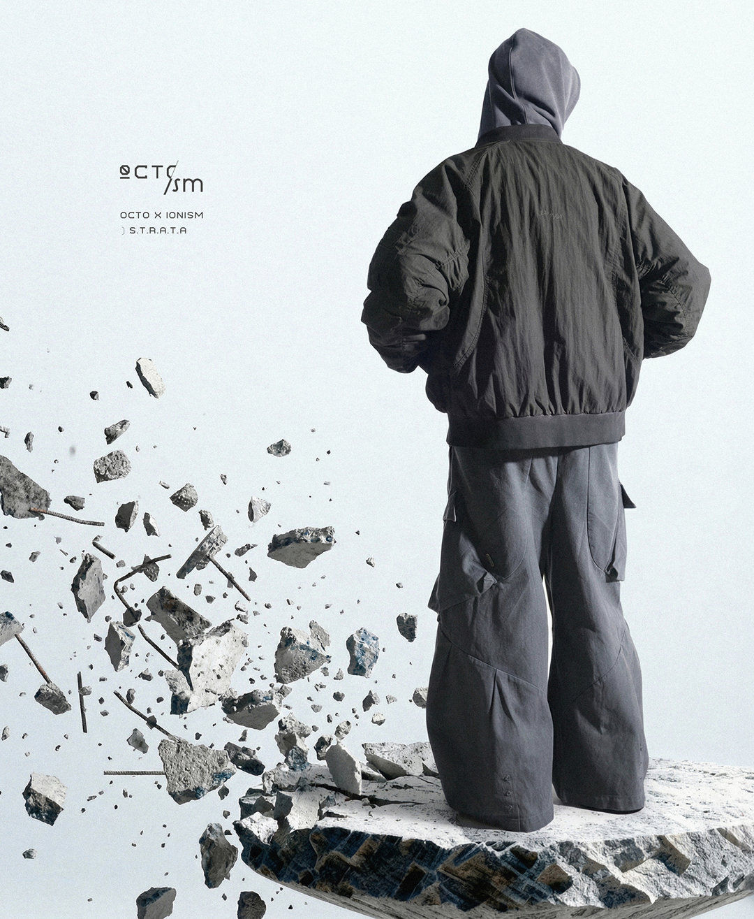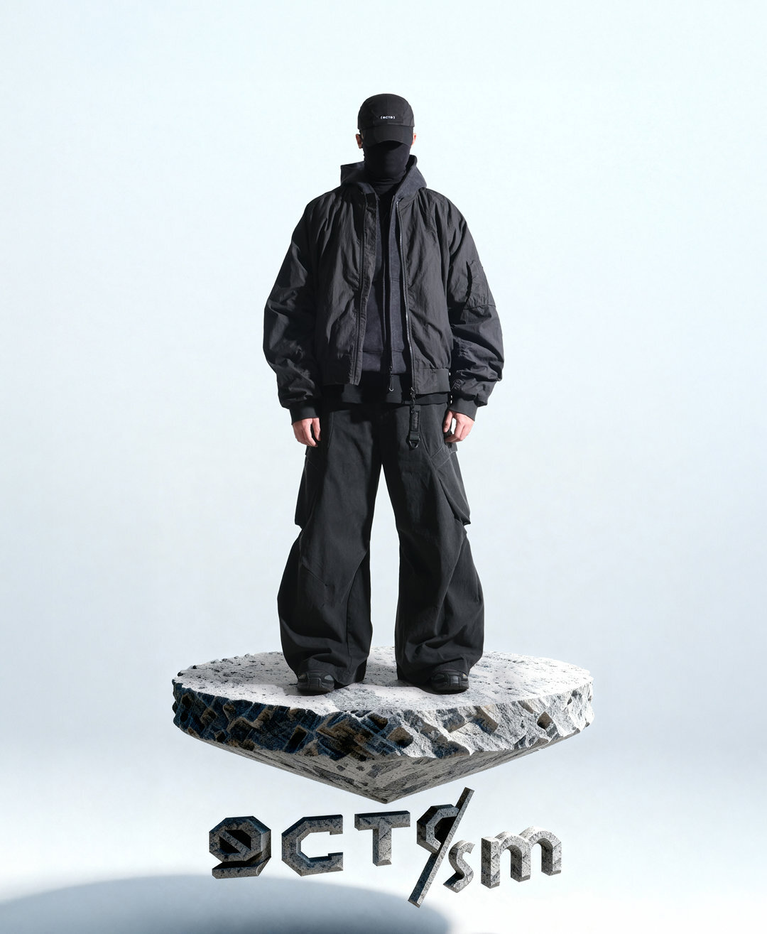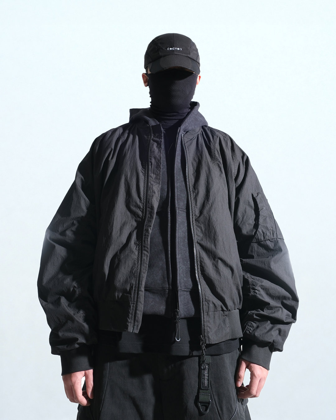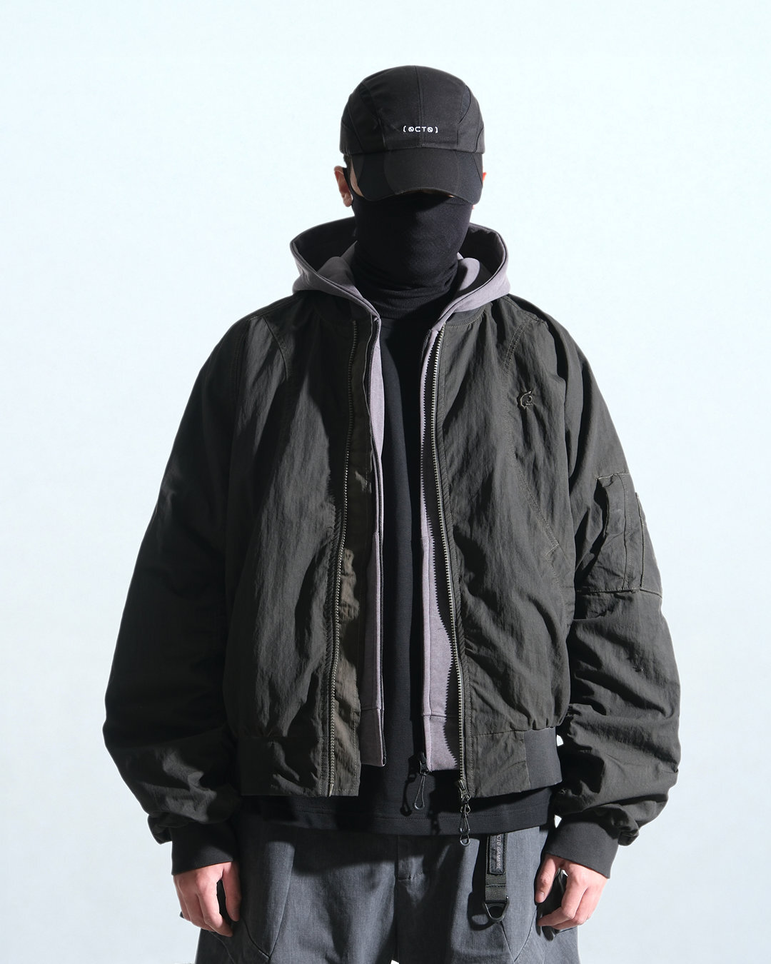 透過洗水質感、弧形拼接與壓縮式量感打造「地形曲面 × 未來機能」的獨特外套輪廓。