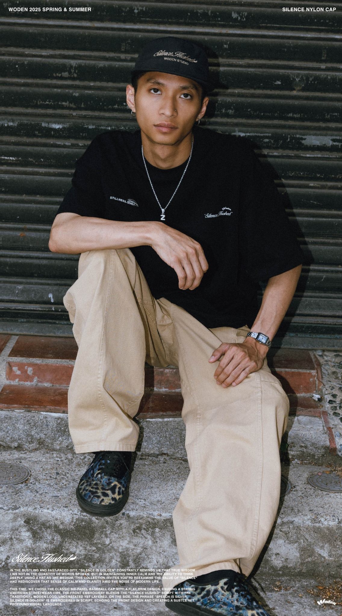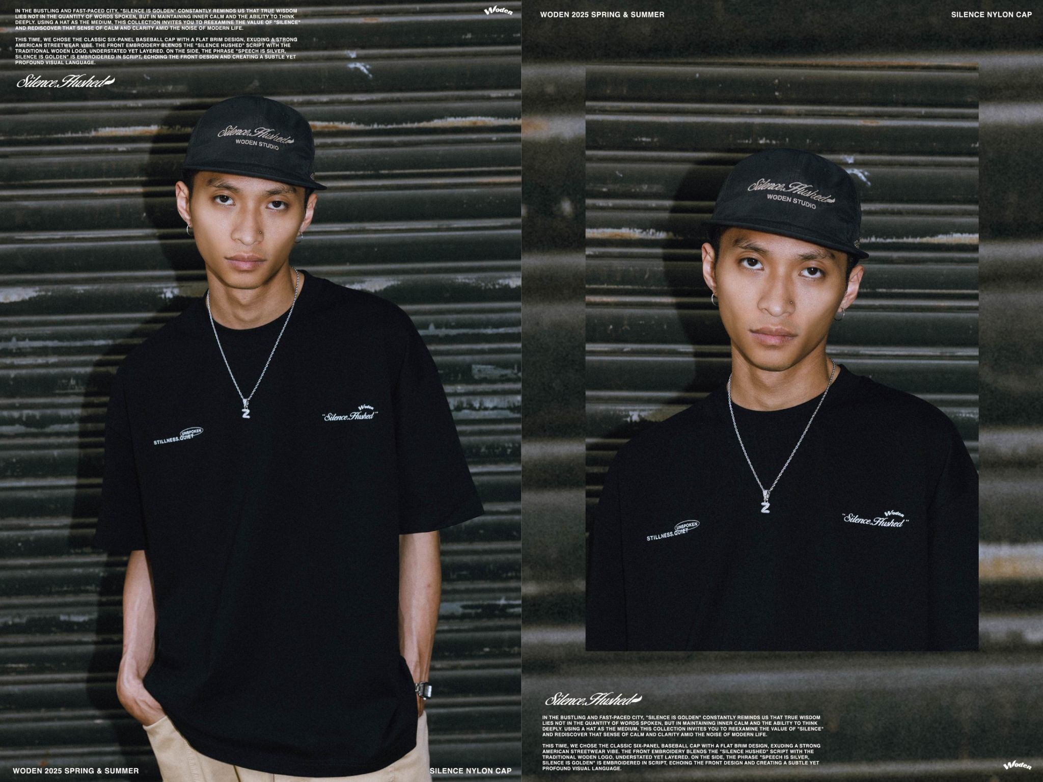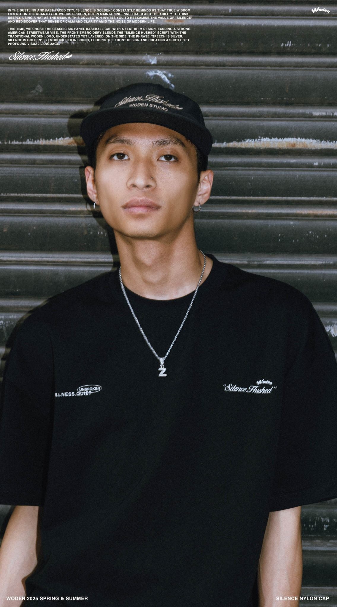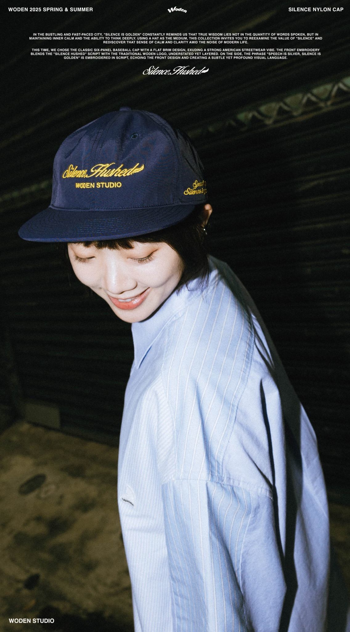 本次帽型選用經典六分割棒球帽,搭配平帽沿設計,散發濃厚的美式街頭氣息。正面刺繡將「Silence Hushed」書寫字體與 WODEN 正體字融合,低調卻富有層次;側邊則以「Speech is silver, Silence is golden」——沈默是金——的書寫字排版,與正面設計相呼應,構築出內斂而深刻的視覺語言。