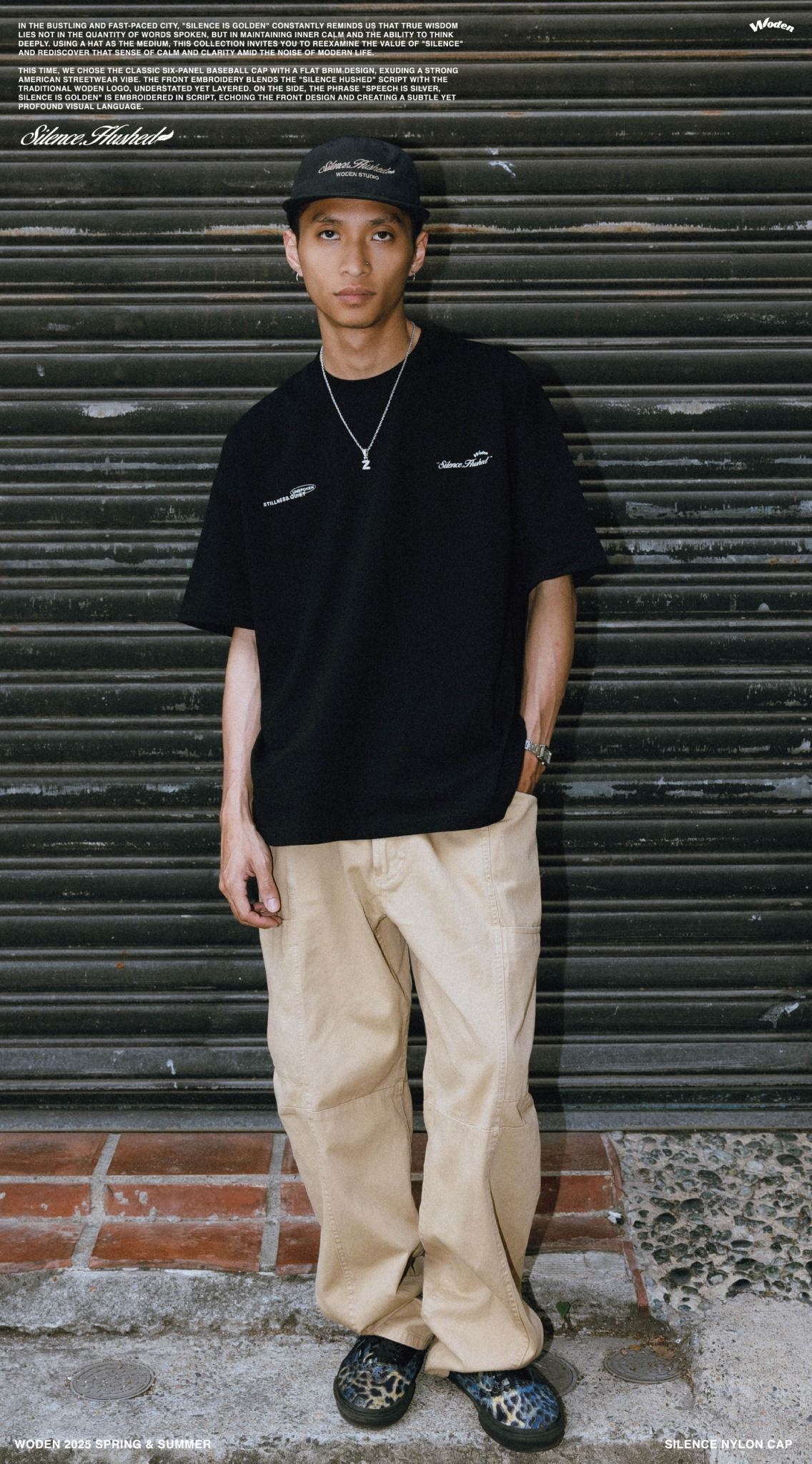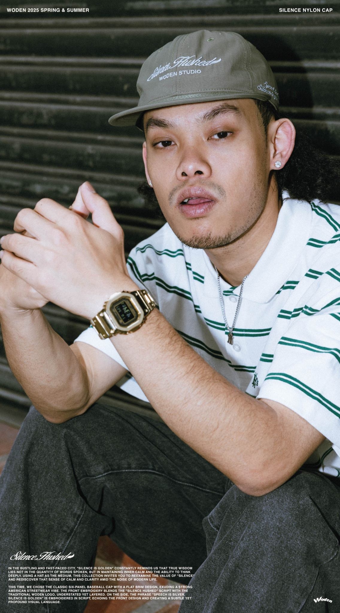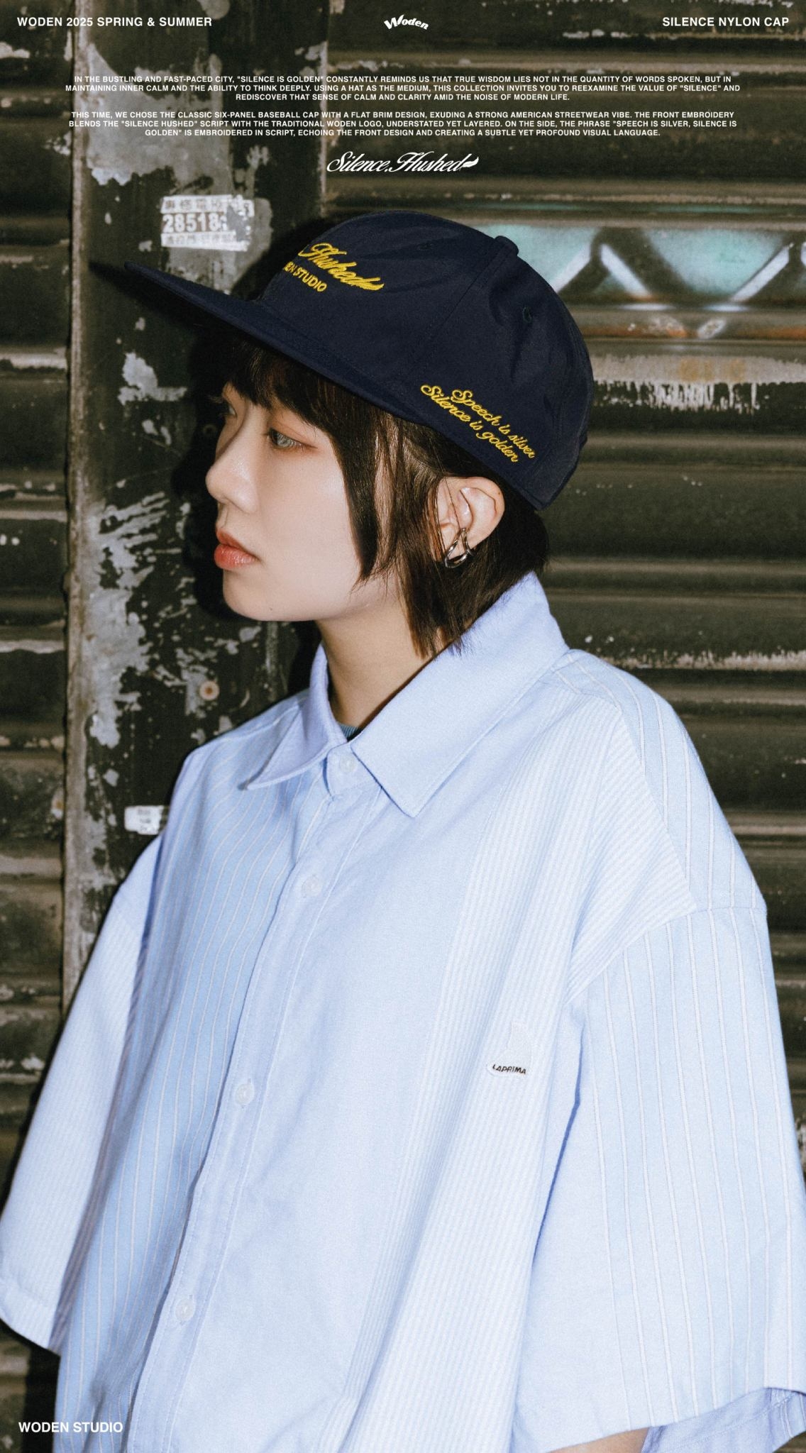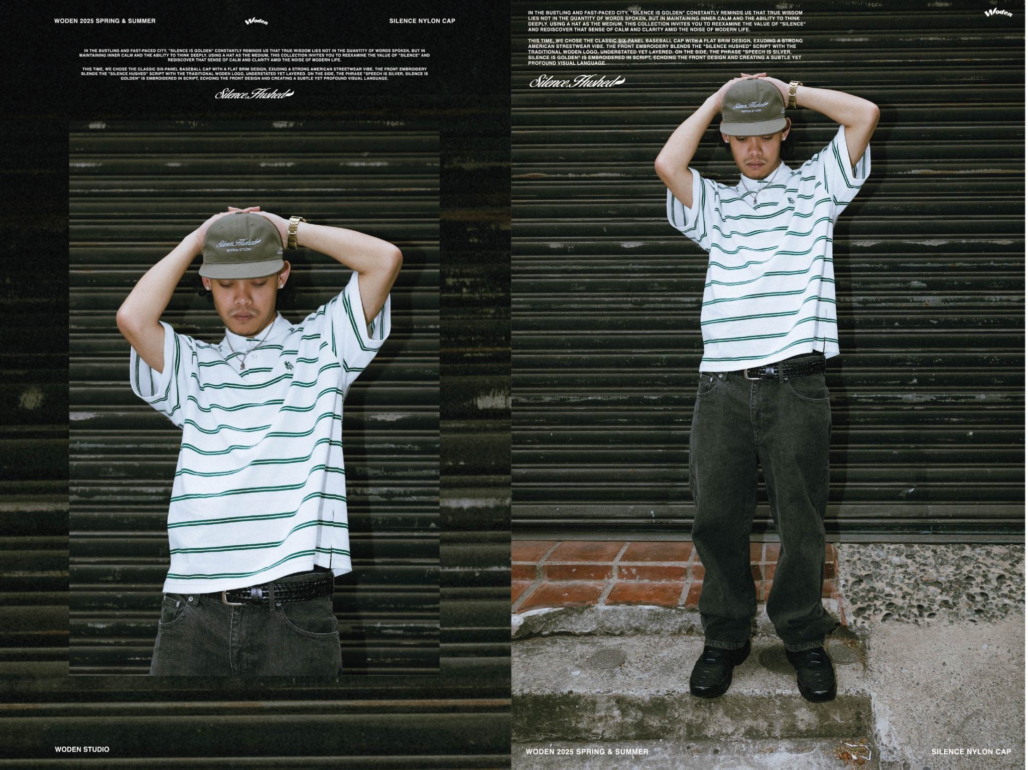 本次帽型選用經典六分割棒球帽,搭配平帽沿設計,散發濃厚的美式街頭氣息。正面刺繡將「Silence Hushed」書寫字體與 WODEN 正體字融合,低調卻富有層次;側邊則以「Speech is silver, Silence is golden」——沈默是金——的書寫字排版,與正面設計相呼應,構築出內斂而深刻的視覺語言。