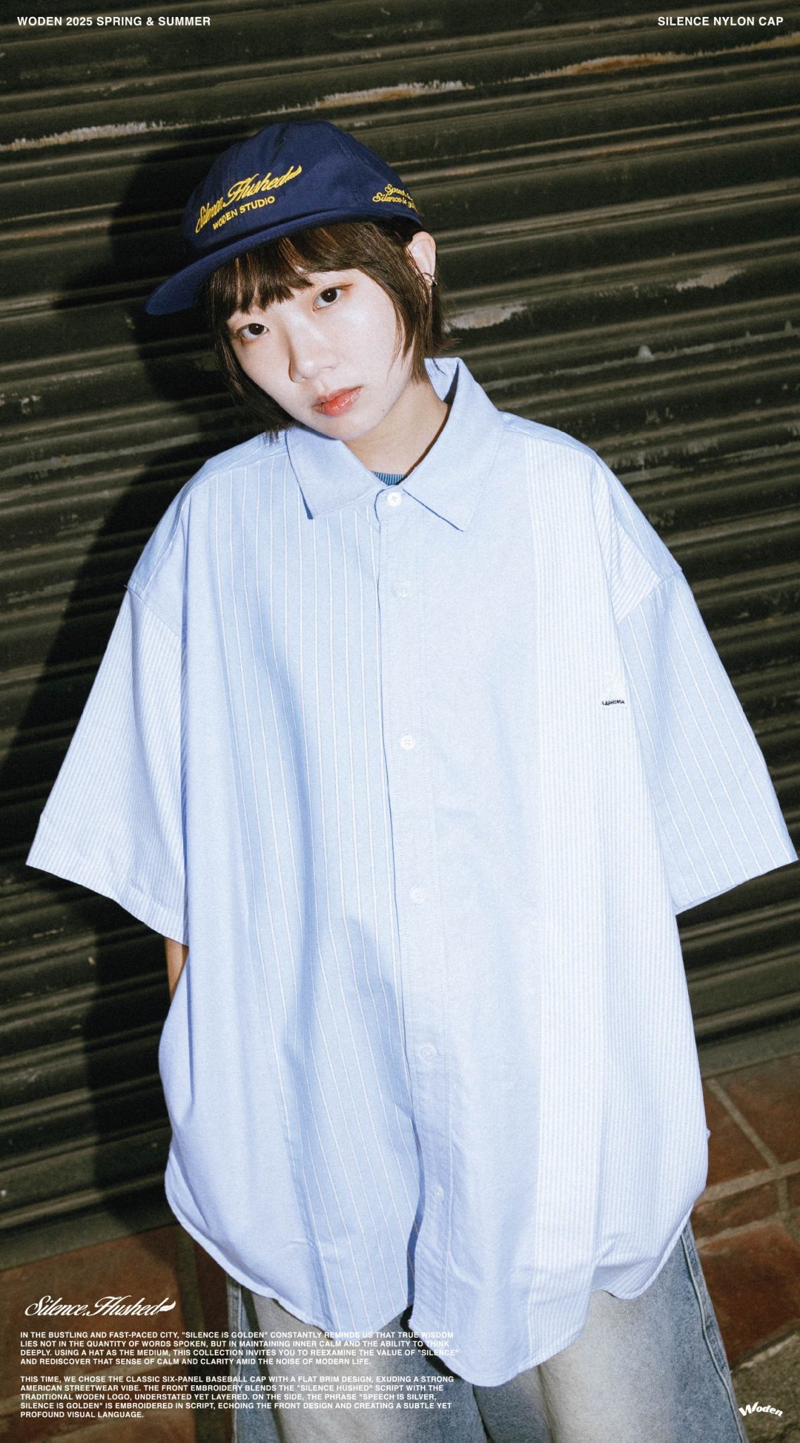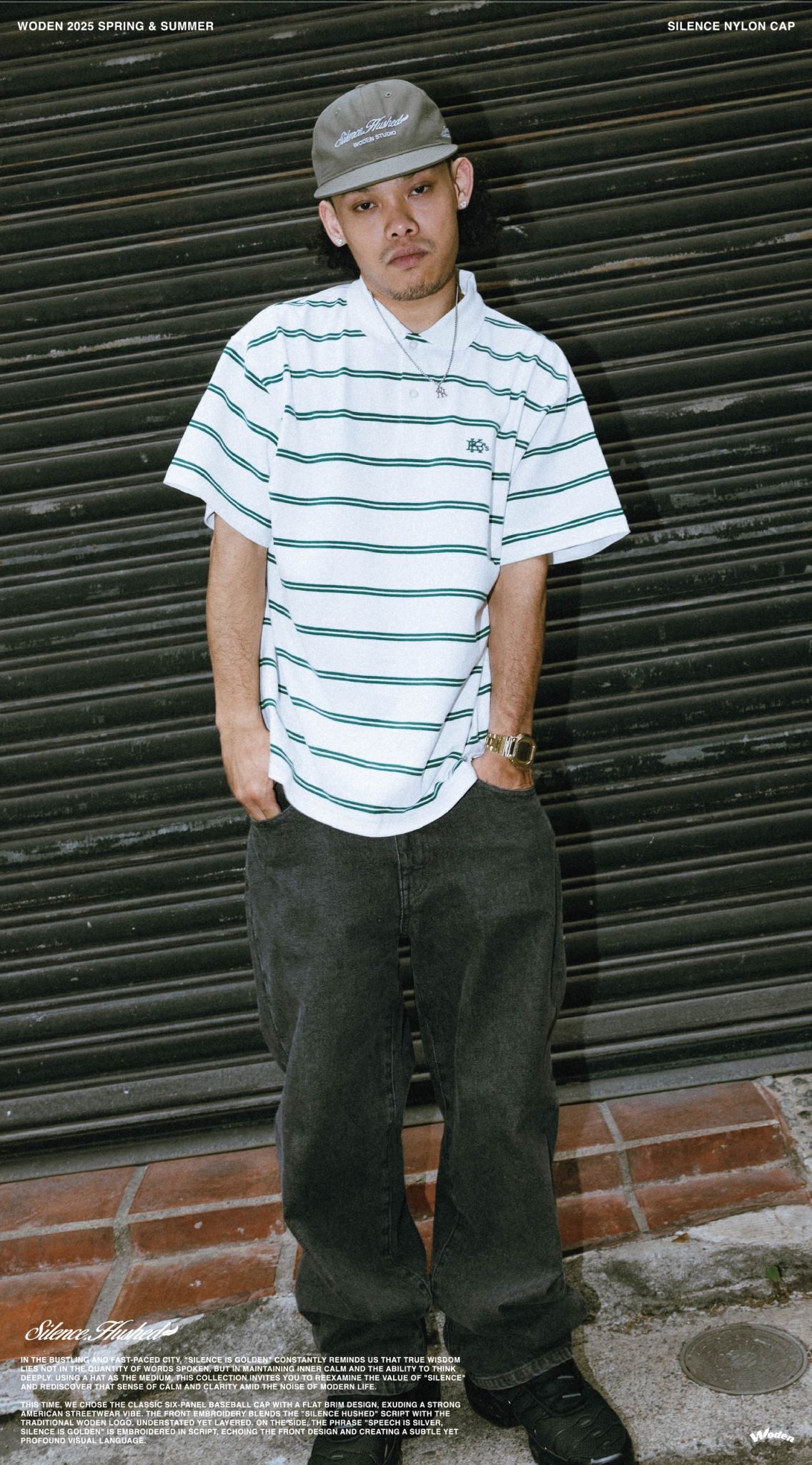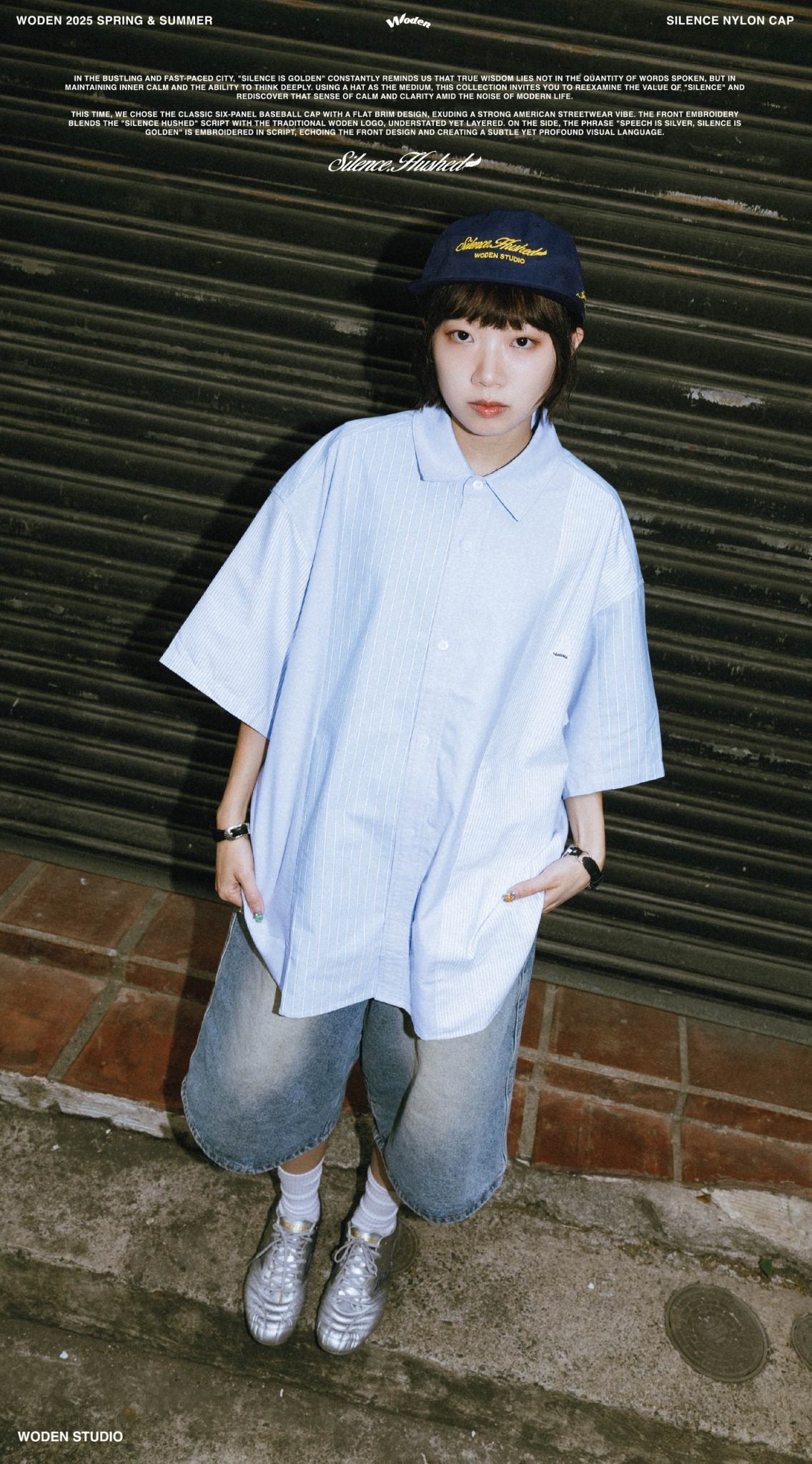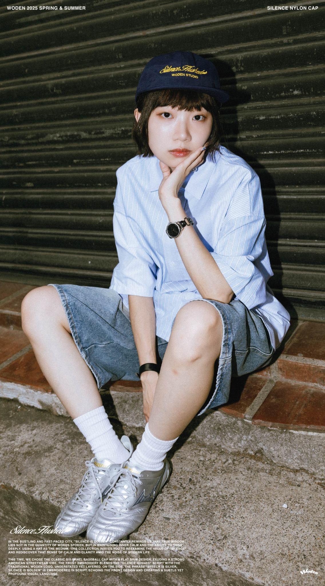 本次帽型選用經典六分割棒球帽,搭配平帽沿設計,散發濃厚的美式街頭氣息。正面刺繡將「Silence Hushed」書寫字體與 WODEN 正體字融合,低調卻富有層次;側邊則以「Speech is silver, Silence is golden」——沈默是金——的書寫字排版,與正面設計相呼應,構築出內斂而深刻的視覺語言。