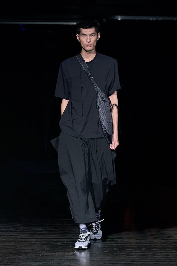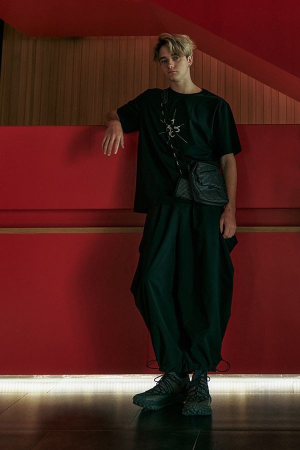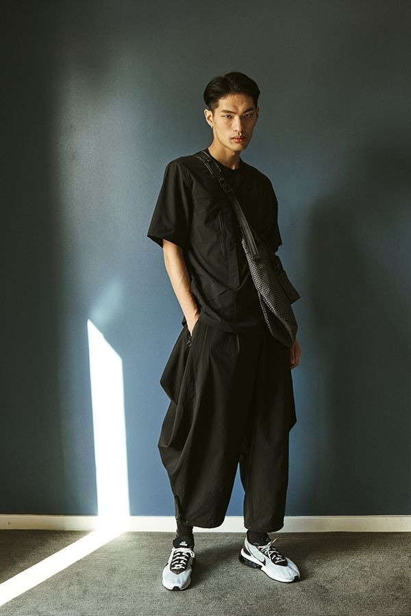 鈍角立裁片會隨活動呈現出不同樣貌,體與衣之間,飄逸而自由,褲口使用NIFCO扣具收尾調節結構