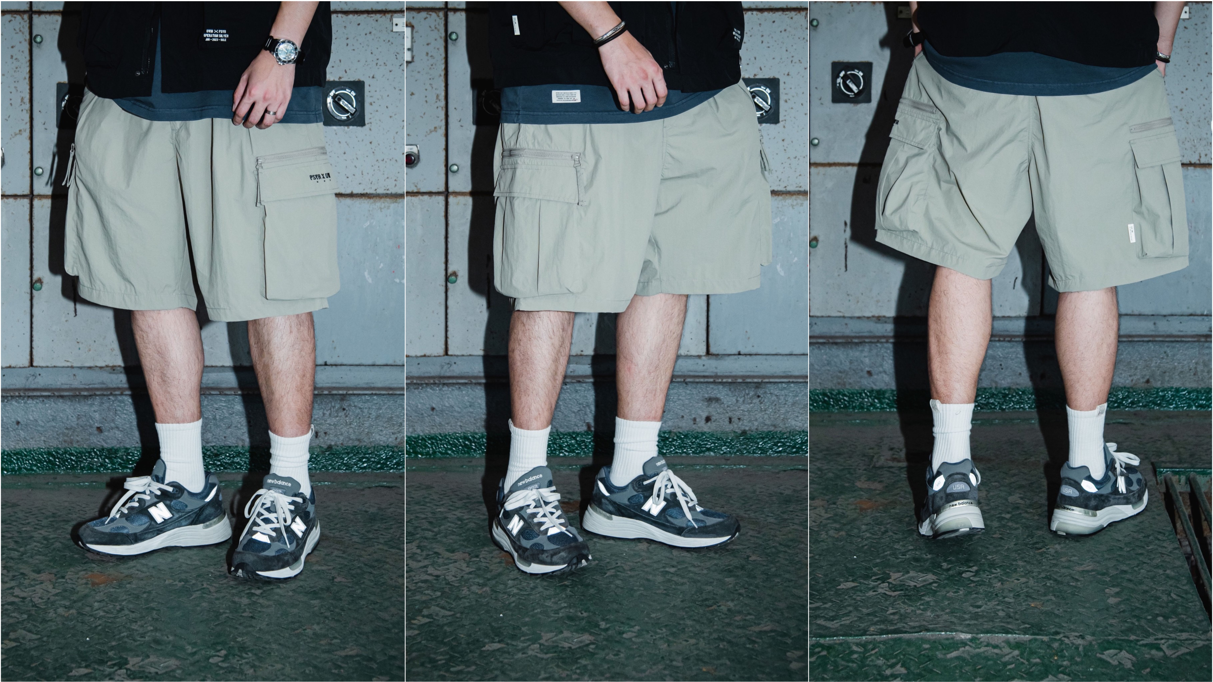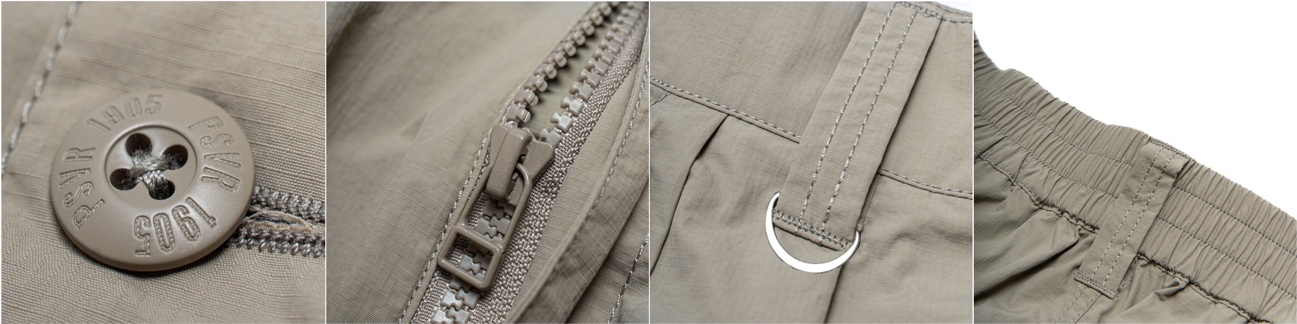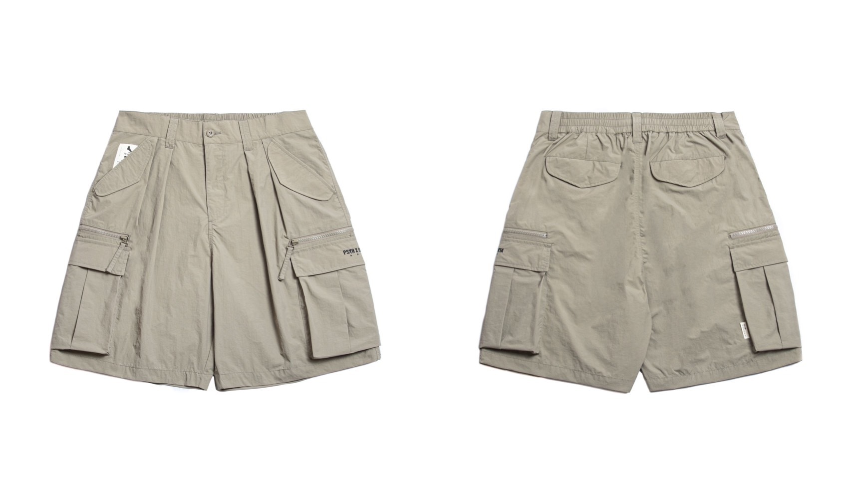 以品牌經典 T. T. G. 短褲為基礎,融入都會軍事風格概念,選用60年代末期美軍越戰所使用的輕量化抗撕裂尼龍面料,搭配上防潑水的機能性,腰間安排雙打褶線,讓整體褲型更為立體,八個口袋細節設計,提供強大的收納配置,並採用後腰圍鬆緊帶設定,使穿著時更加輕鬆便利。