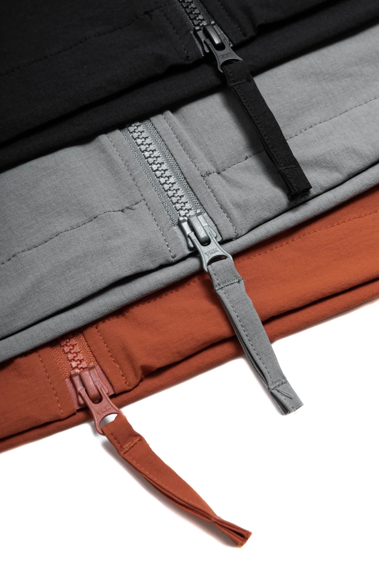 ● 輔料使用高質感的YKK消光雙拉鍊,搭配日本Sun Grip壓釦小收納袋、連帽調節扣具、袖口彈性帶,提升穿著便利度及抗風性。