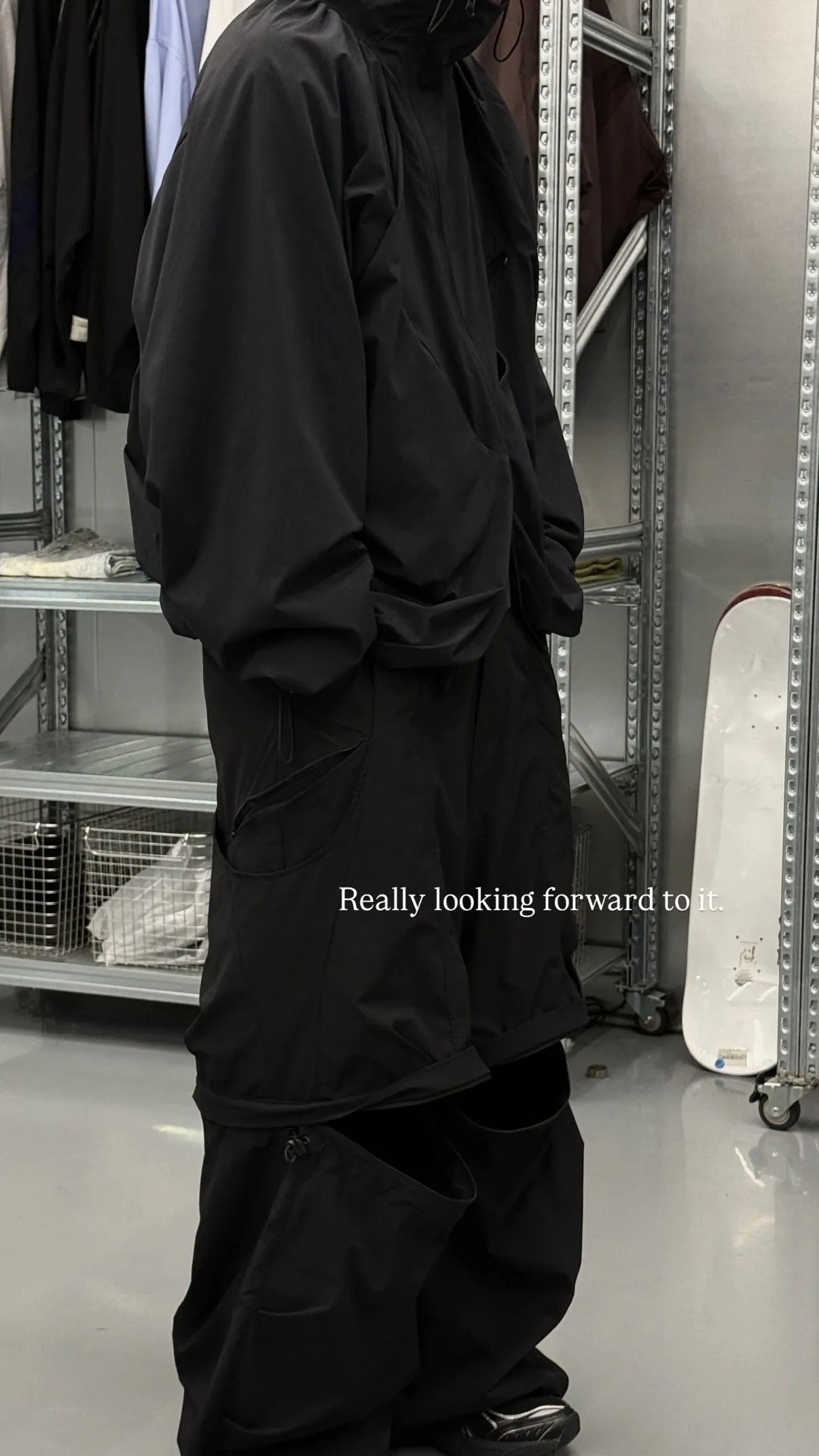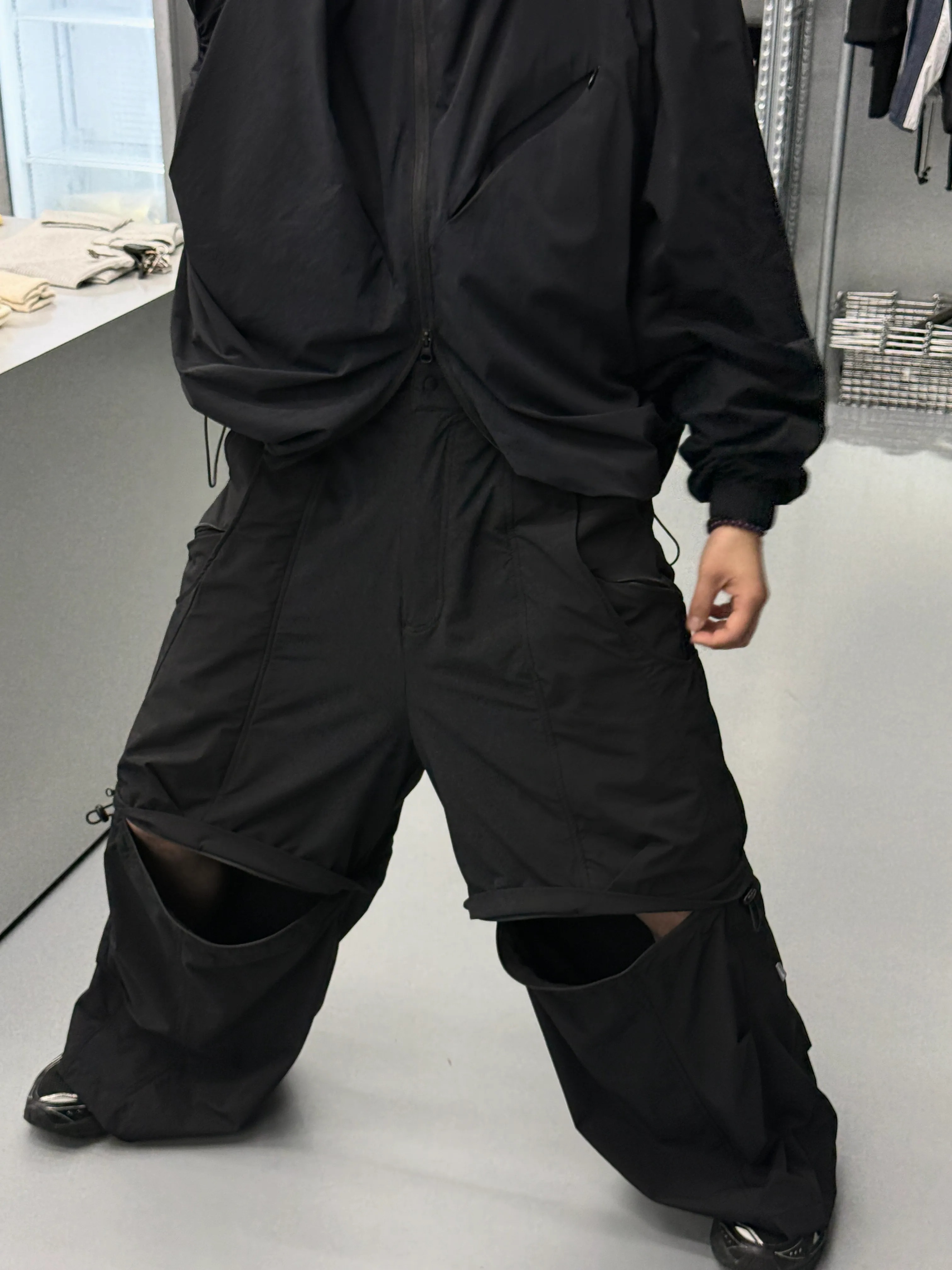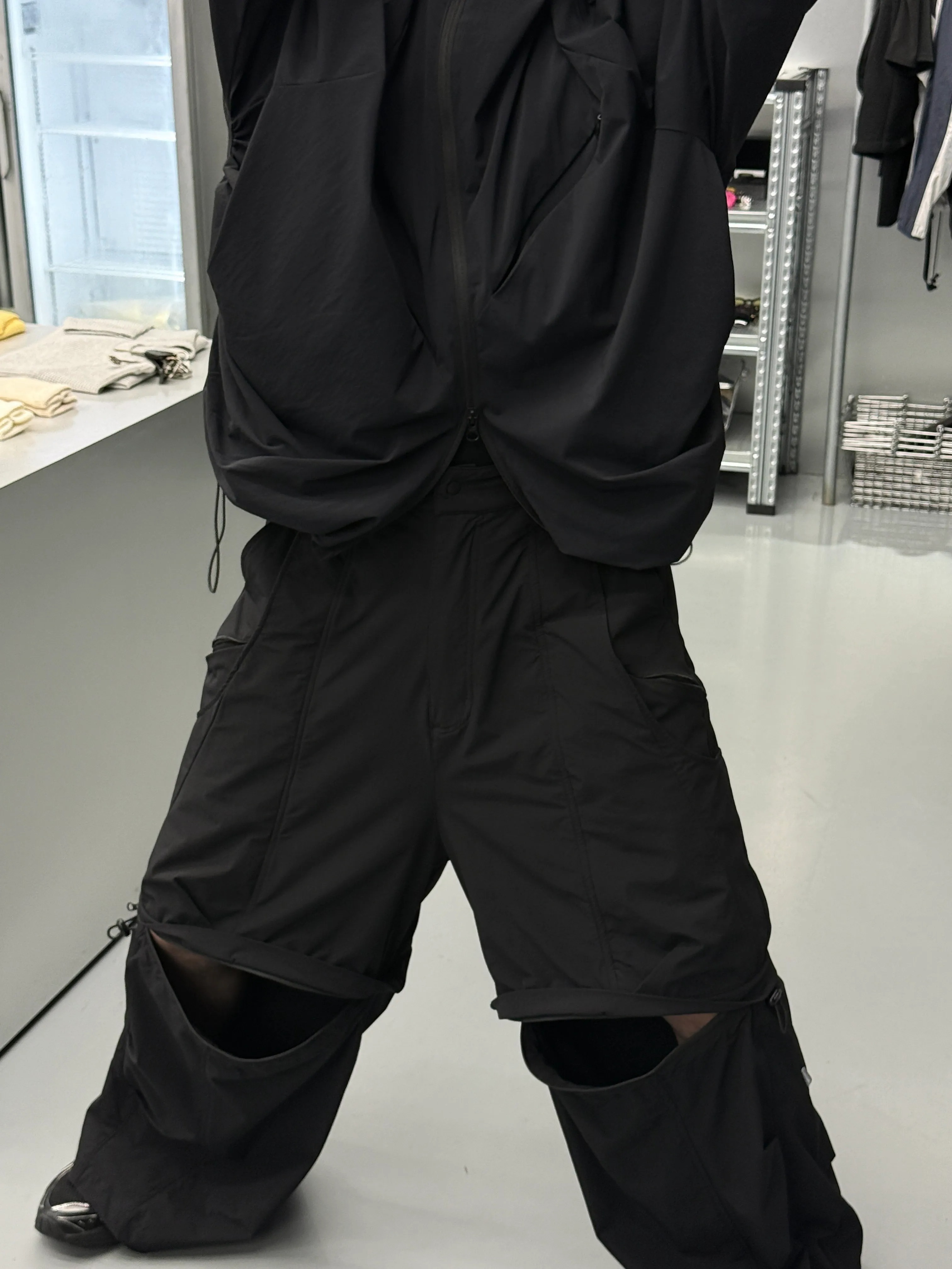 本次作品採88%Nylon以及12% Spandex舒適面料,使整體外觀更為立體,下窄下寬輪廓以及多重繁複剪裁,使得此次實驗單品兼具功能性與造型層面,供使用者自由搭配與隨意配置。此次作品特殊之處在於,我們採用「拼接解構」概念,將褲體本身置於短褲與長褲之間的作用,在膝處設計拉鍊拆解設計以及「襪套設計」,屏棄長褲拆解後下半部的無用之處,使用者可以將其透過拉環轉換成另類襪套,使得細節能成為整體造物當中的一環。在褲體本身,我們以三層口袋設計,側邊兩側的弧形剪裁帶、中層的拉鍊口袋以及內層的雙手插袋,讓功能性與線條感相輔相成,並延續SATIVASTUDIO的Urban Outfit的實驗精神。