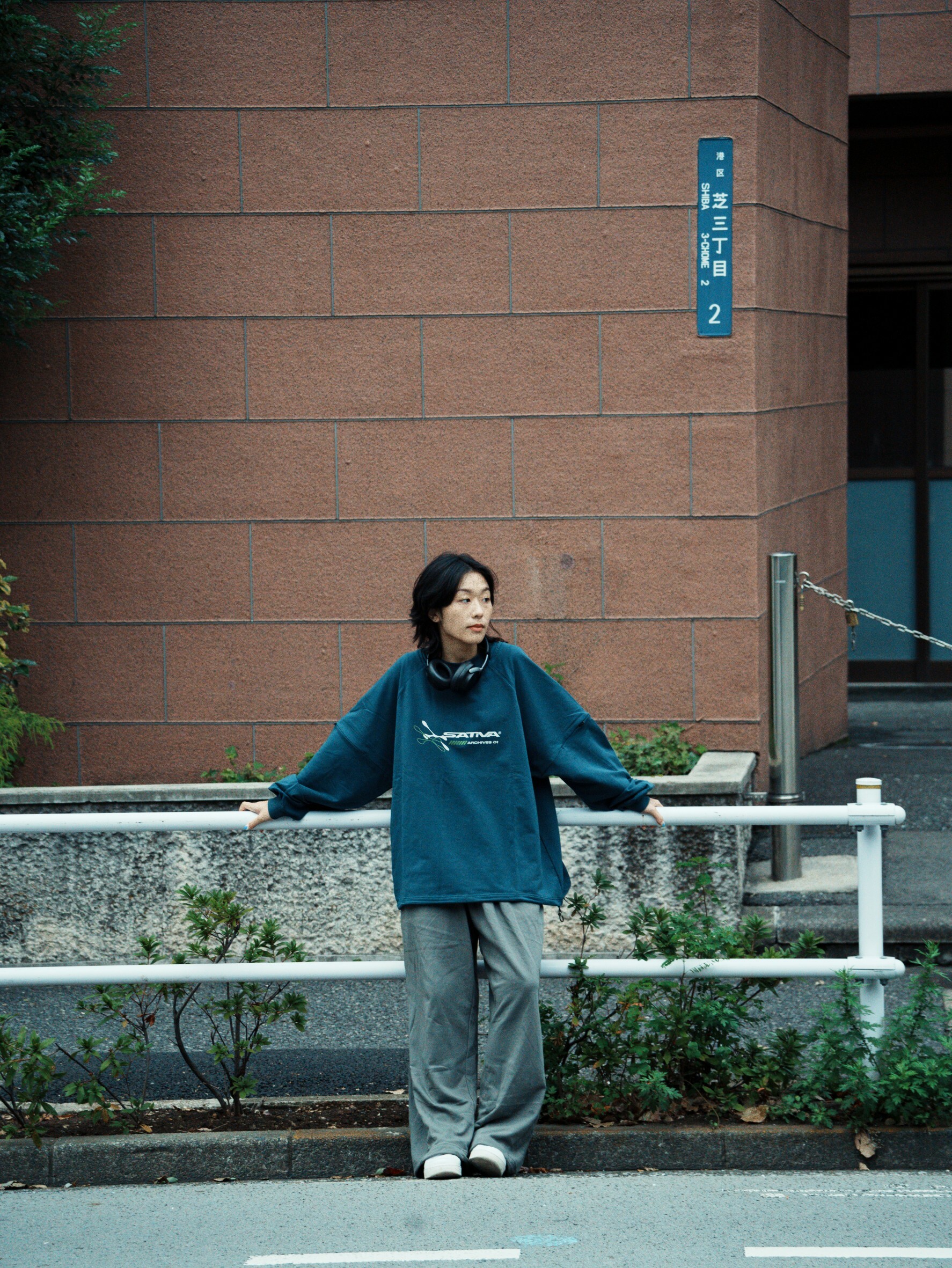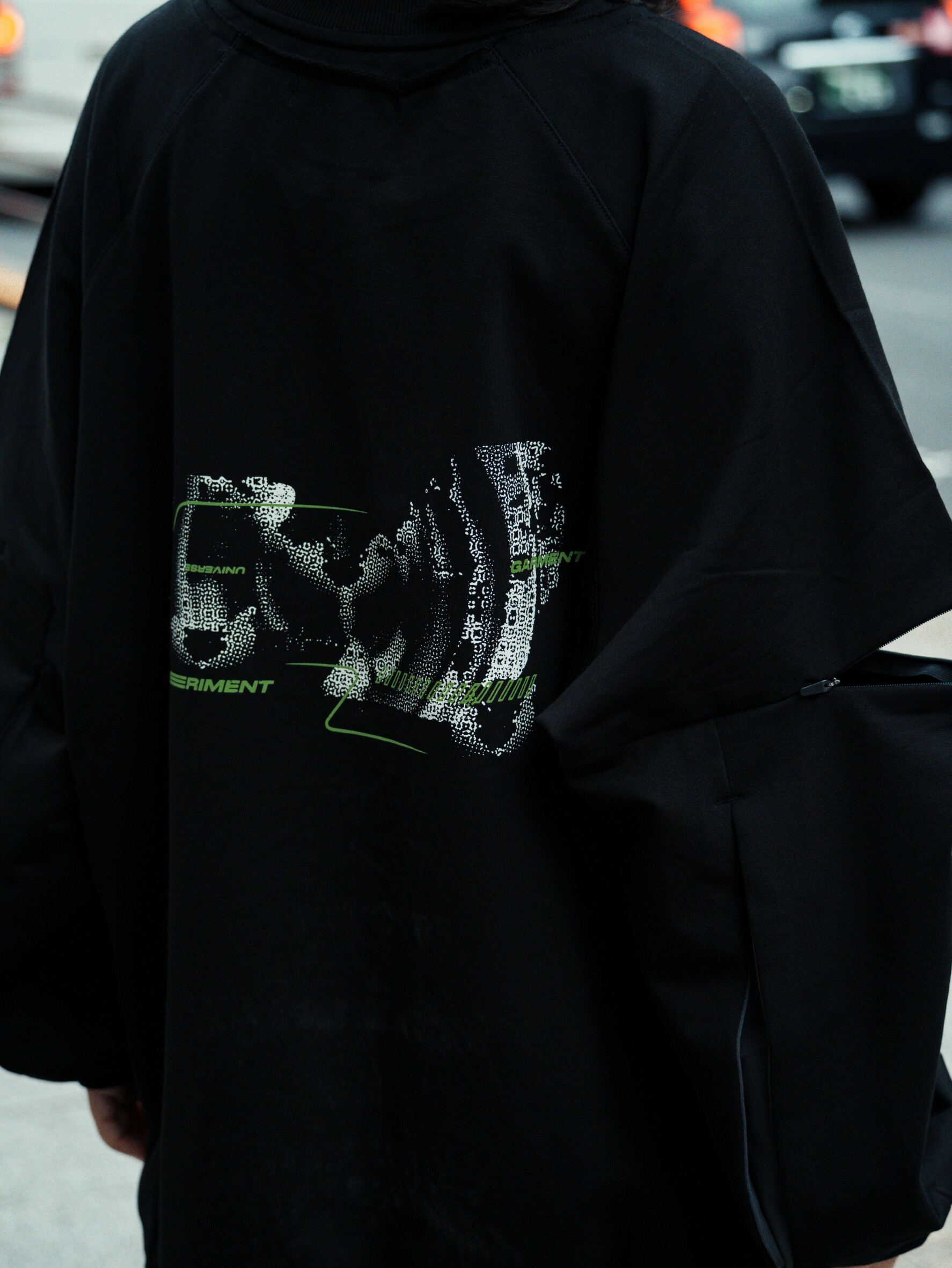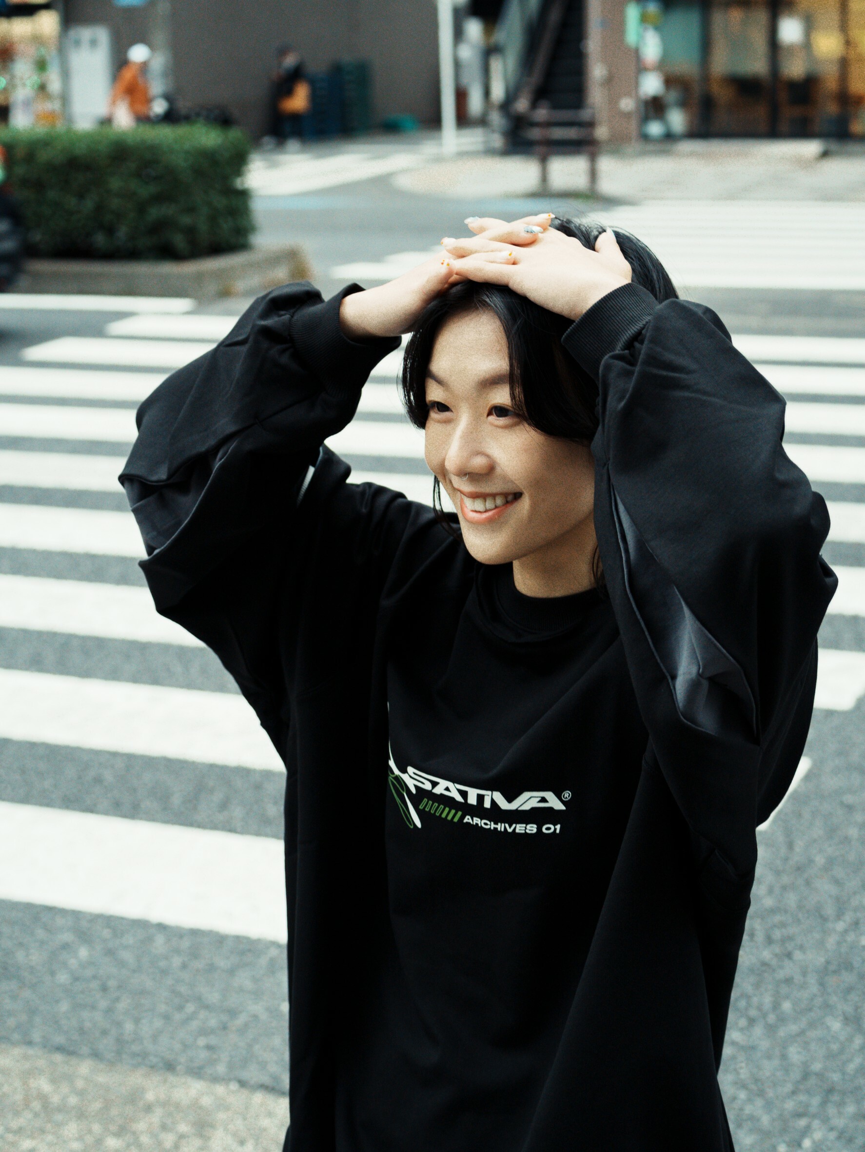 本次作品採95% Cotton與5%SP彈性纖維面料,延續“UE-X2”面料製作概念獨闢特殊剪裁,舒適觸感與彈性材質交融於一體的寬鬆版型給予穿著適性與張力需求;圓領假兩件不收編與螺紋設計形塑更加俐落與修飾的視覺效果;手袖兩處延續前作的拉鍊半雙開彈片設計,同時新增開袖層次設計,運用異材質與配色對撞形成鮮明對比與自然層次;衣襬隱藏式抽繩與升級輔具,還原動態捕捉過程並更加趨近於真實穿著感受,衣身主視覺套用速度感意象輔以後背處攝影捕捉像素過程,研擬攝影產出與建構流程。