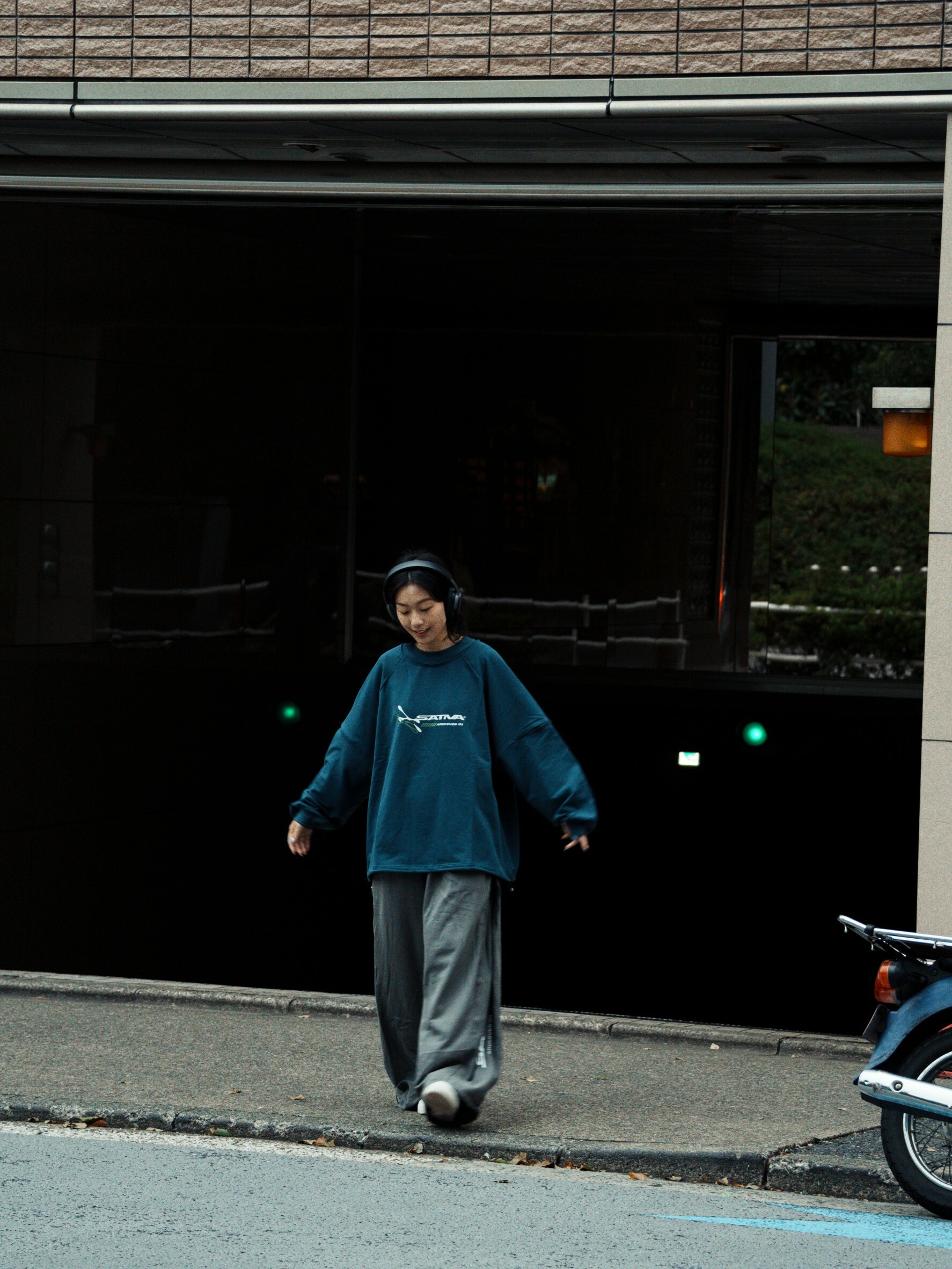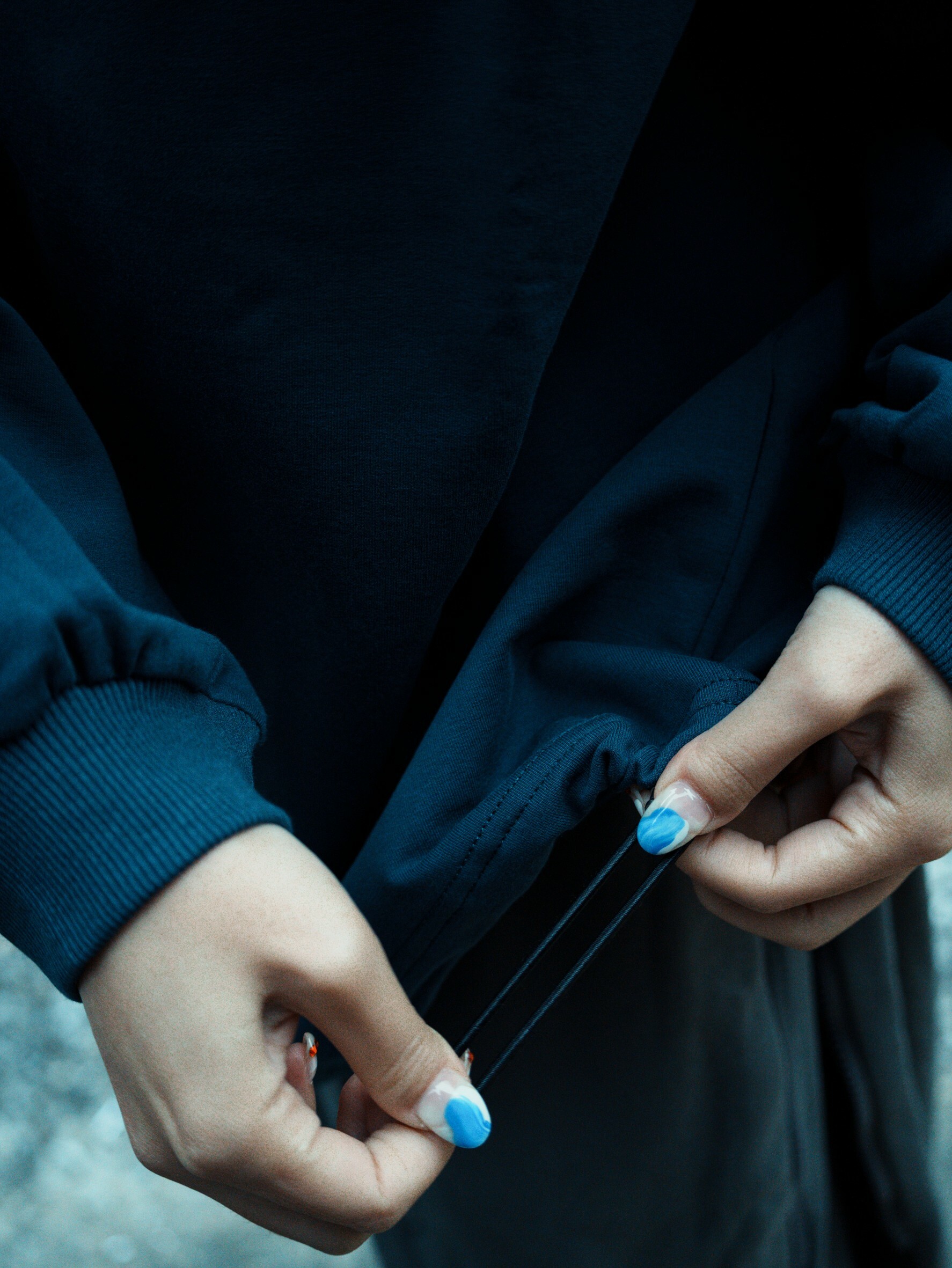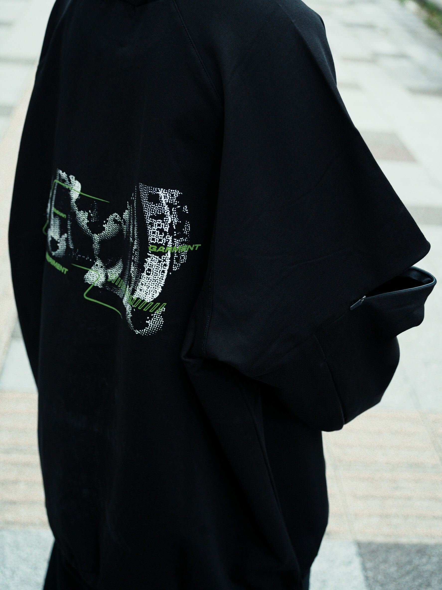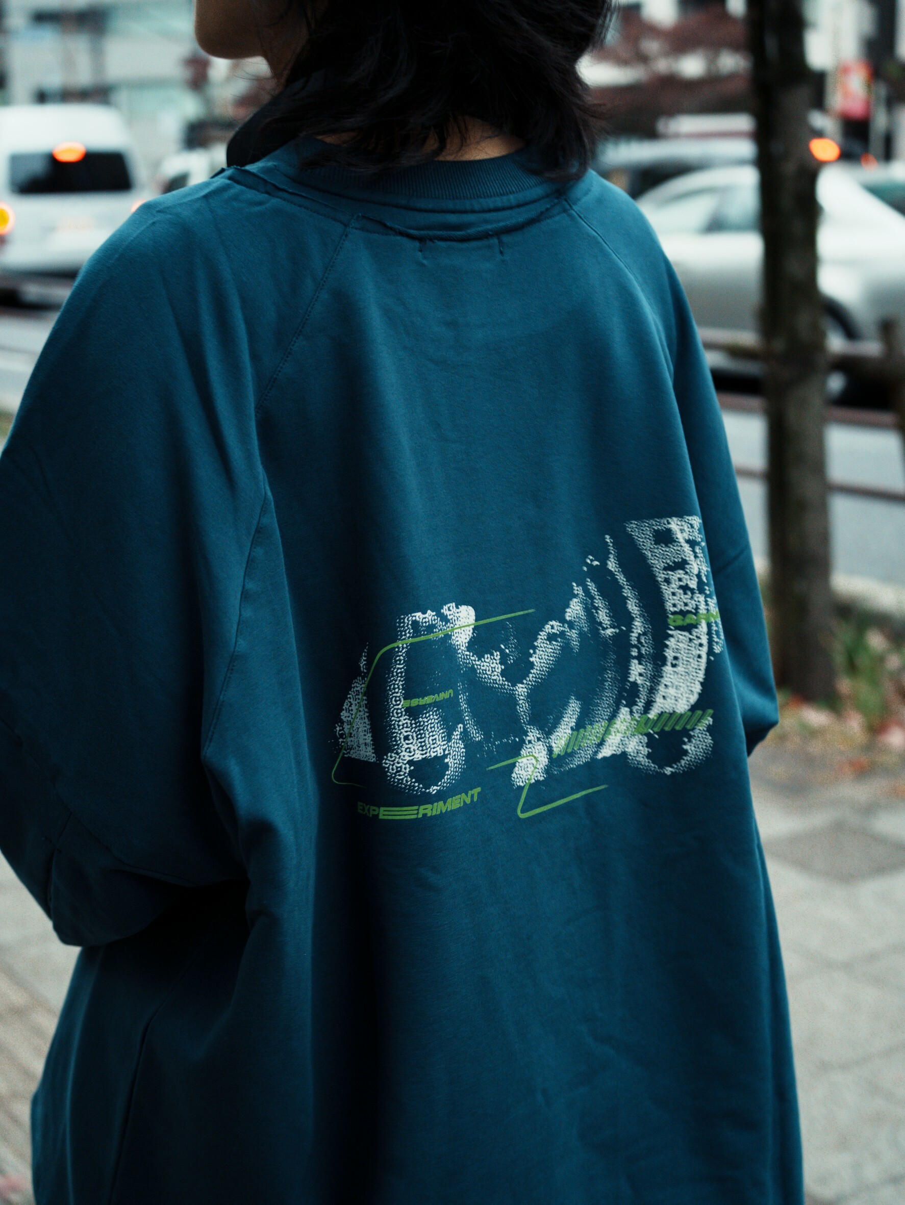 本次作品採95% Cotton與5%SP彈性纖維面料,延續“UE-X2”面料製作概念獨闢特殊剪裁,舒適觸感與彈性材質交融於一體的寬鬆版型給予穿著適性與張力需求;圓領假兩件不收編與螺紋設計形塑更加俐落與修飾的視覺效果;手袖兩處延續前作的拉鍊半雙開彈片設計,同時新增開袖層次設計,運用異材質與配色對撞形成鮮明對比與自然層次;衣襬隱藏式抽繩與升級輔具,還原動態捕捉過程並更加趨近於真實穿著感受,衣身主視覺套用速度感意象輔以後背處攝影捕捉像素過程,研擬攝影產出與建構流程。