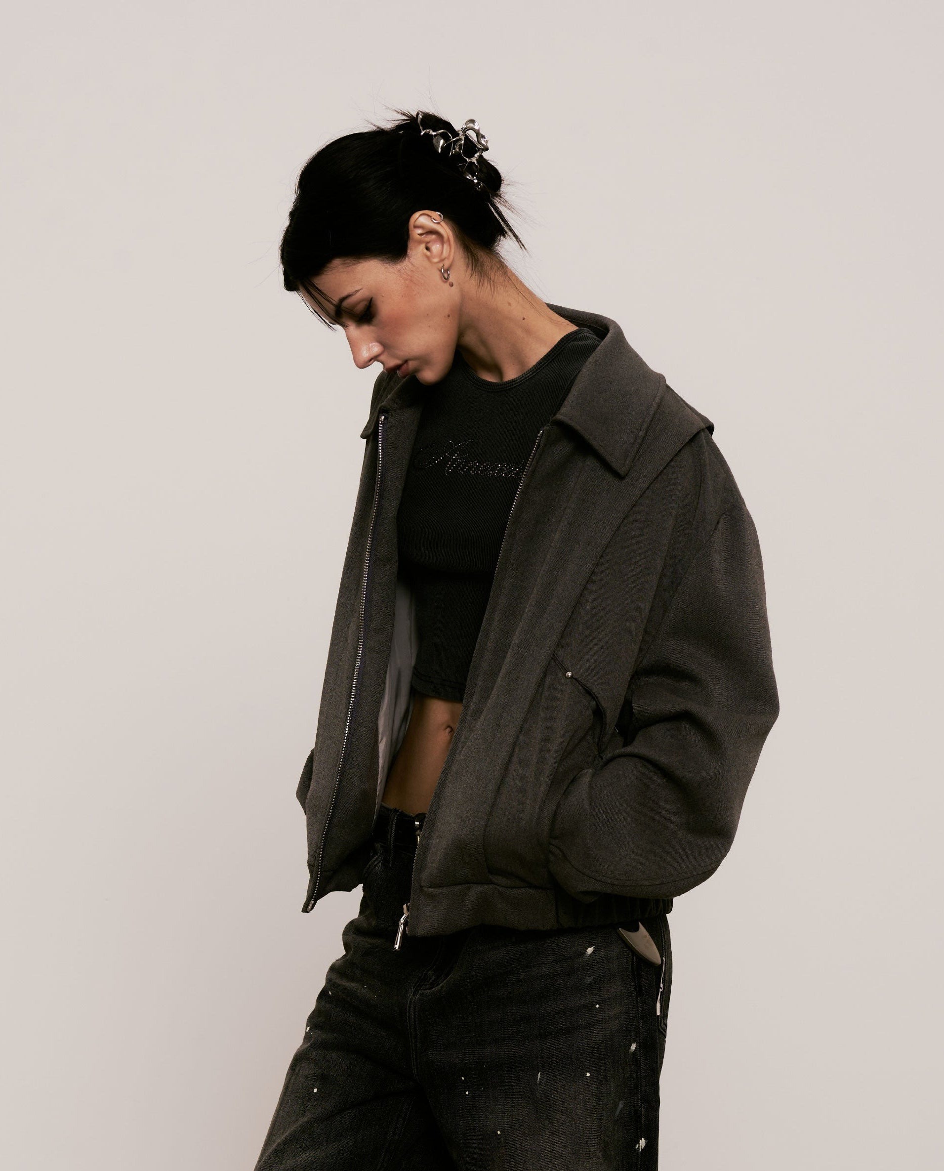 採用簡約拉鍊門襟,結合西裝外套與飛行夾克剪裁元素。
