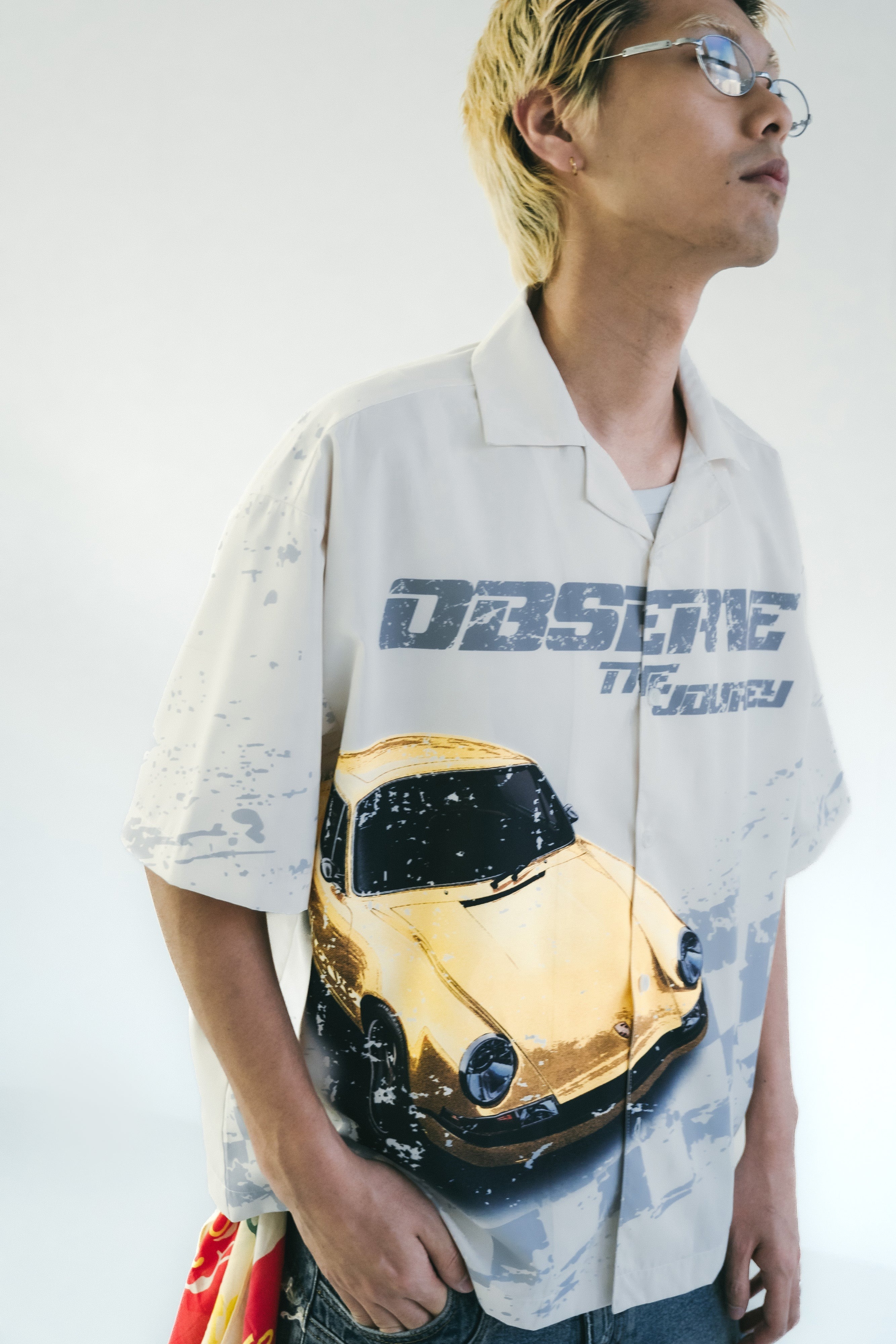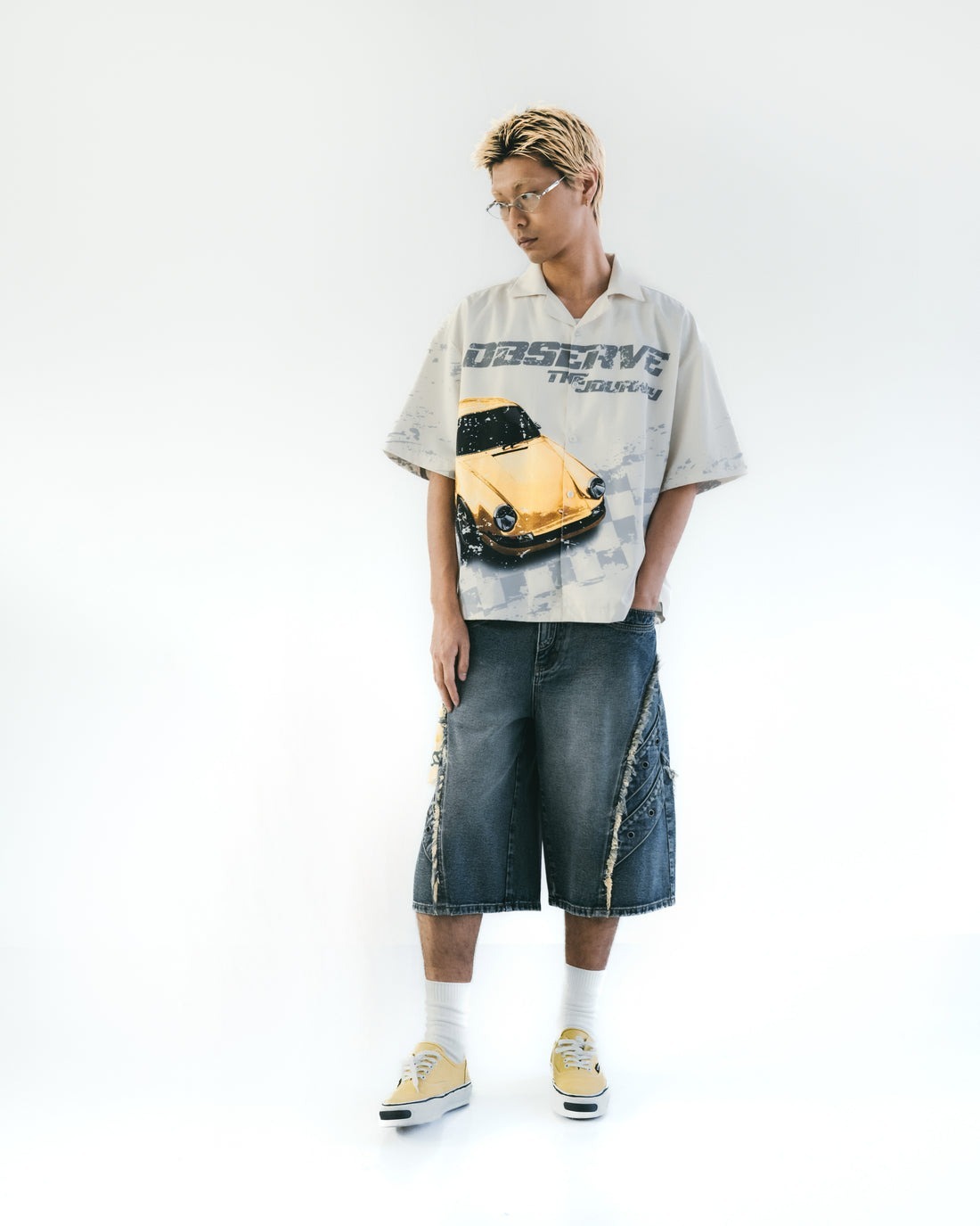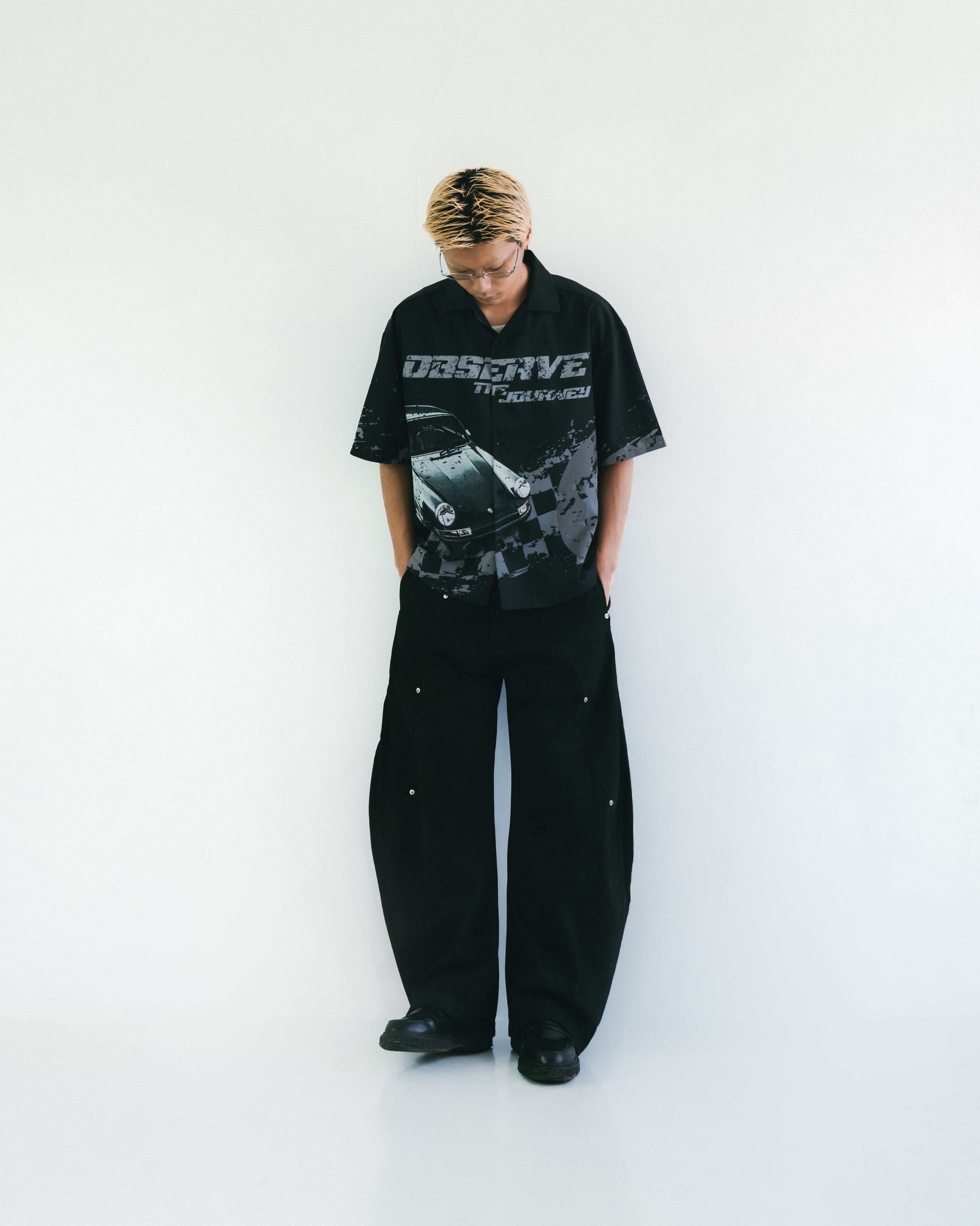 來自 SS25 DROP 2「Speed Mode」主題,本季以復古賽車文化與未來街頭感作為靈感。這款印花襯衫採用經典跑車圖像與速度旗格紋,搭配粗糙顆粒質感字樣「OBSERVE THE JOURNEY」,像是在記錄每一段通往勝利的軌跡。寬版剪裁與輕盈布料營造出鬆弛的賽道街頭氛圍,是本季主打的視覺焦點單品。