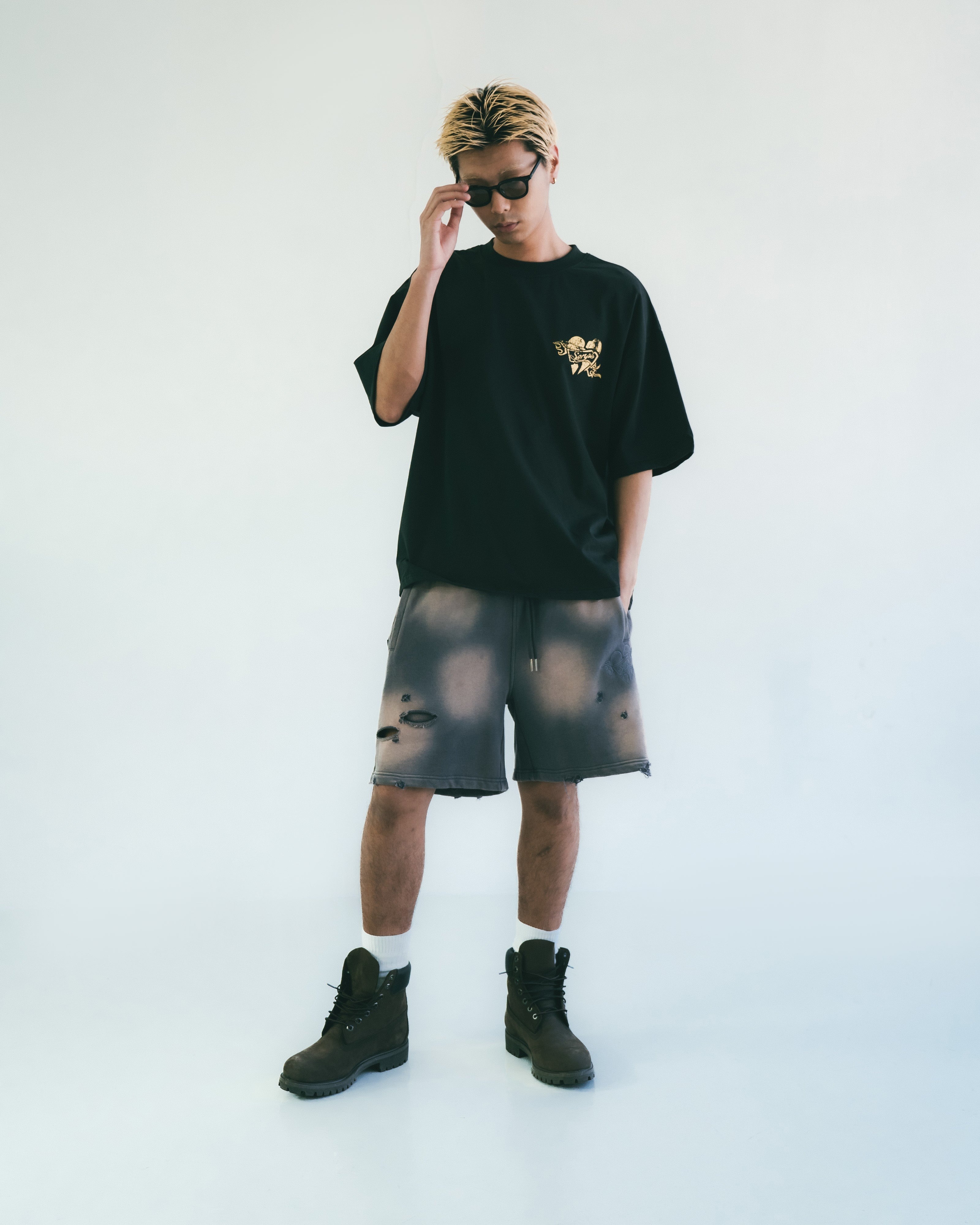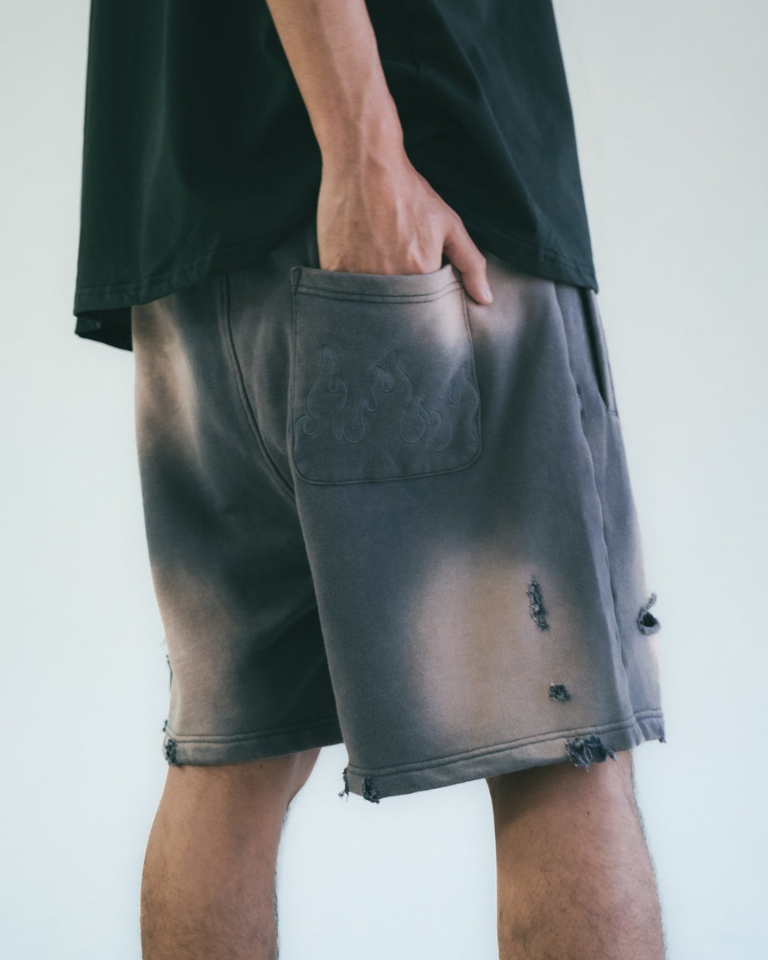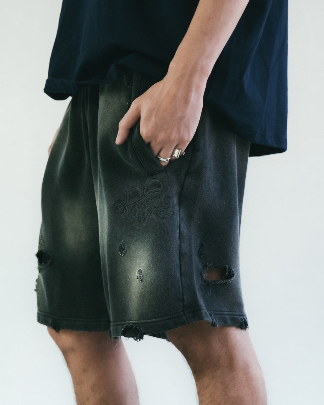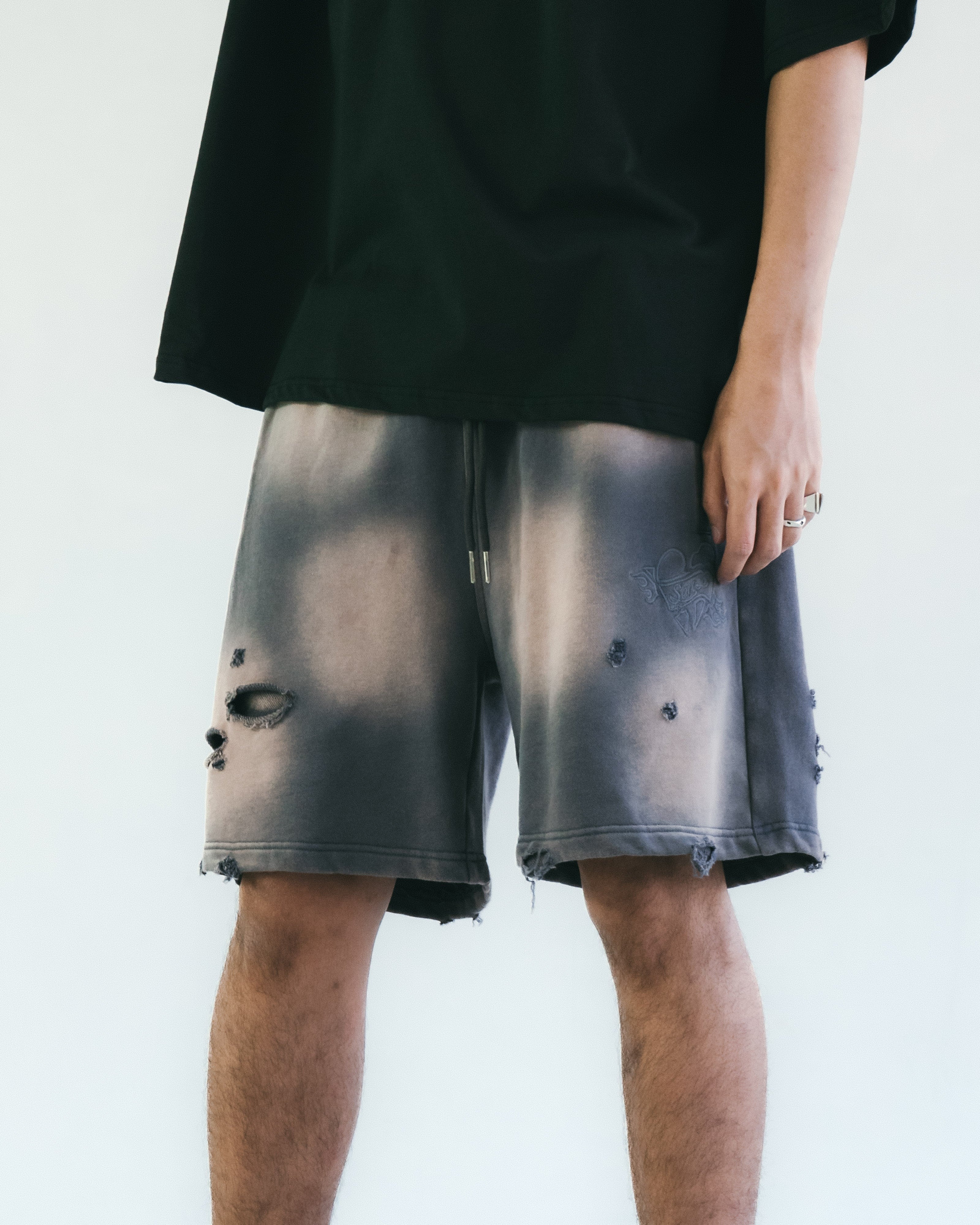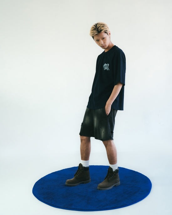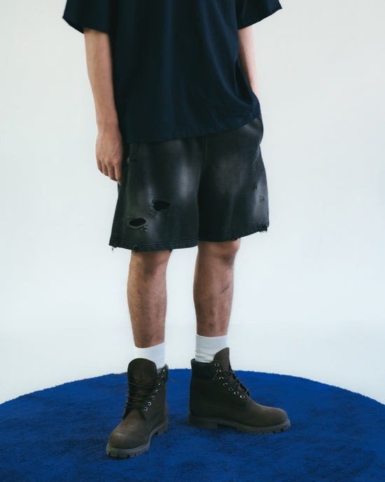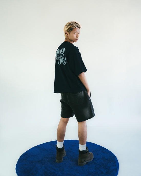 本季主打圖案「Flame Heart」以刺繡方式低調現身於褲身,象徵速度與情感之間的撞擊火花。這款棉質短褲以重洗水處理呈現強烈仿舊質感,搭配不規則破壞細節與磨邊剪裁,完整呈現街頭叛逆與 Y2K 解構美學。厚磅毛圈棉布搭配寬鬆剪裁,兼具舒適與造型張力。