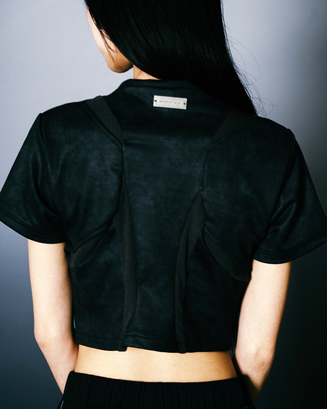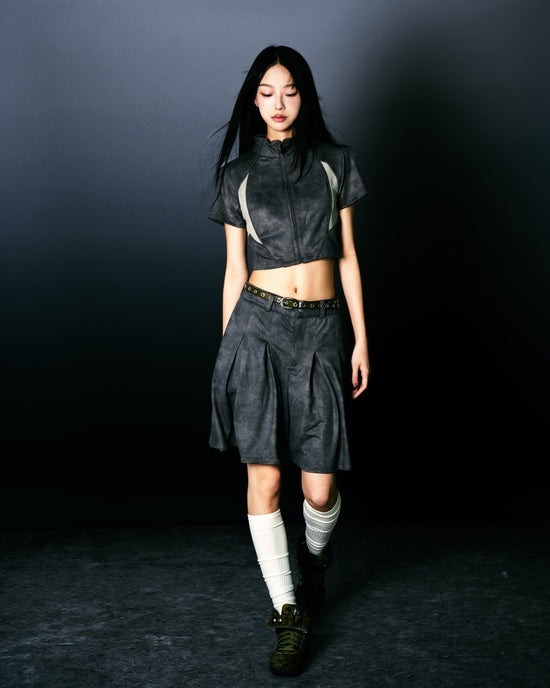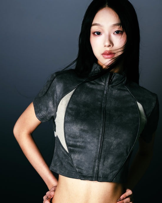 融合Y2K未來感與街頭運動風格,本款上衣選用經特殊洗水處理的挺身布料,營造低調復古質感。拼接羅紋異材質設計提升整體視覺立體感與機能氛圍。短版剪裁突顯腰線比例,極適合與高腰裙或寬褲混搭。