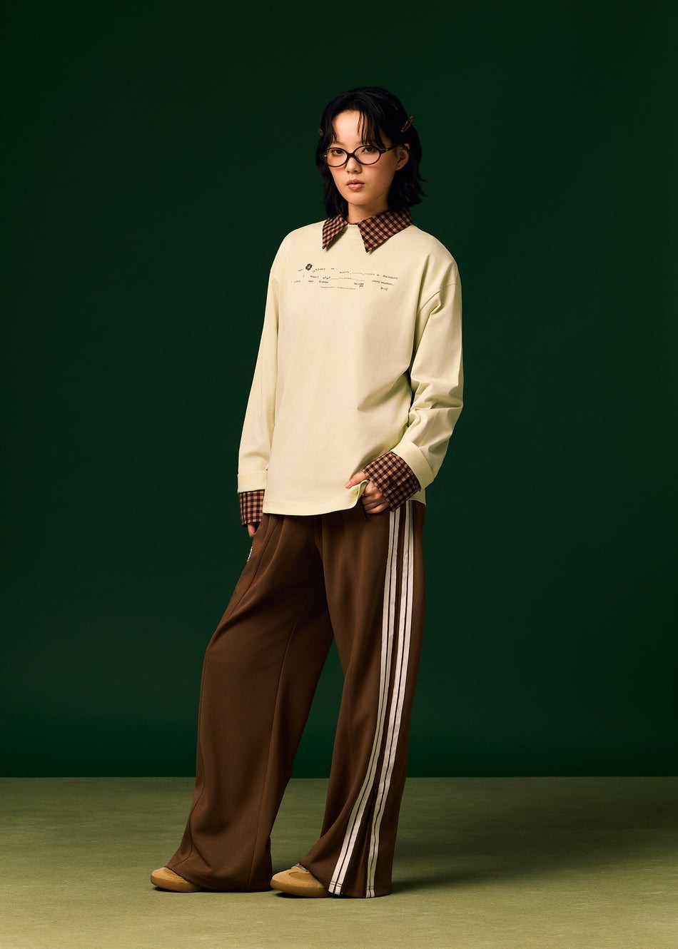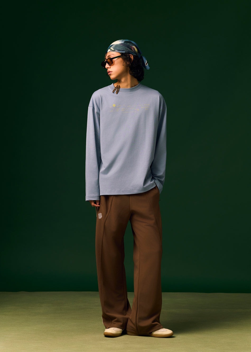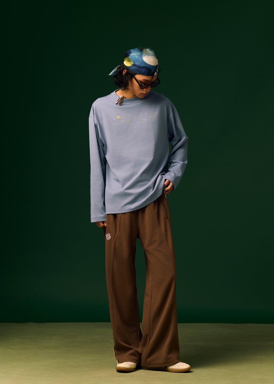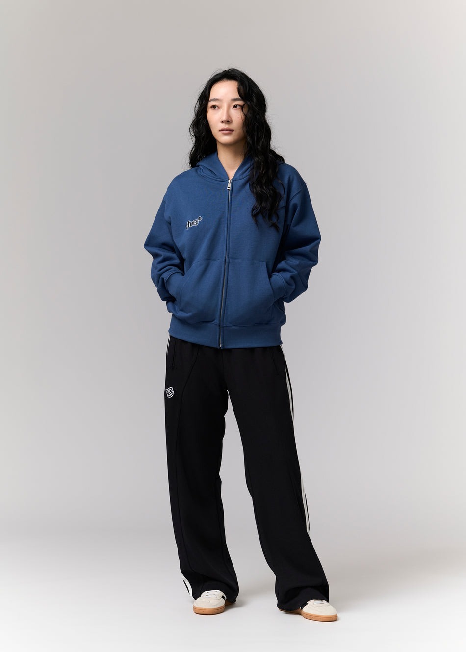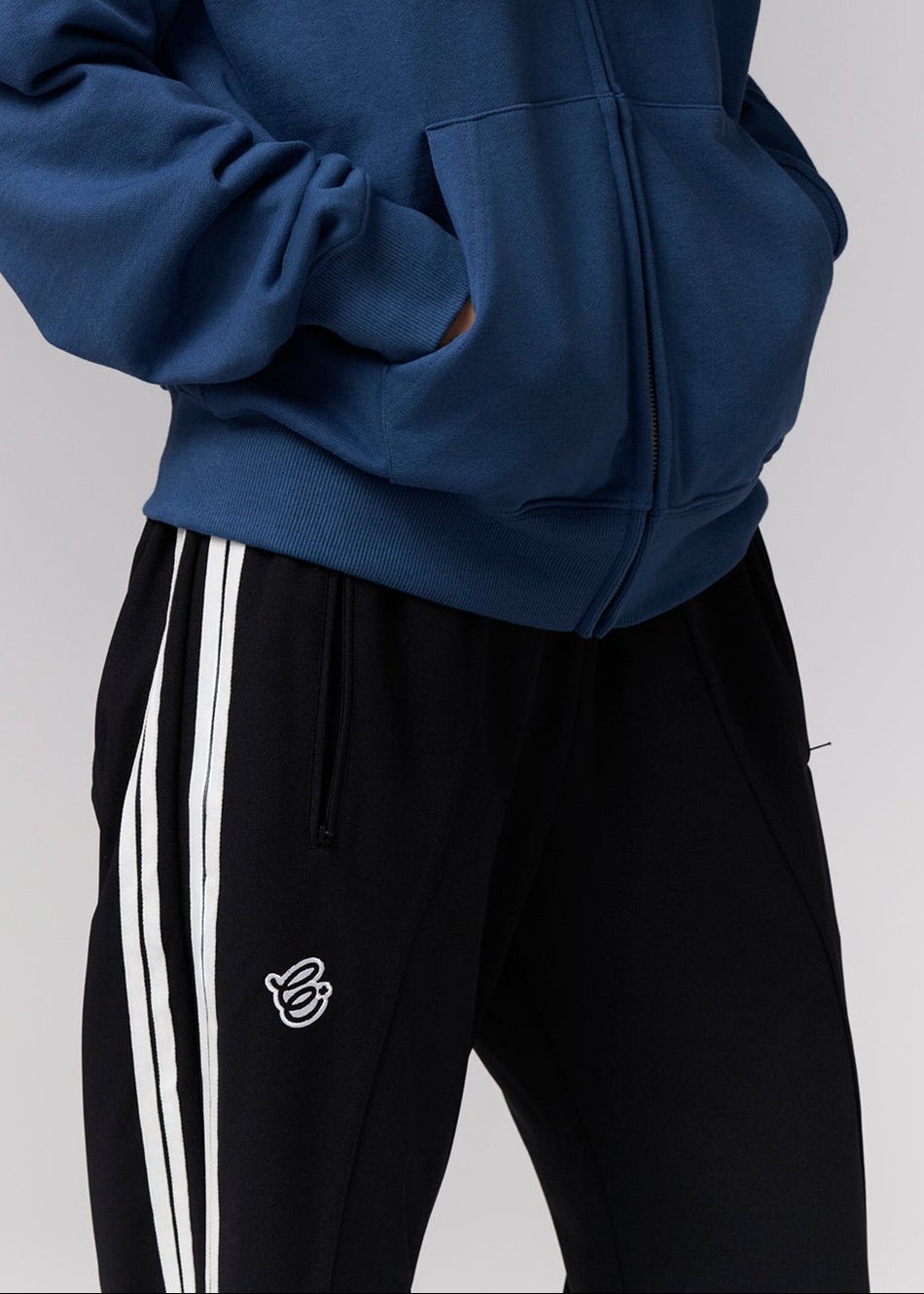 直筒運動長褲,流線剪裁設計,腳口拉鏈展開後可變寬褲版型,鬆緊褲帶