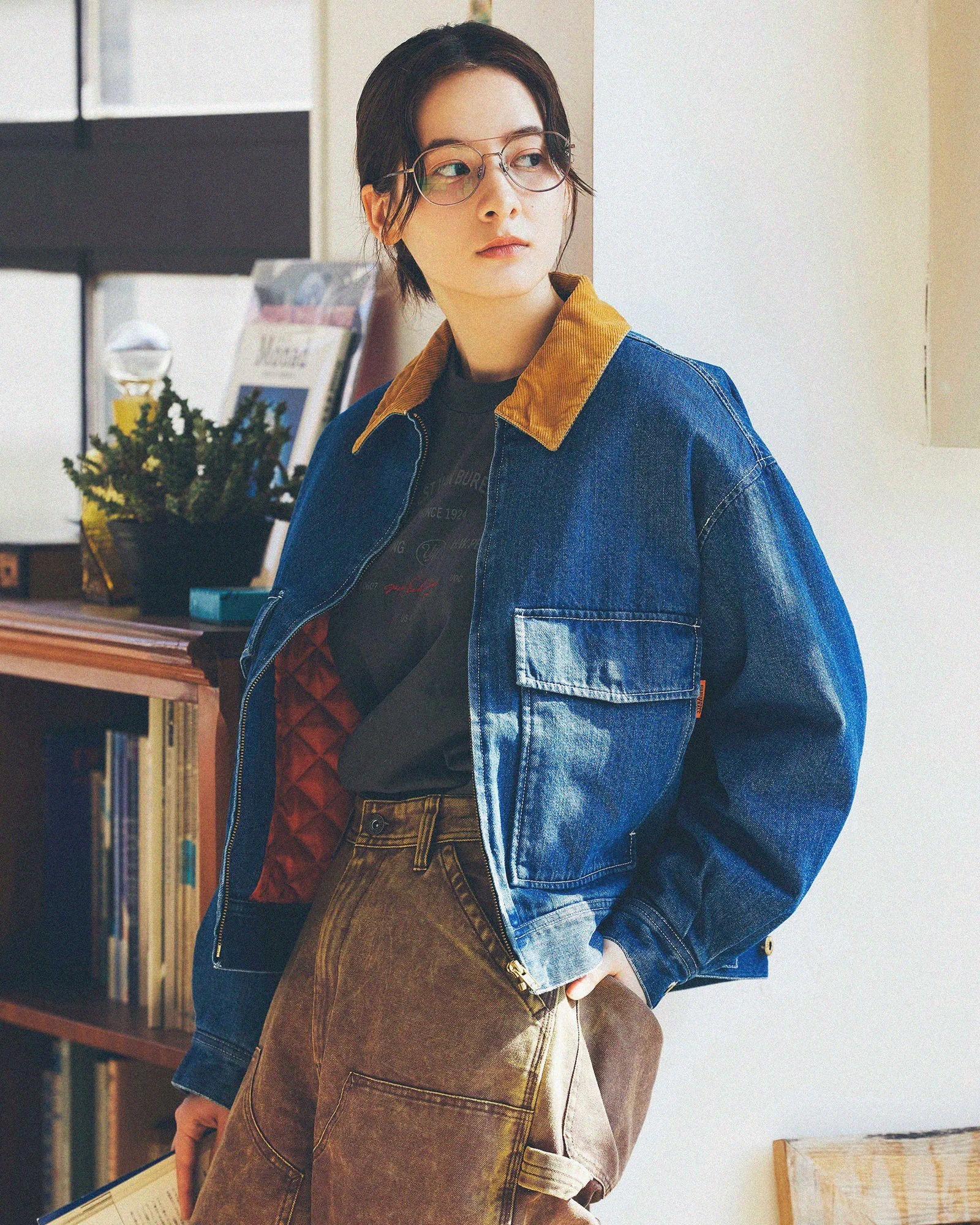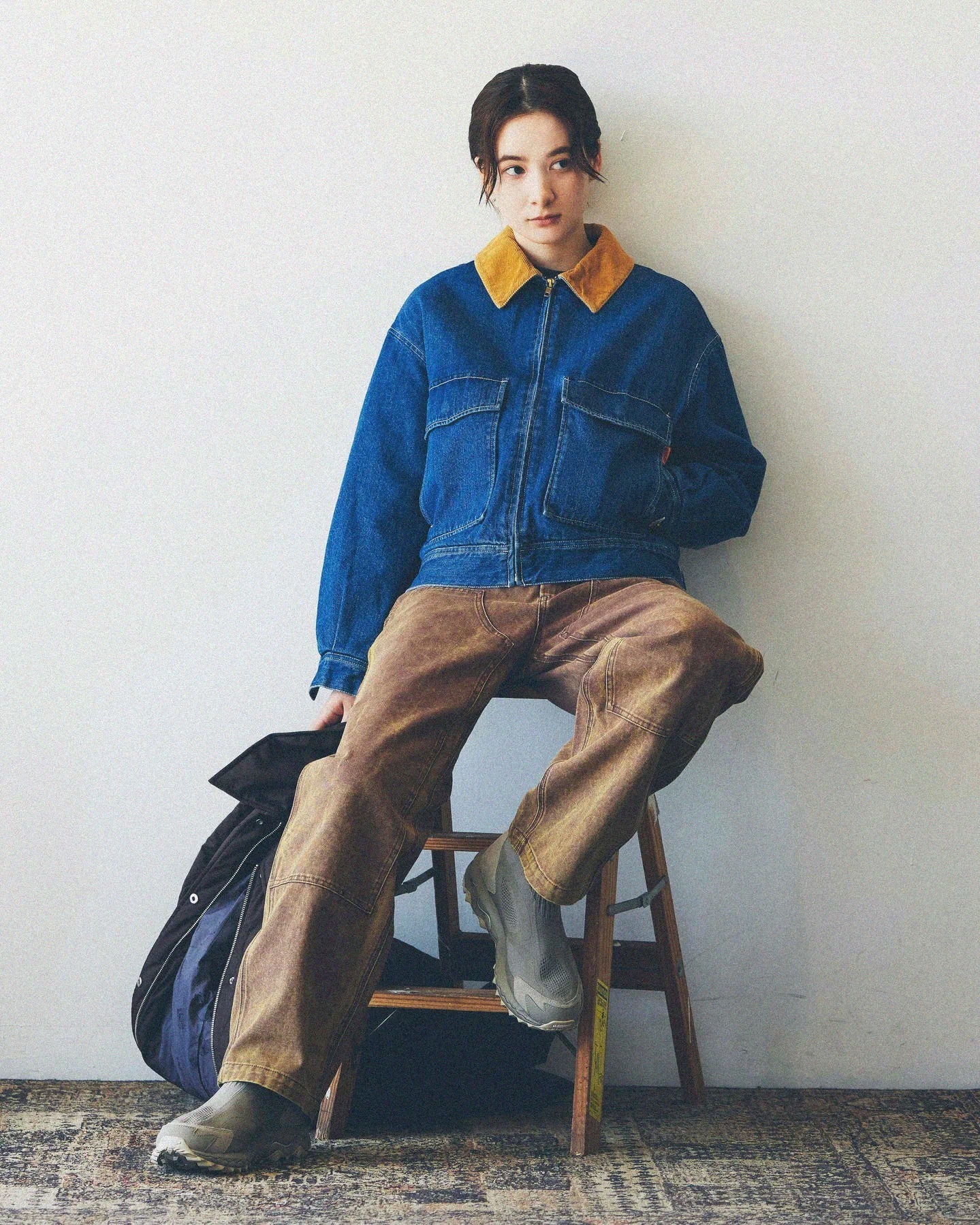 襟にコーデュロイがあしらわれ、ウエストや袖口はボタンで調節可能。